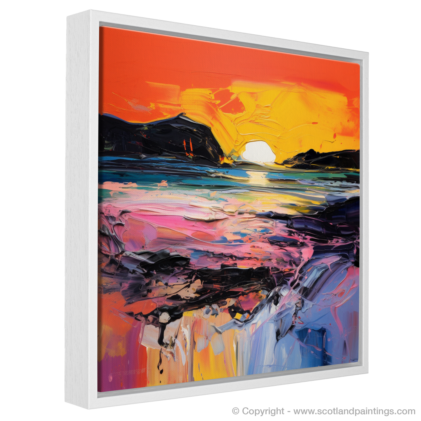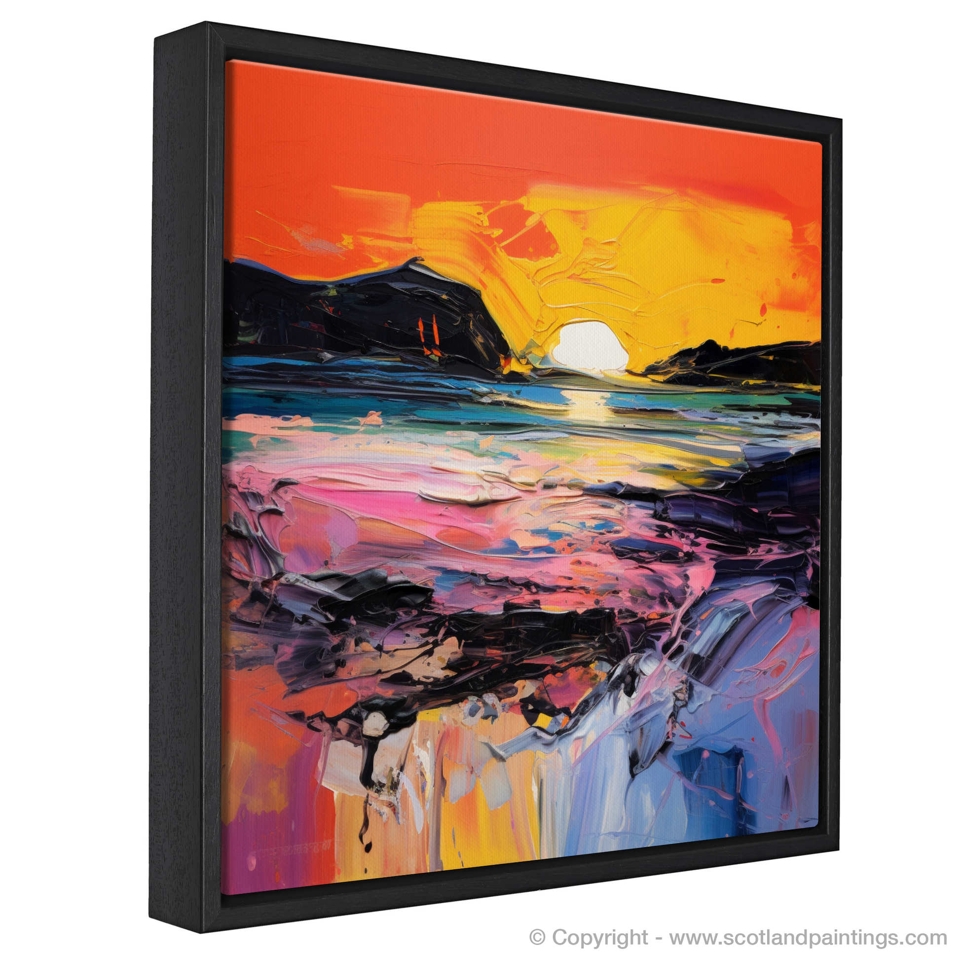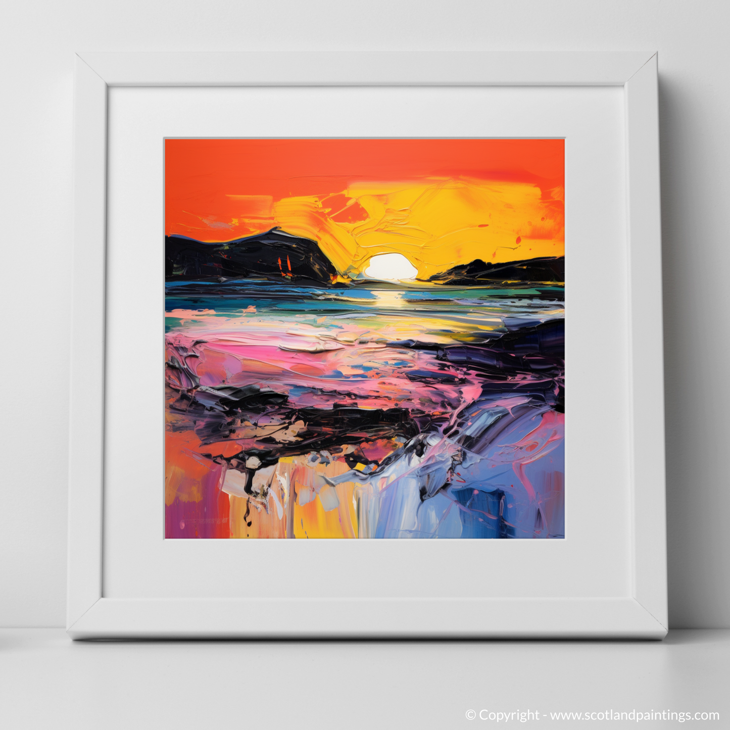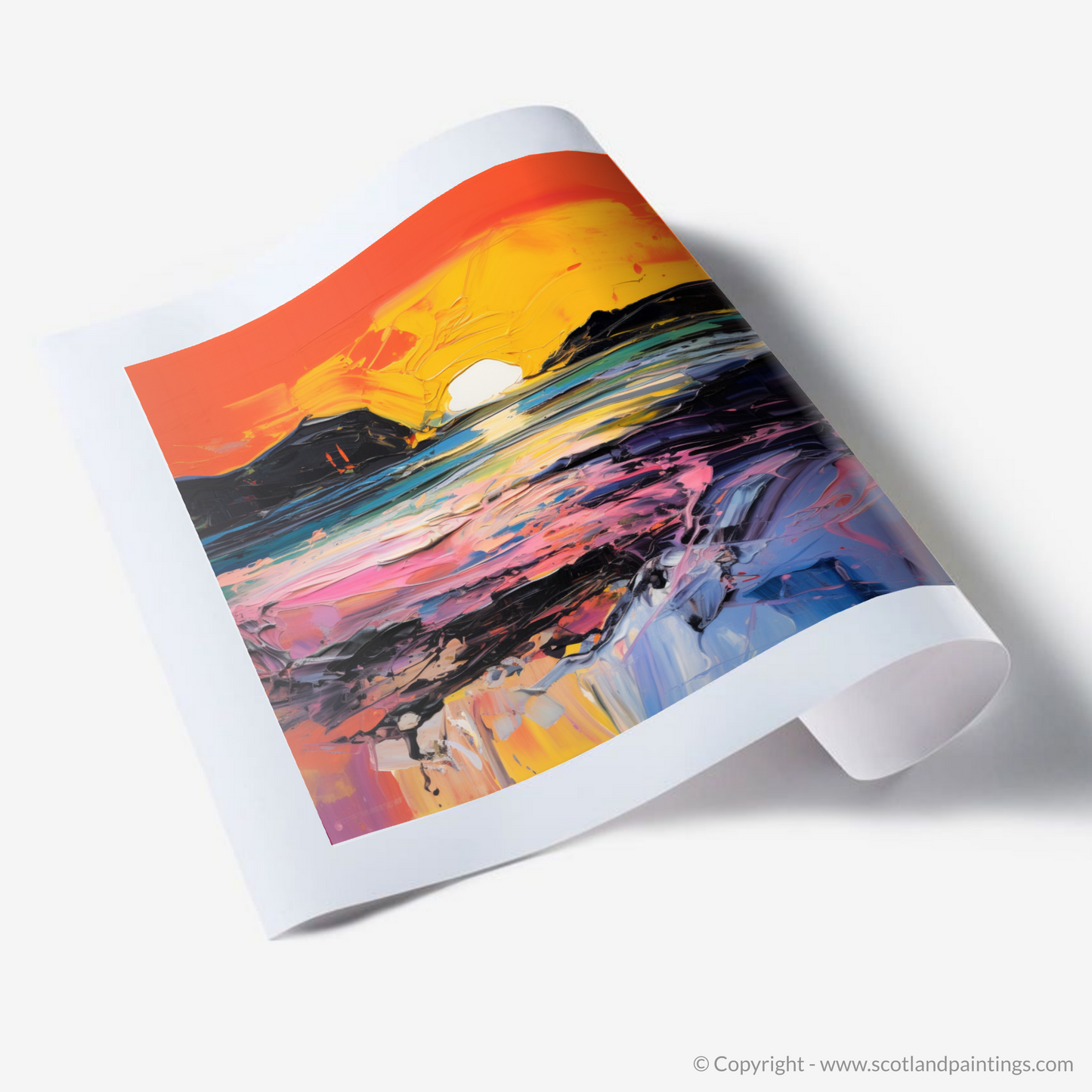 Immerse yourself in the fervent beauty of Seilebost Beach, captured in an enthralling crescendo of colour and emotion. This vivacious Abstract Expressionist print draws you into the heart of a Scottish sunset, where the boundary between sky and sea blurs in a passionate symphony of hues.