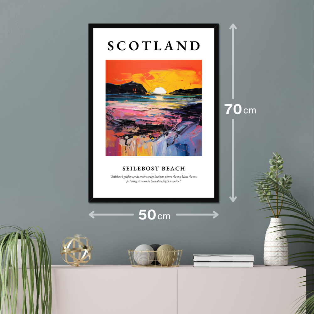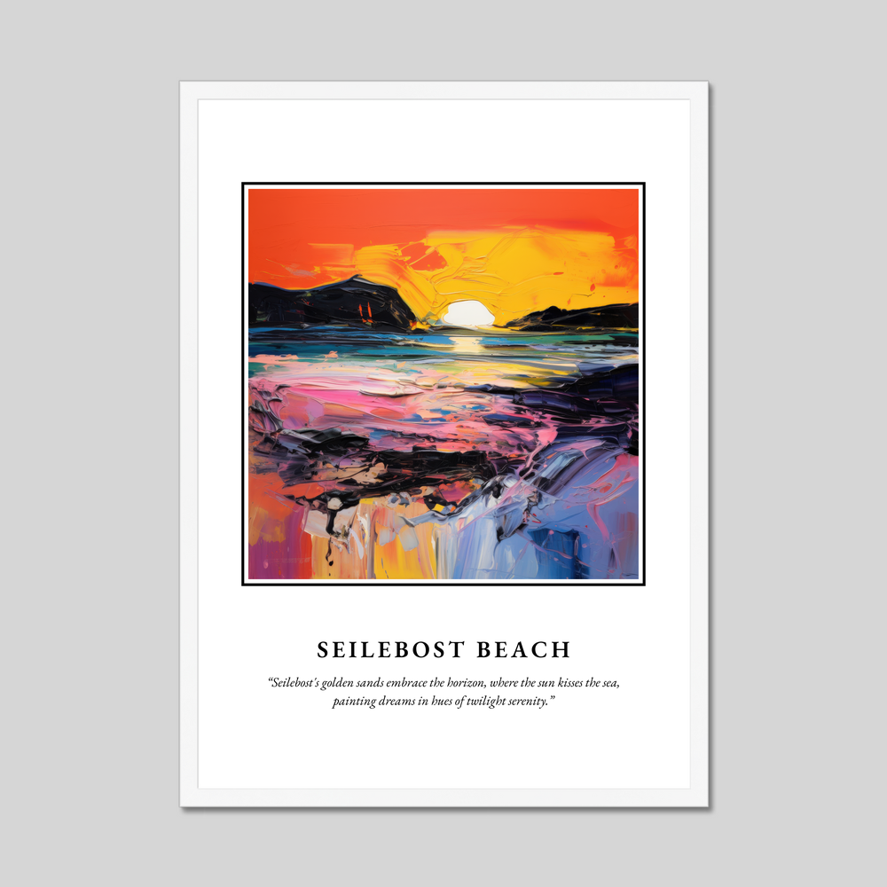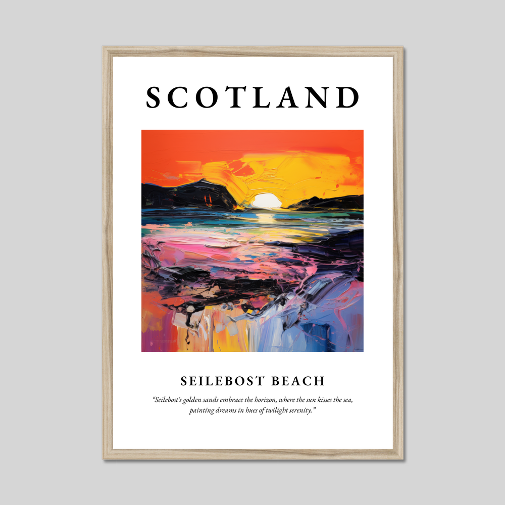 Seilebost Beach, located on the Isle of Harris in Scotland, is renowned for its expansive golden sands and breathtaking views. It's a place where the natural world takes centre stage, offering visitors a slice of untouched paradise. The sunset over Seilebost is a sight to behold, where the sky transforms into a dazzling palette of vibrant hues, a scene beautifully captured in our artwork. Whether you've strolled along its shores, dream of visiting, or simply admire its wild Scottish charm, this poster serves as a wonderful tribute to one of Scotland's most cherished beaches.