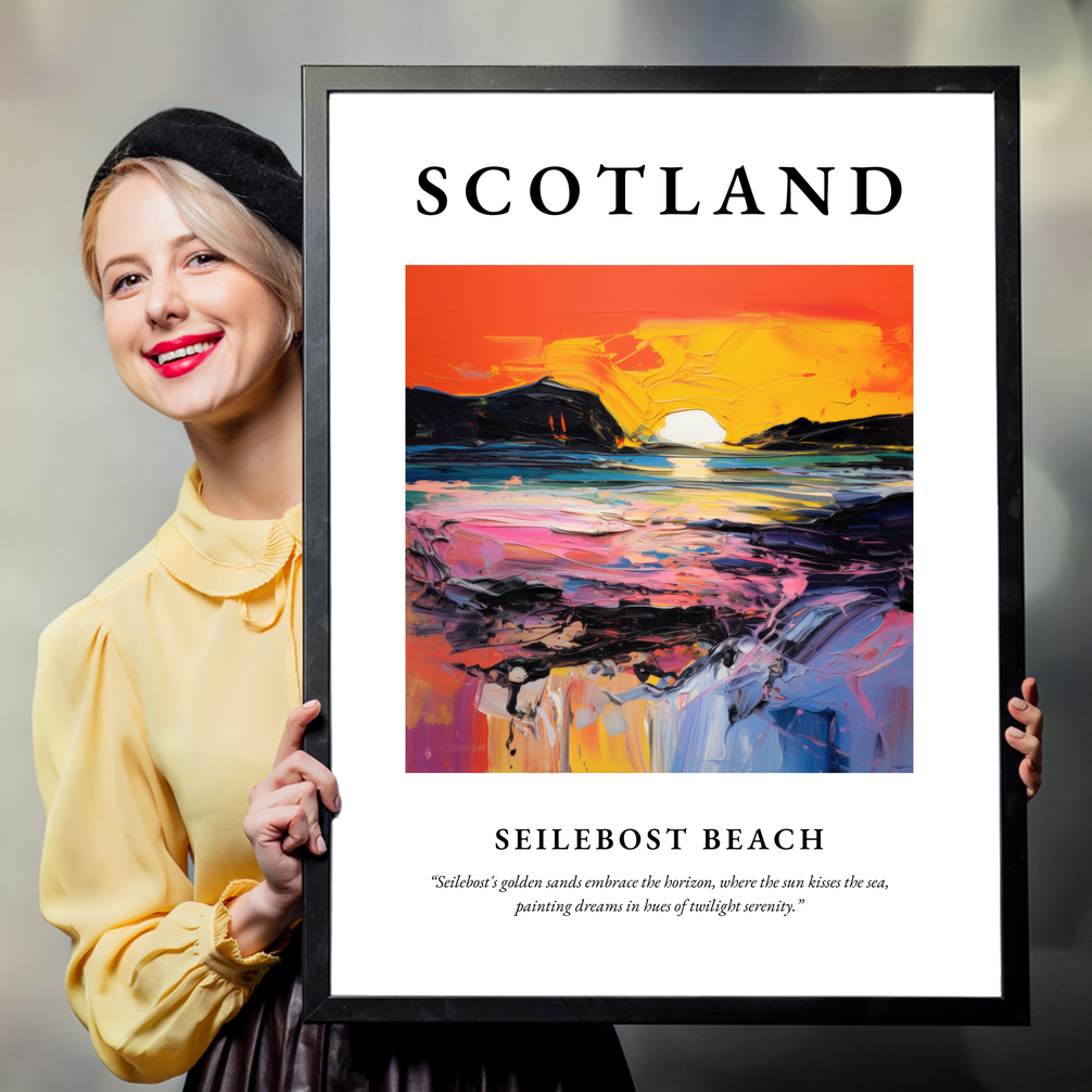 The poster prominently features the word "SCOTLAND" in bold letters, drawing you into a captivating abstract expressionist painting of Seilebost Beach. This artwork evokes a dreamlike quality with its vibrant sweeps of colour. The golden sands appear to shimmer beneath an intense sunset, where fiery oranges and soft pinks melt into the tranquil blues of the sea. The expressive brushstrokes capture both the dynamic motion of waves and the serene horizon, inviting viewers to lose themselves in a canvas of twilight serenity.