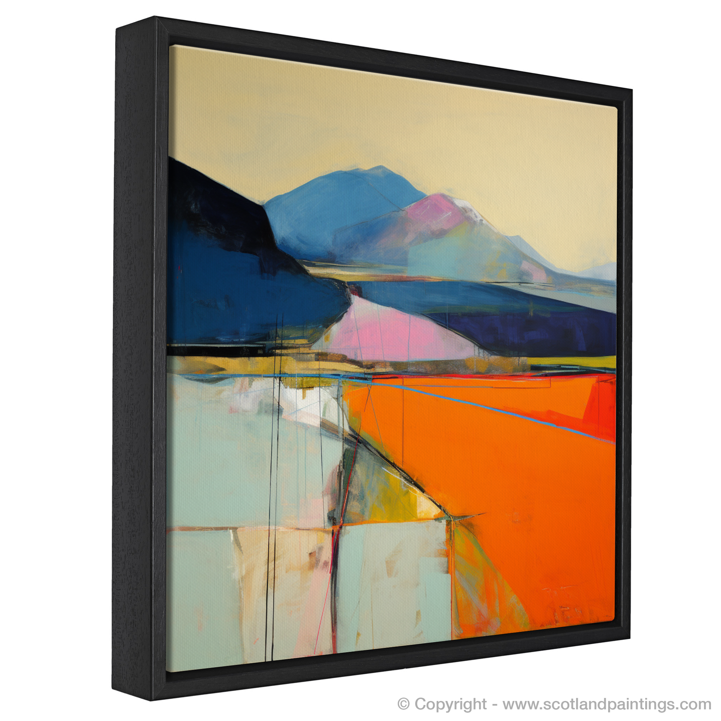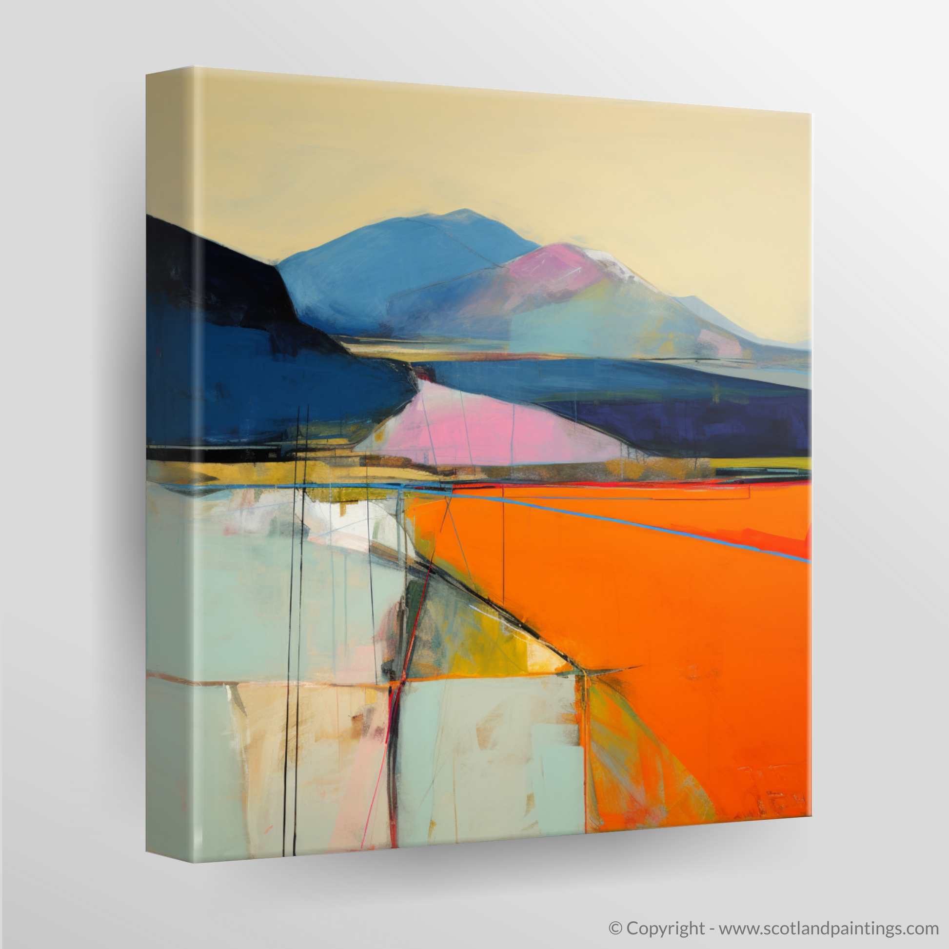As your eyes traverse the canvas, they are met with a vibrant juxtaposition of colors; bold oranges and fiery reds infuse the lower half, reminiscent of the warmth and passion that the Scottish highlands evoke. This fierce dynamism is contrasted beautifully by the cool serenity of blues and purples that dance across the upper portion, evoking the shifting mists and tranquil skies crowning the mountain.