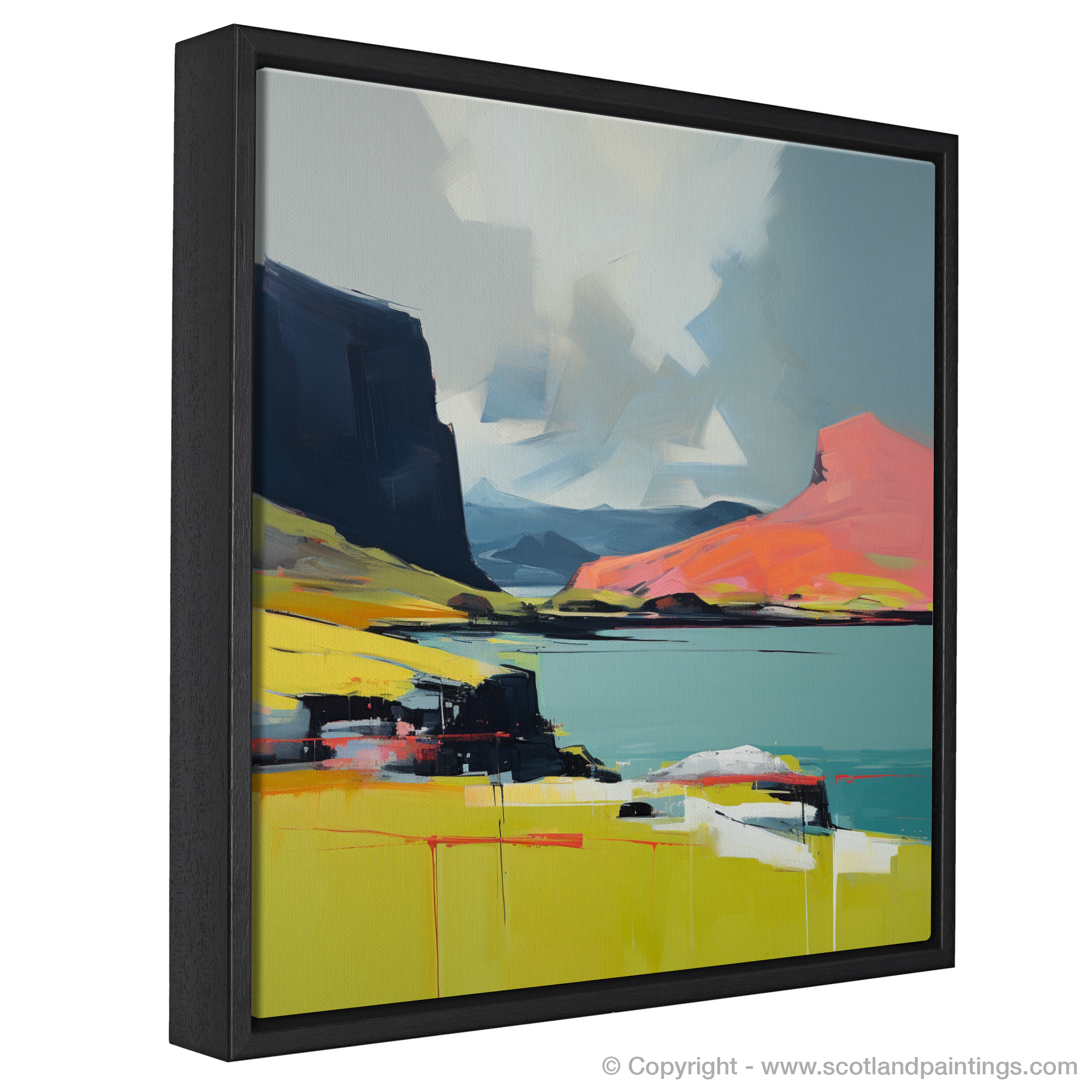 The contrast between the rich blacks and deep blues synonymous with the imposing cliffs and the serene blue of the watery expanse encapsulates the natural drama of this coastal gem. With swathes of bright yellows and oranges, the print brings to life the untamed heather and gorse that sprinkle the island, reflecting the brilliant hues of Skye at the height of summer.
