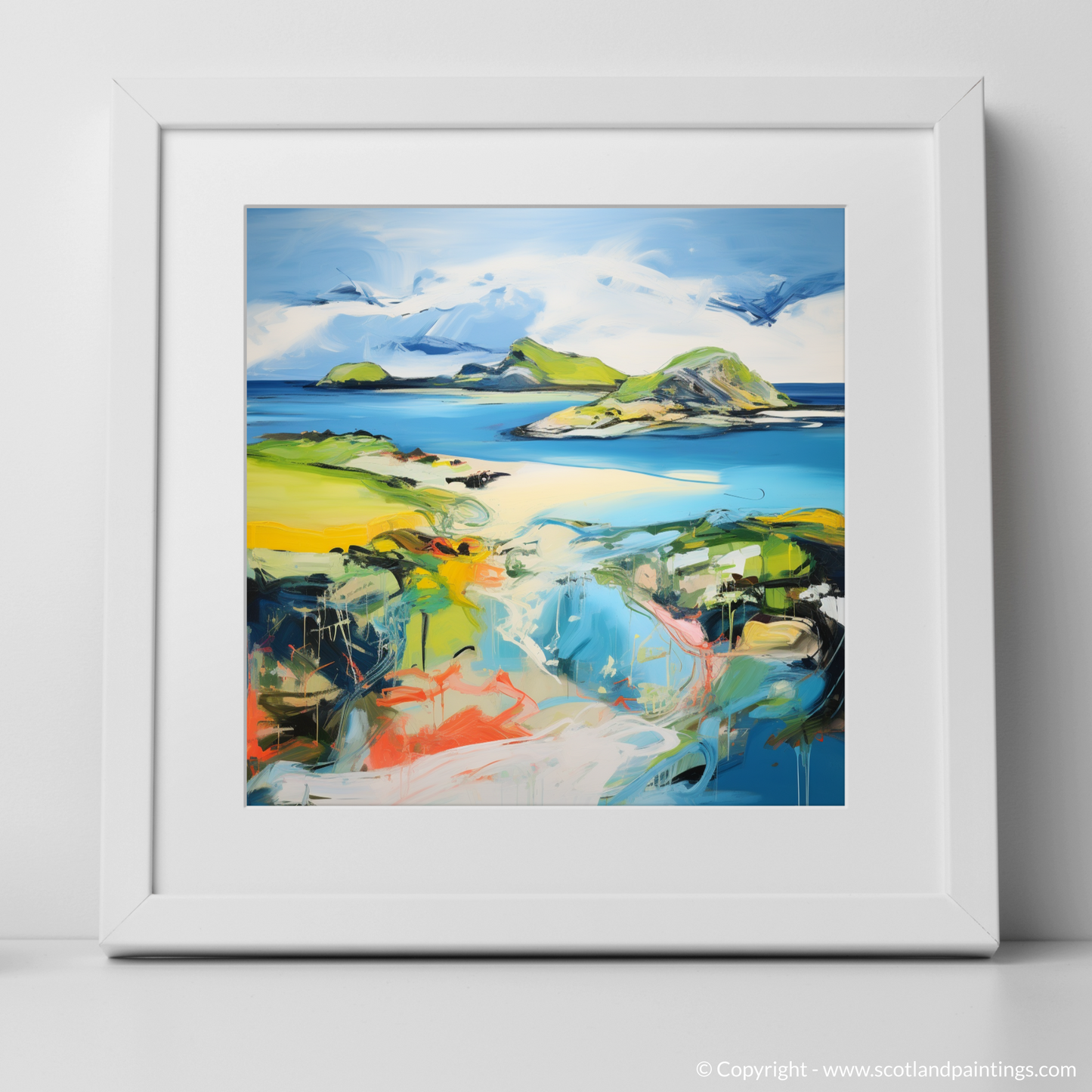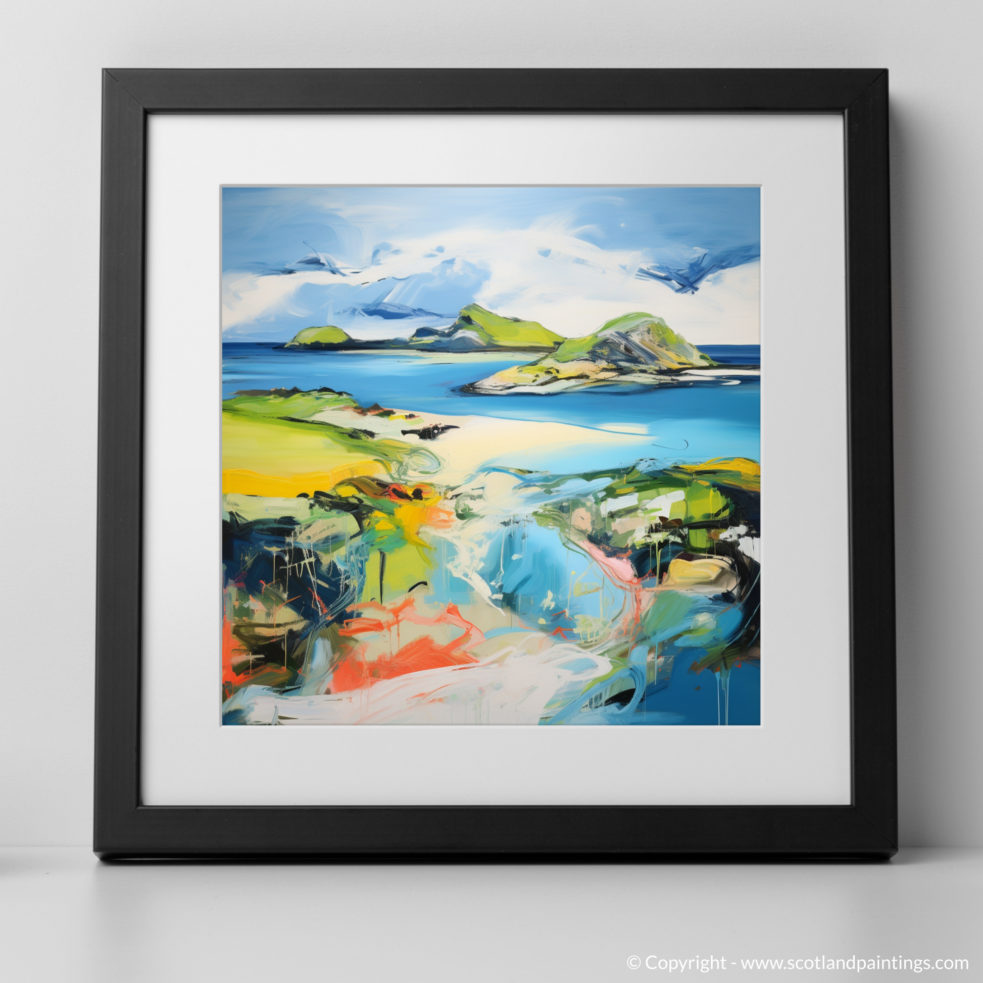 Let the vivid strokes and unrestrained colours of this evocative print transport you to Kiloran Bay, a locale that has captured the imagination of its viewers. Boasting a tapestry of dynamic blues, from the palest hint of sky to the depths of the ocean, this piece is a masterful representation of the tranquil waters that kiss the shores of the Isle of Colonsay.