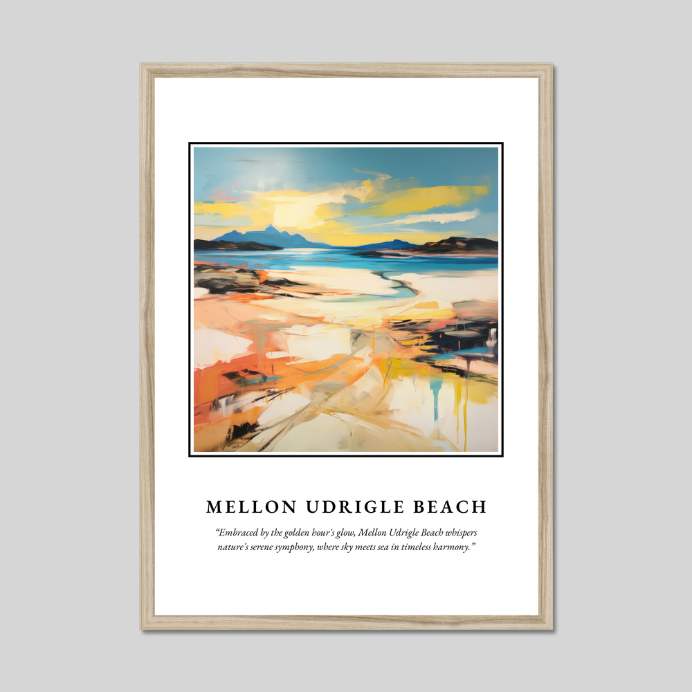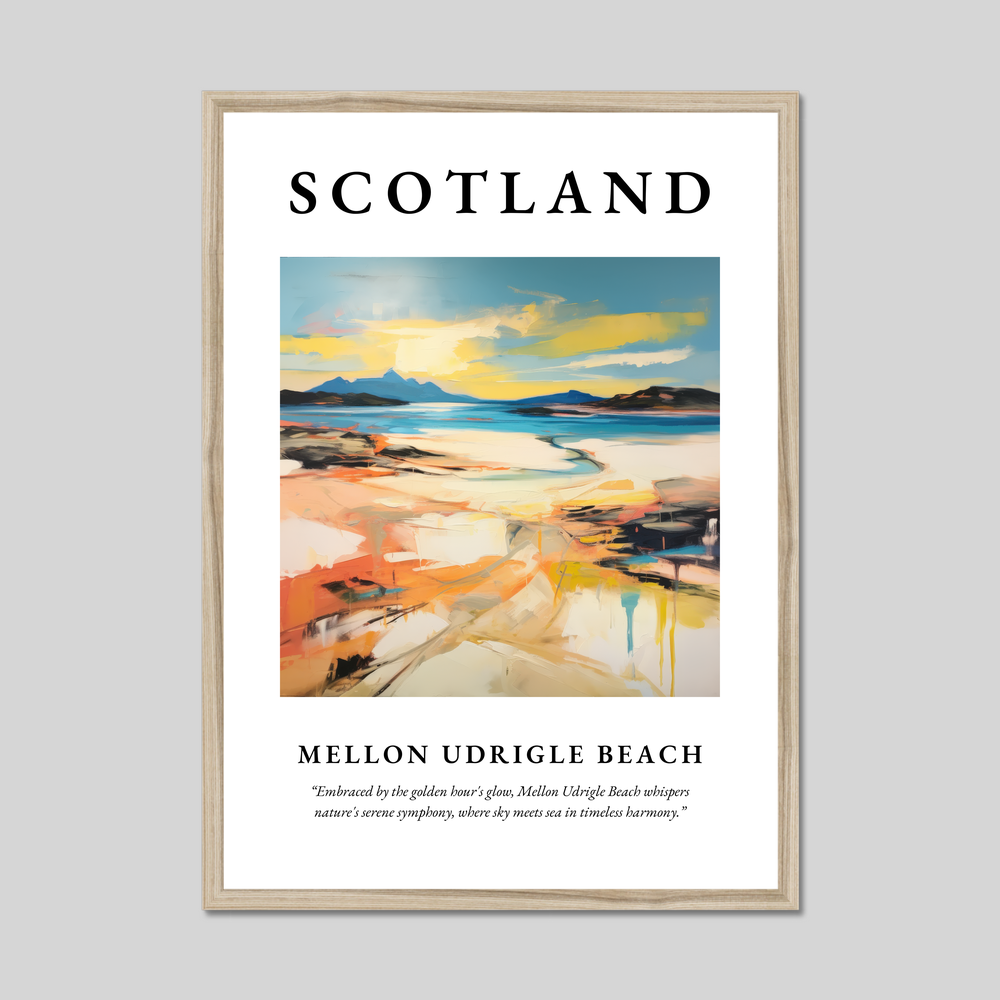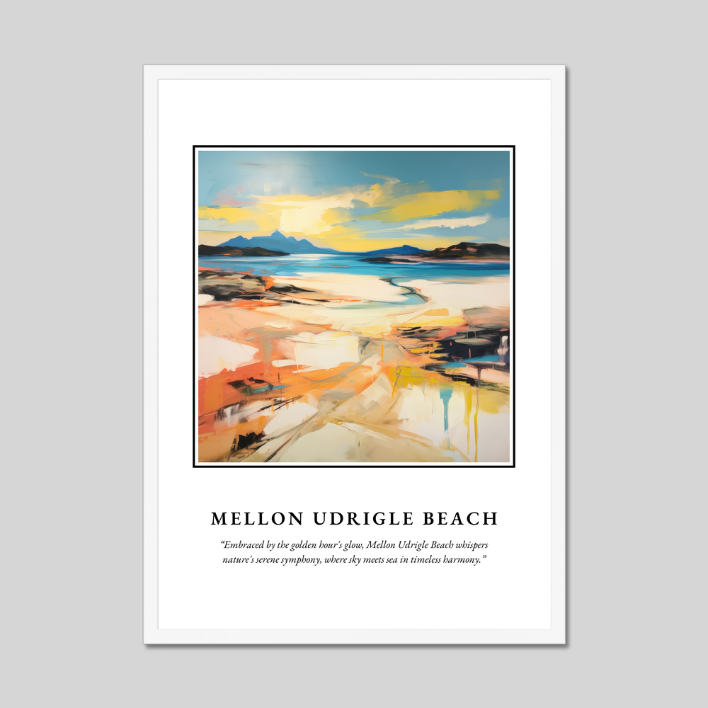 Mellon Udrigle Beach, a hidden gem nestled among Scotland's rugged coastline, is known for its pristine sands and crystal-clear waters. This secluded spot offers breathtaking views of the surrounding landscapes, including majestic mountains that seem to rise from the sea. The abstract brushwork in our poster echoes the area’s dramatic vistas, capturing the meeting of sky and sea in a riot of colours that reflect the area's natural splendour.