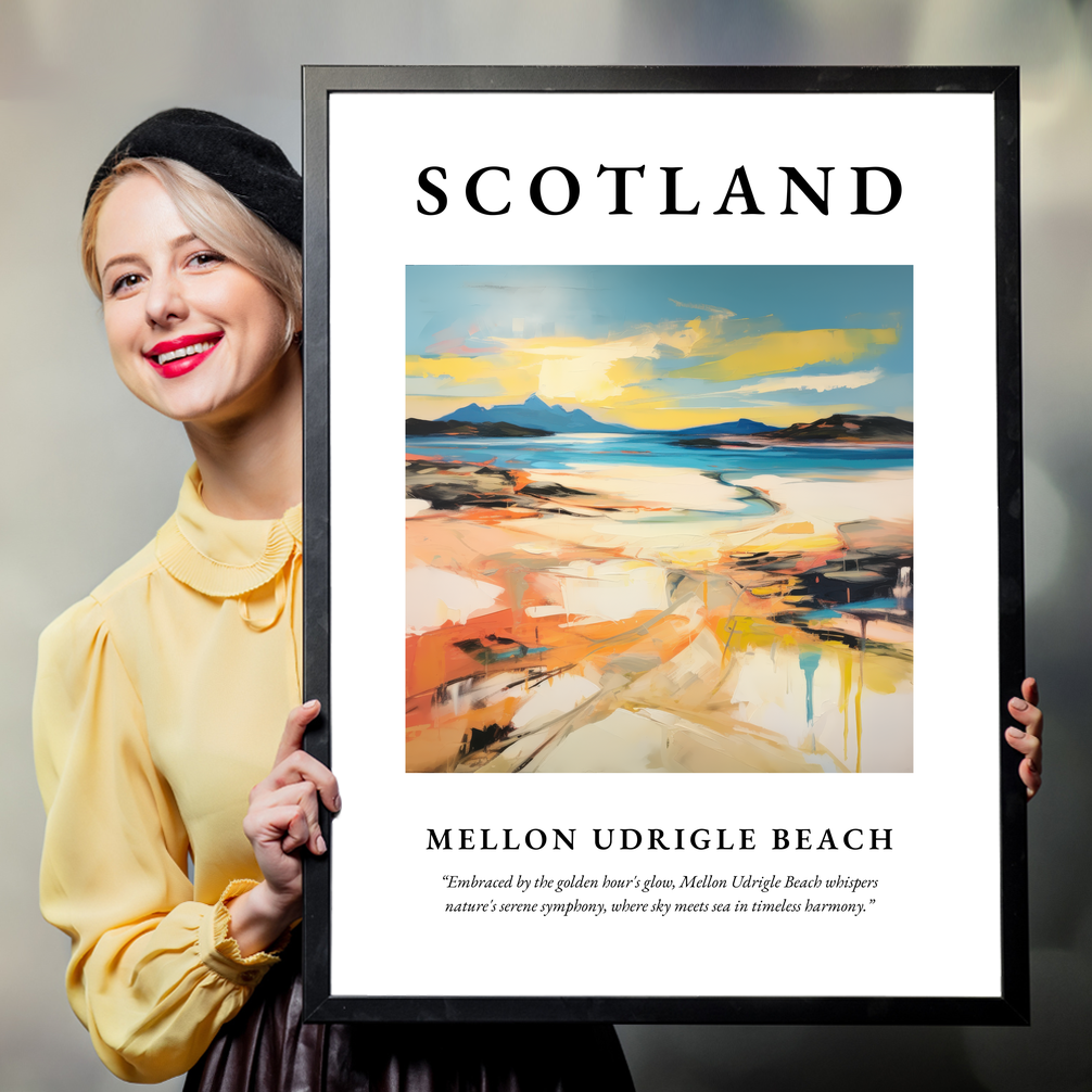 The word “SCOTLAND” crowns this artwork, introducing the breathtaking scene below: an abstract interpretation of Mellon Udrigle Beach that combines bold brushstrokes with an interplay of colours that evoke the tranquillity and raw beauty of nature. Each glance reveals something new, inviting those who adore art or have a connection to this magnificent region to lose themselves in its depth. Below the painting, a poetic quote serves as a gentle reminder of the serenity this location inspires: “Embraced by the golden hour's glow, Mellon Udrigle Beach whispers nature's serene symphony, where sky meets sea in timeless harmony.”