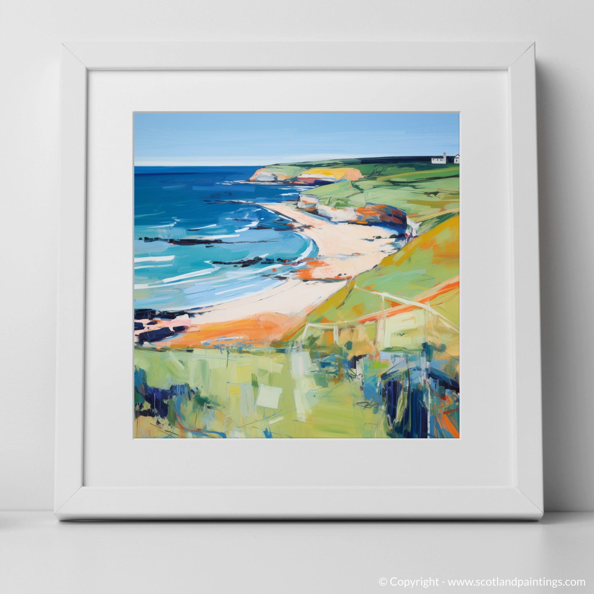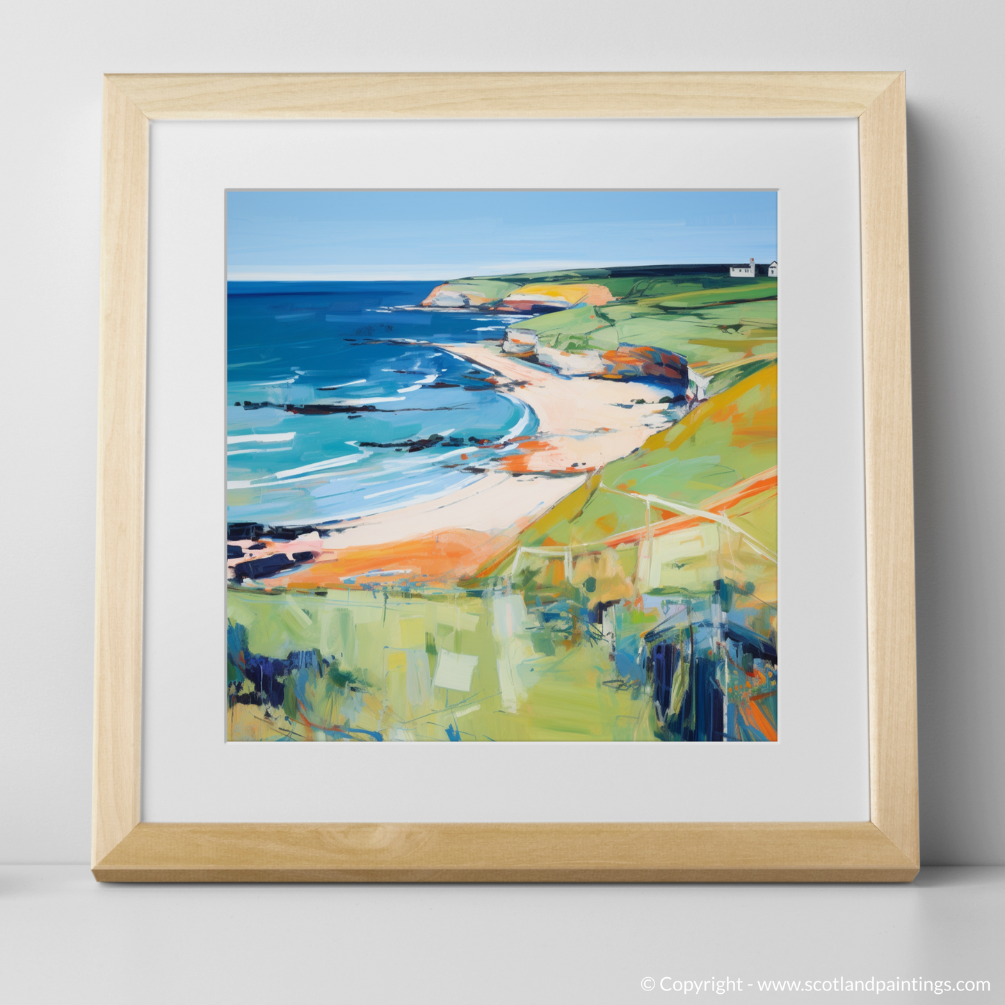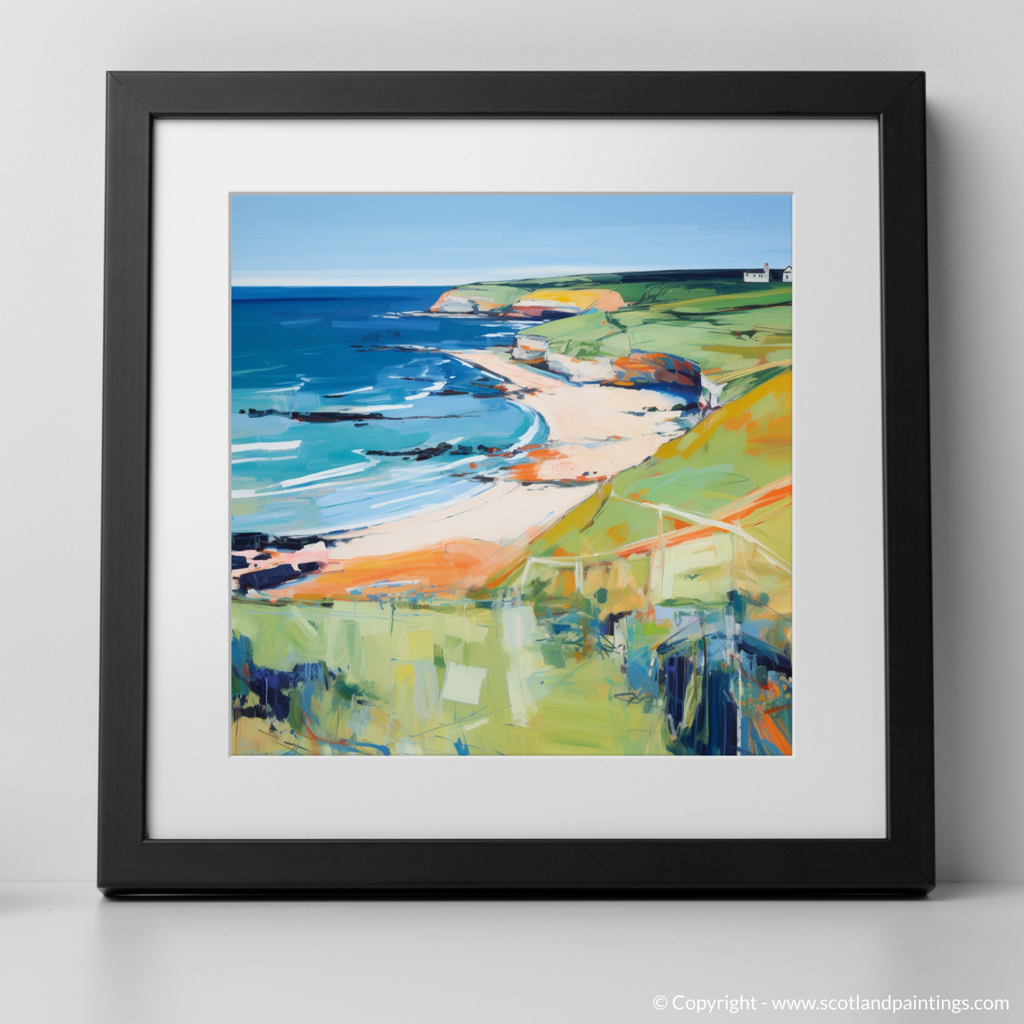 Immerse yourself in the vibrant essence of a Scottish summer with our enchanting abstract impressionist print, inspired by the idyllic Coldingham Bay. Evoking the spirit of the Scottish Borders coastline, this piece swirls with the liveliness and colour of the summer months by the sea.
