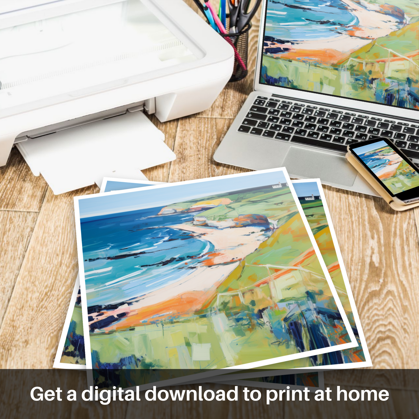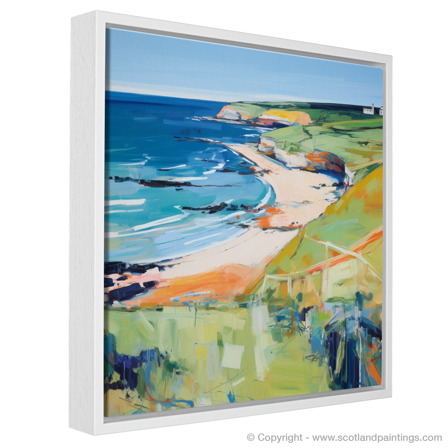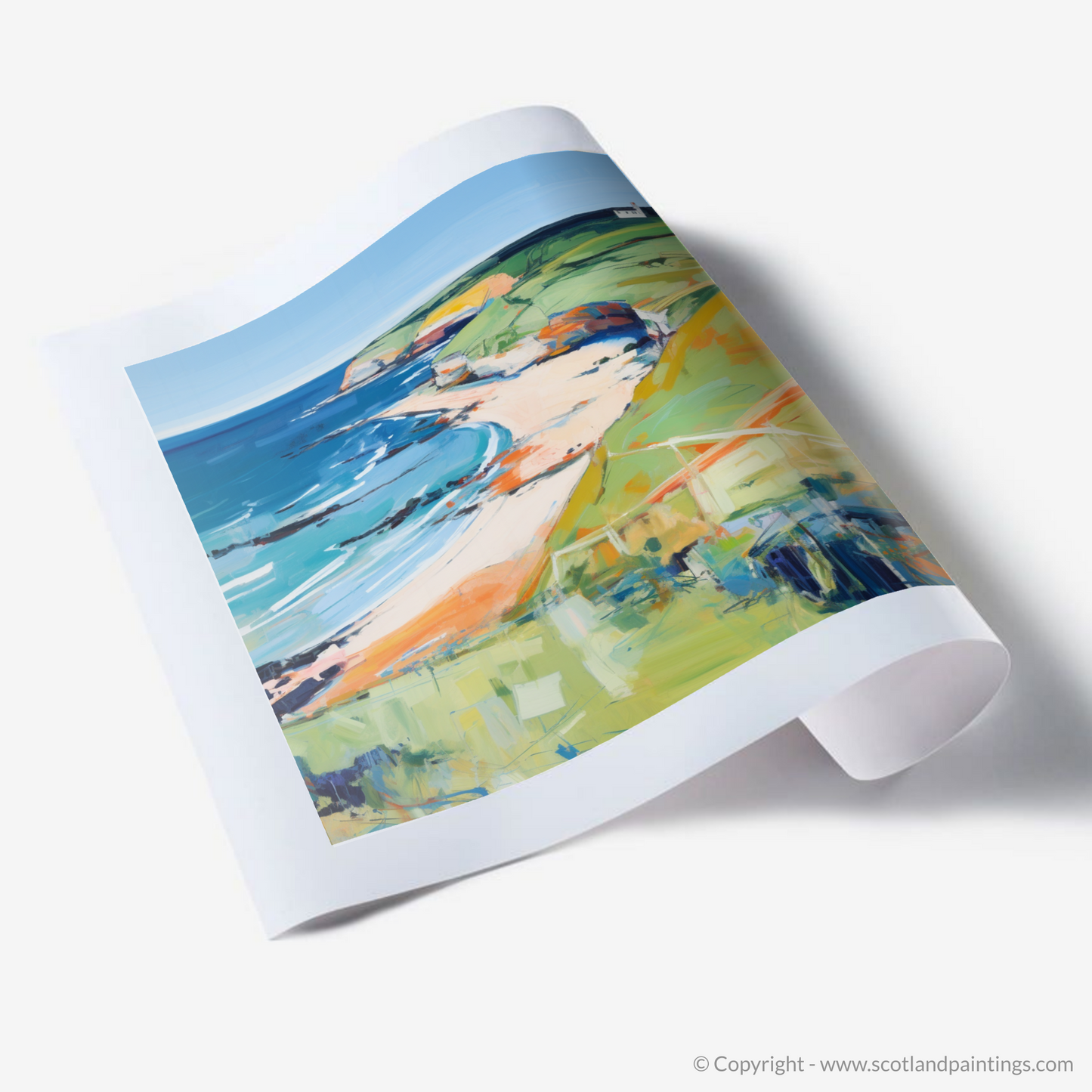 Immerse yourself in the vibrant essence of a Scottish summer with our enchanting abstract impressionist print, inspired by the idyllic Coldingham Bay. Evoking the spirit of the Scottish Borders coastline, this piece swirls with the liveliness and colour of the summer months by the sea.