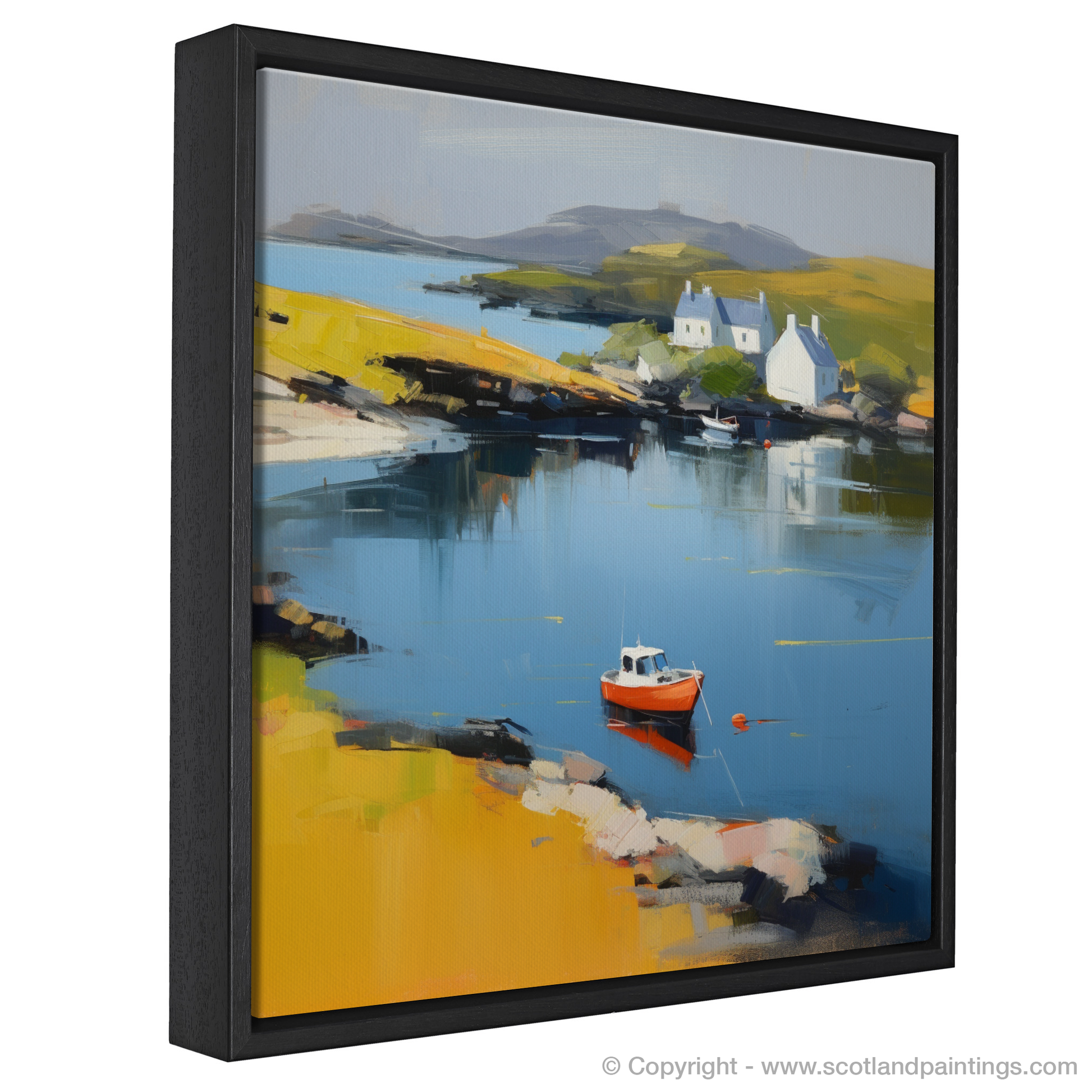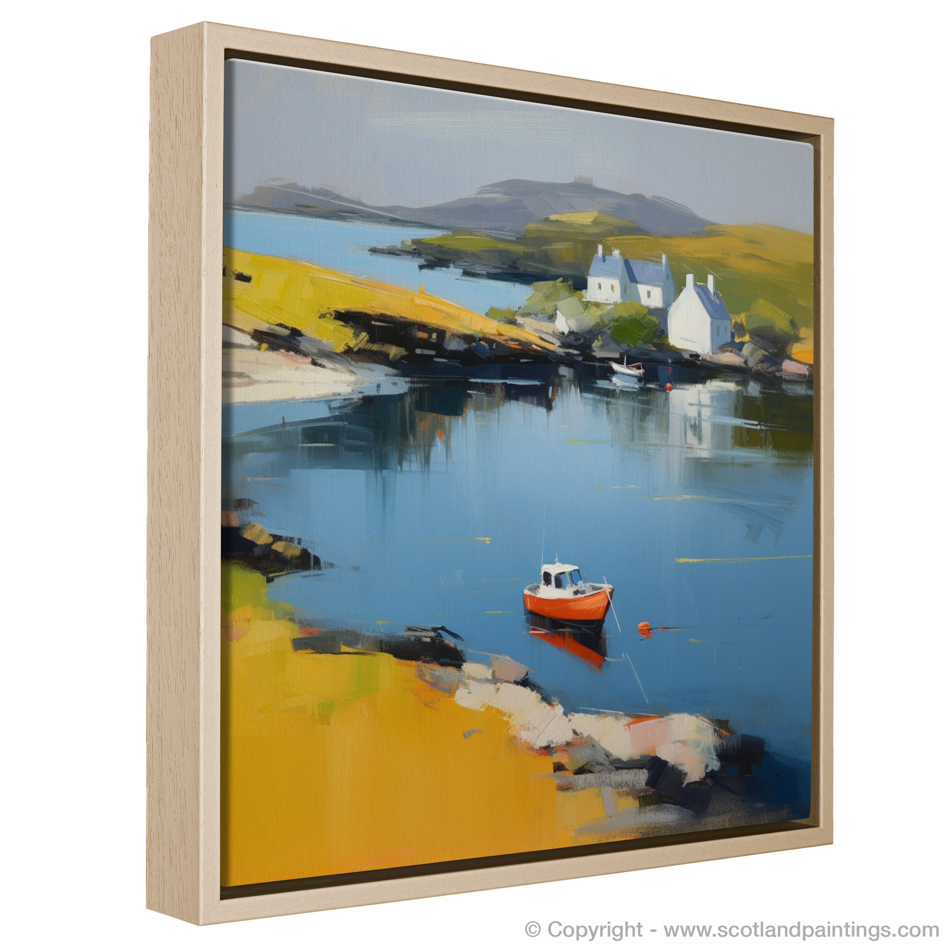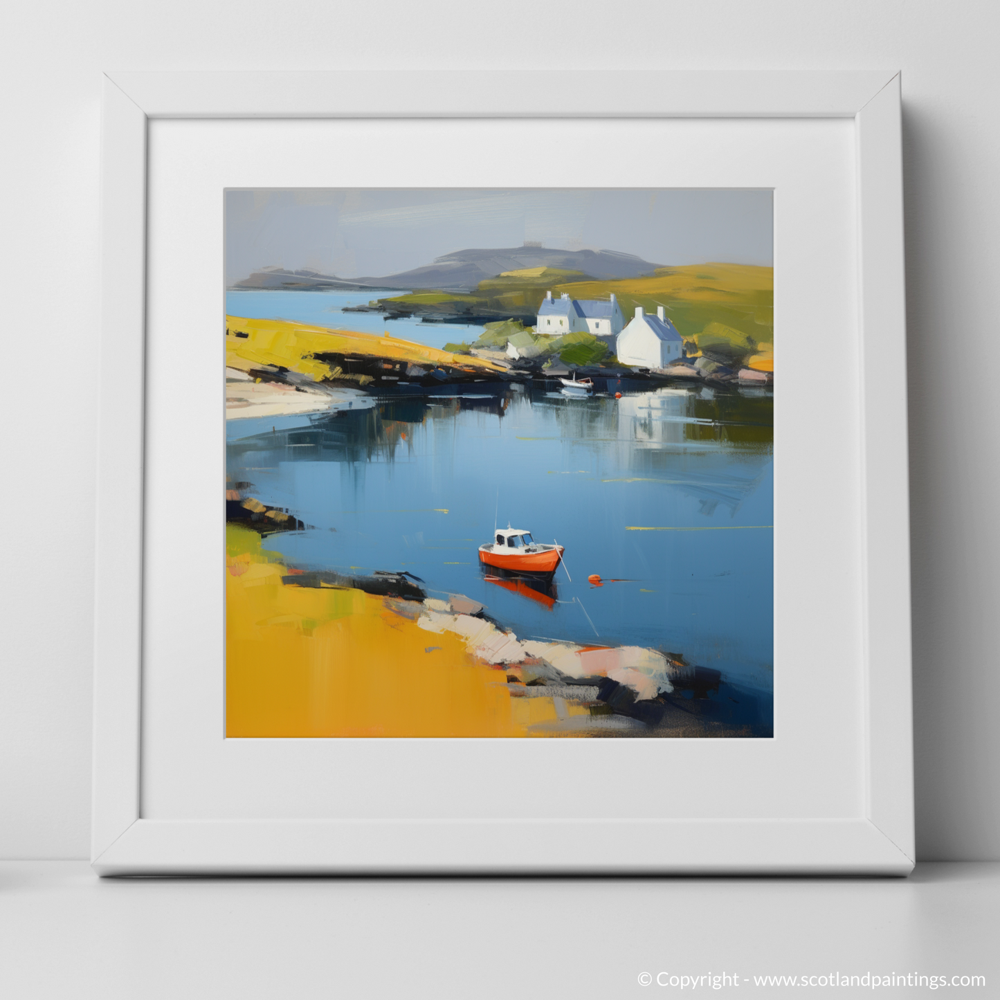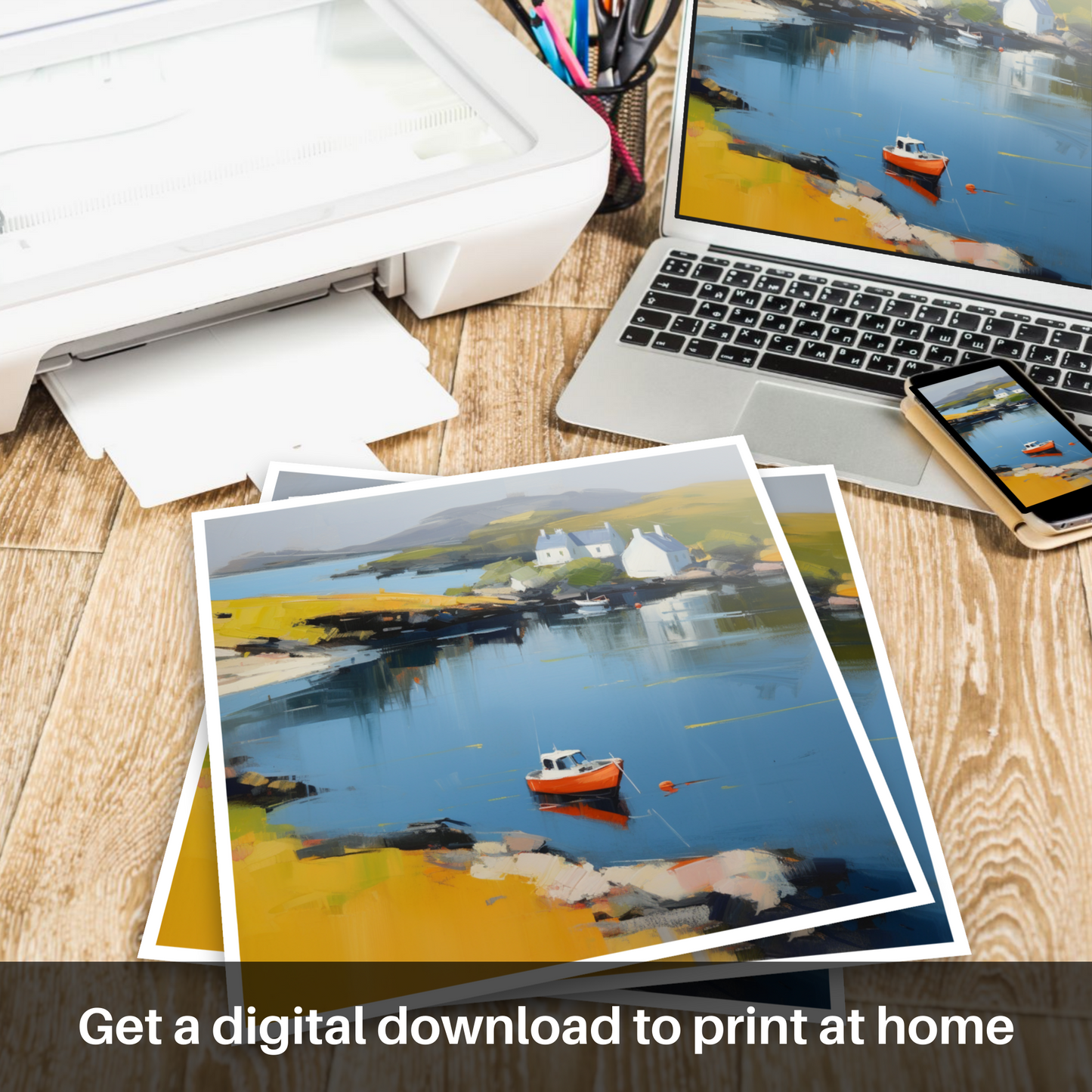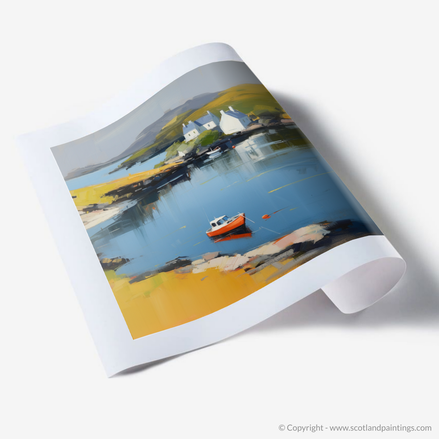 Immerse yourself in the tranquil beauty of a serene Scottish cove with this enchanting contemporary print. This exquisite piece captures the essence of Scourie Bay in Sutherland, where the gentle play of light and shadow upon the water creates a tapestry of reflection that is both calming and captivating. Cast in a palette of vivid blues and radiant oranges, the eye is immediately drawn to a vibrant red boat, floating gracefully on the mirror-like bay, its reflection a soft whisper on the water's surface.