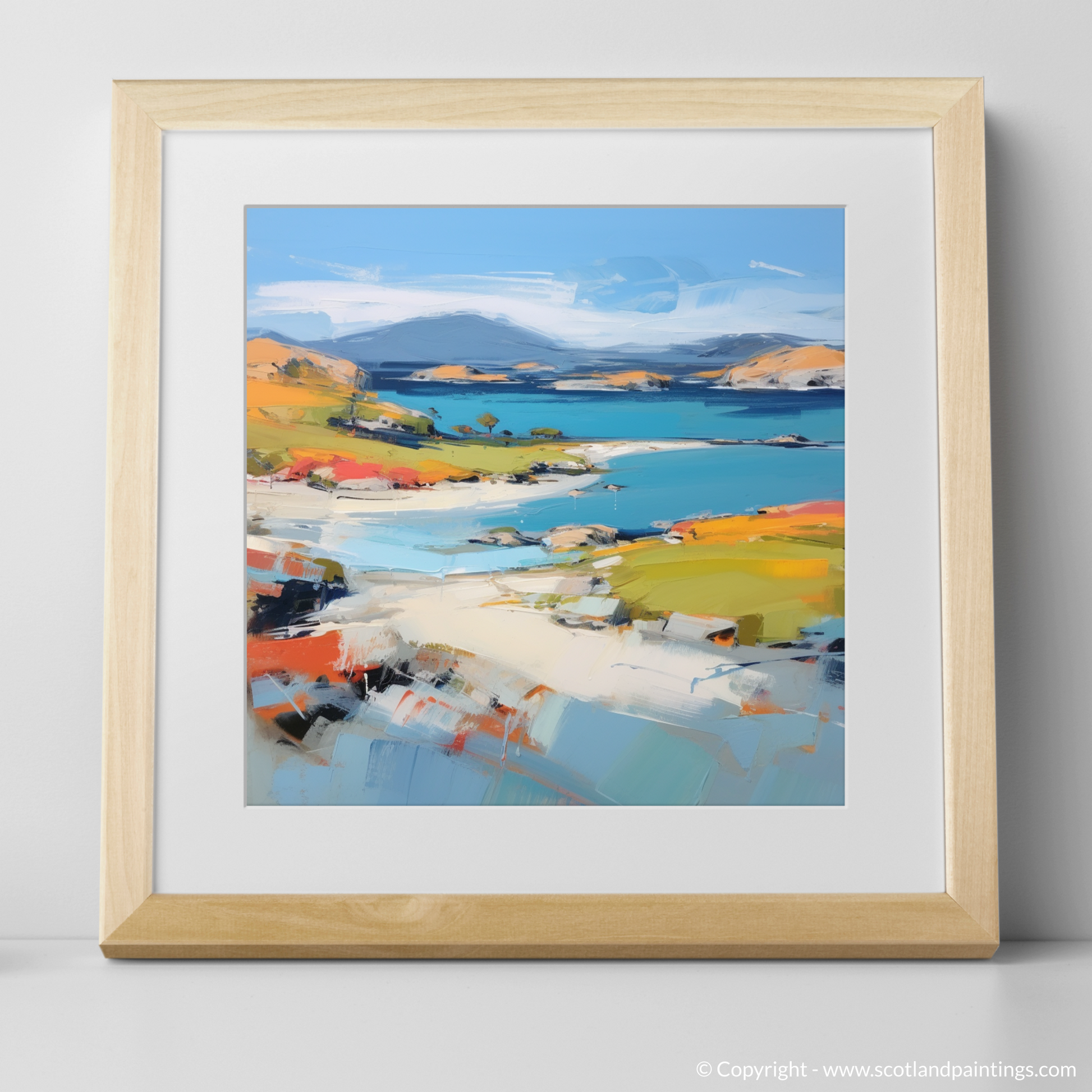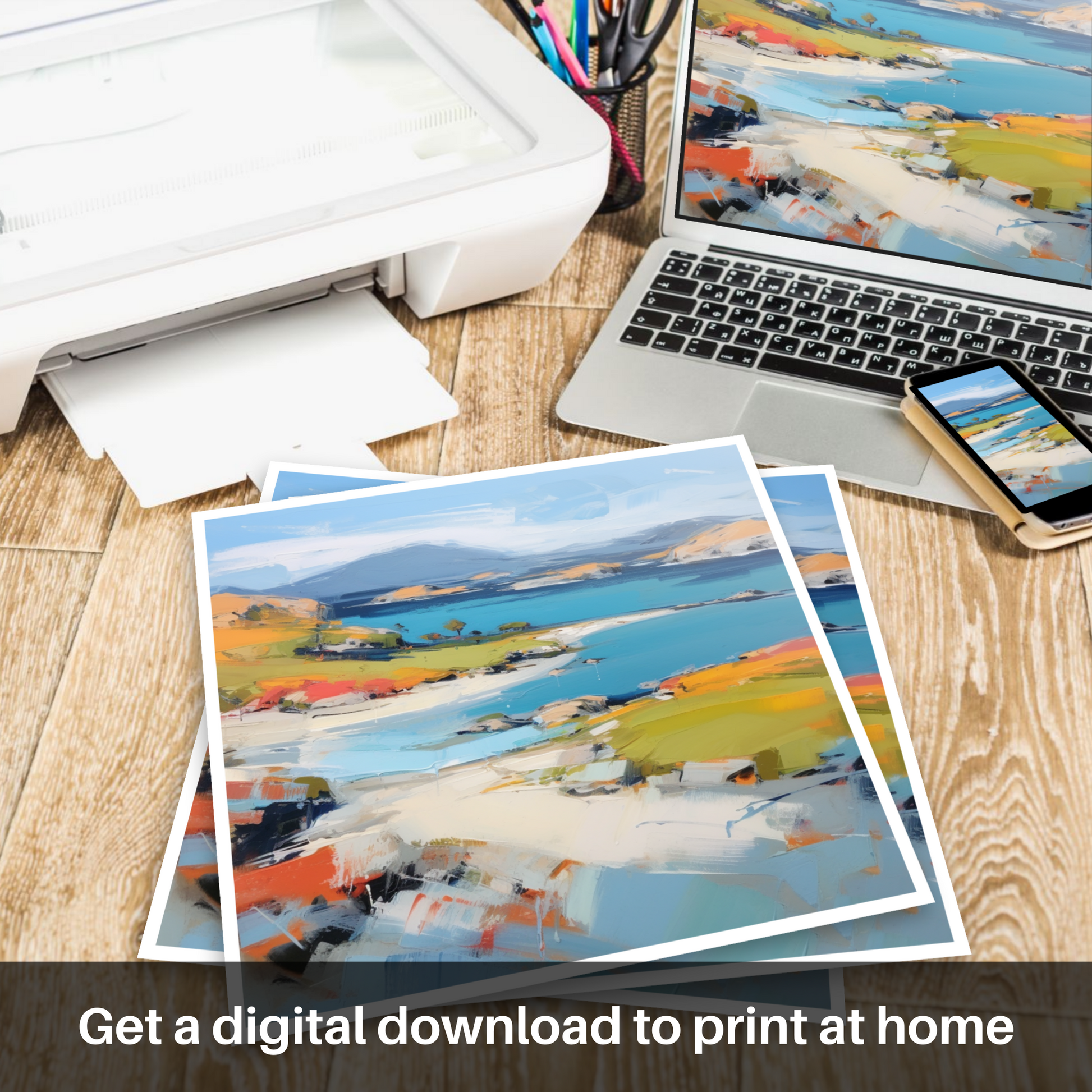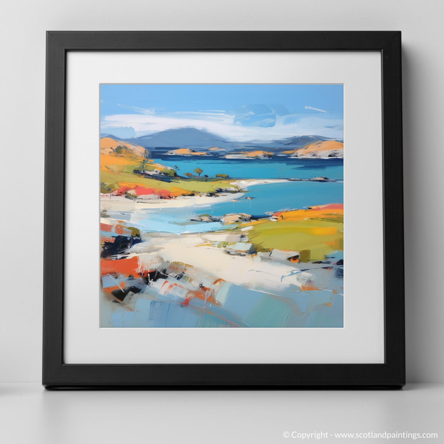 Immerse yourself in the dynamic beauty of a quintessential Scottish landscape with this enchanting print that captures the vibrant and untamed spirit of Scourie Bay in Sutherland. The crisp azure waters playfully ebb onto the shores, harmonising with a mosaic of natural hues that define this captivating seascape.