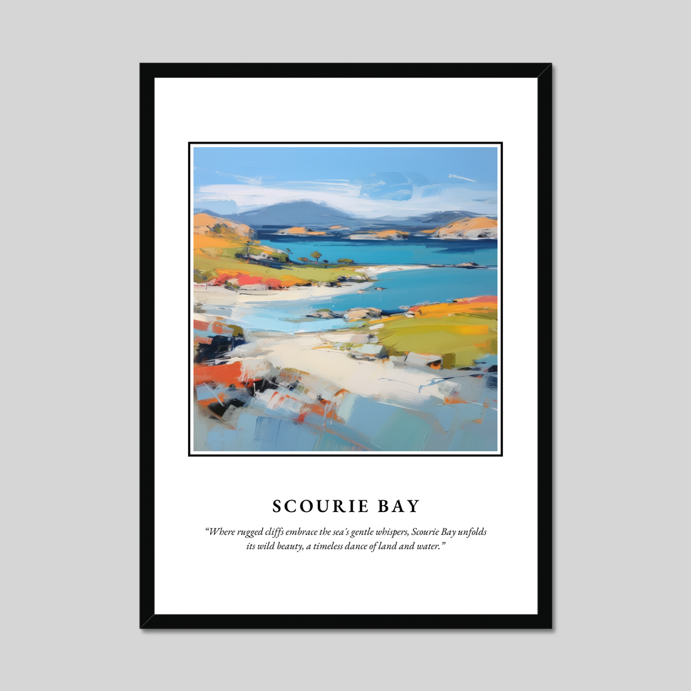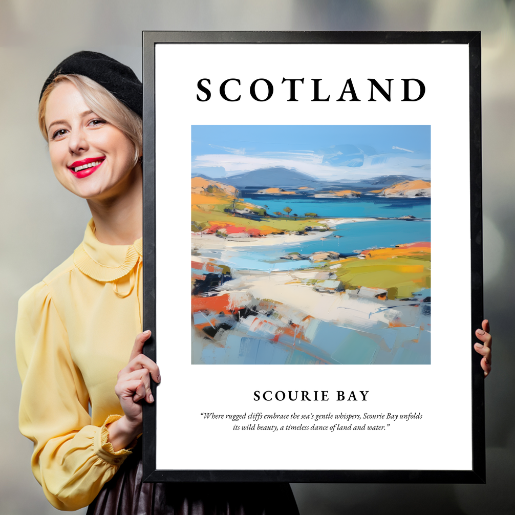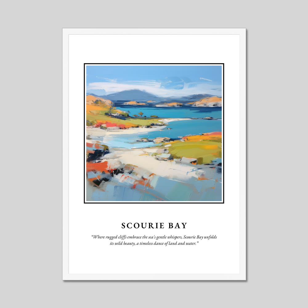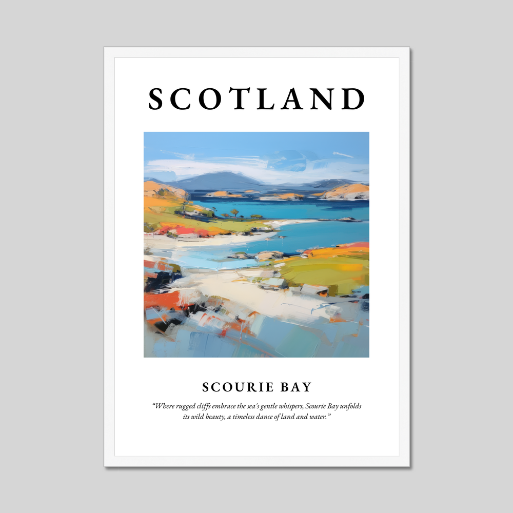 In the poster, Scourie Bay's enchanting atmosphere is captured in bold colours and sweeping lines, inviting viewers to imagine the fresh sea air and hear the gentle whispers of waves against the cliffs. A true reflection of its natural majesty, this framed print not only celebrates Scotland’s coastal treasures but also brings a piece of its timeless beauty into your home.
