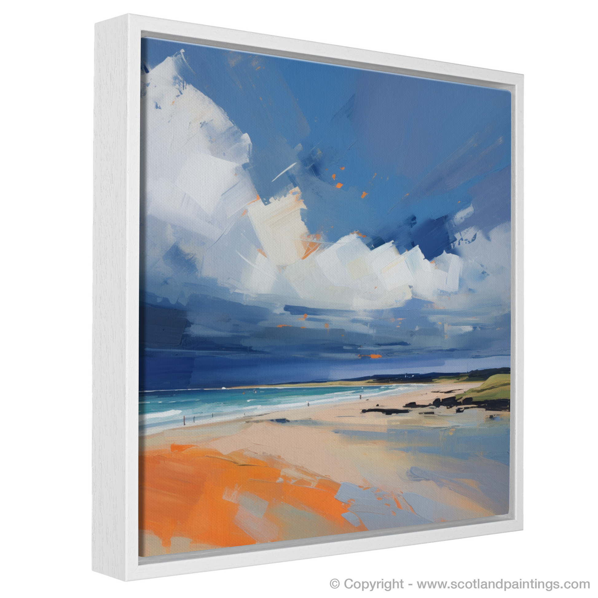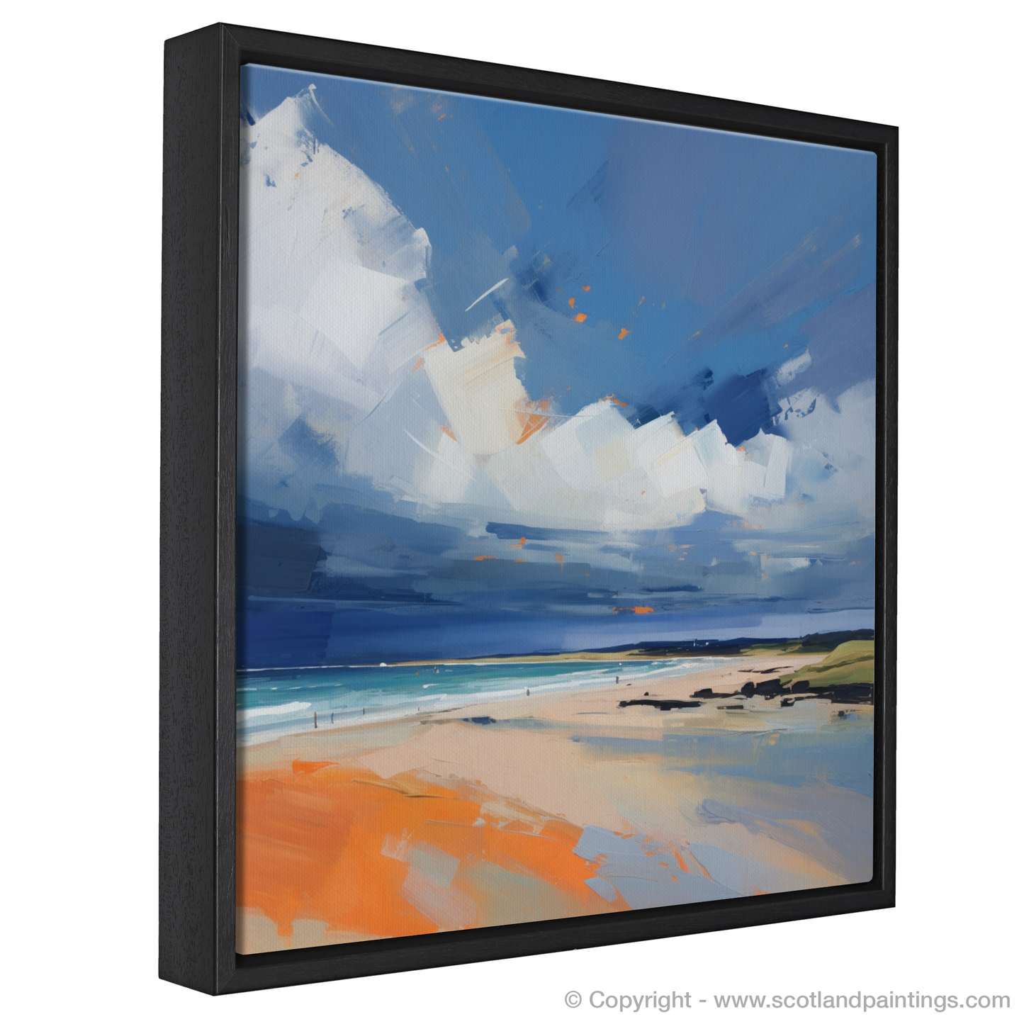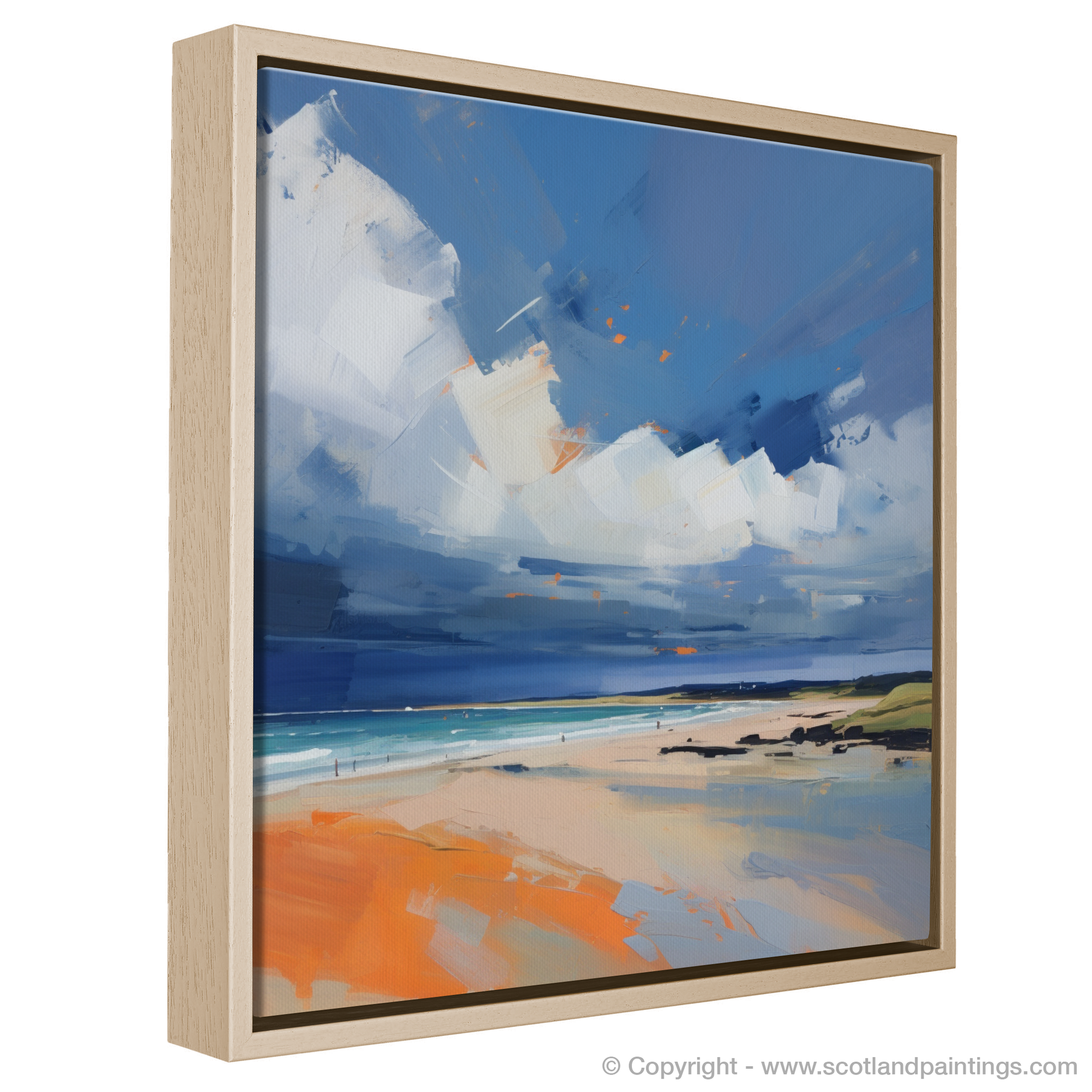Capturing the untamed beauty of a Scottish coastal landscape, this evocative piece draws you into the atmospheric embrace of Gullane Beach. The dynamic strokes and a palette of deep blues contrast with bright whites and subtle orange hues to portray the fleeting beauty of a stormy sky brooding over the serene beach below.