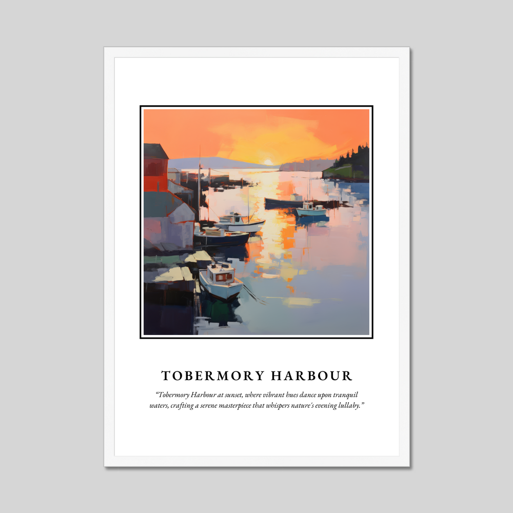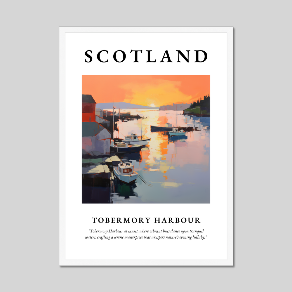 At the top, bold lettering spells out “SCOTLAND,” proudly announcing the origin of the serene scene below. The painting captures the mesmerising view of Tobermory Harbour at sunset, where vibrant shades of orange and pink play across tranquil waters. This contemporary artwork portrays boats gently anchored, their reflections shimmering on the water's surface, creating a harmonious dance of colours. Beneath the image, the words “Tobermory Harbour at sunset, where vibrant hues dance upon tranquil waters, crafting a serene masterpiece that whispers nature's evening lullaby” perfectly describe this tranquil evening setting.