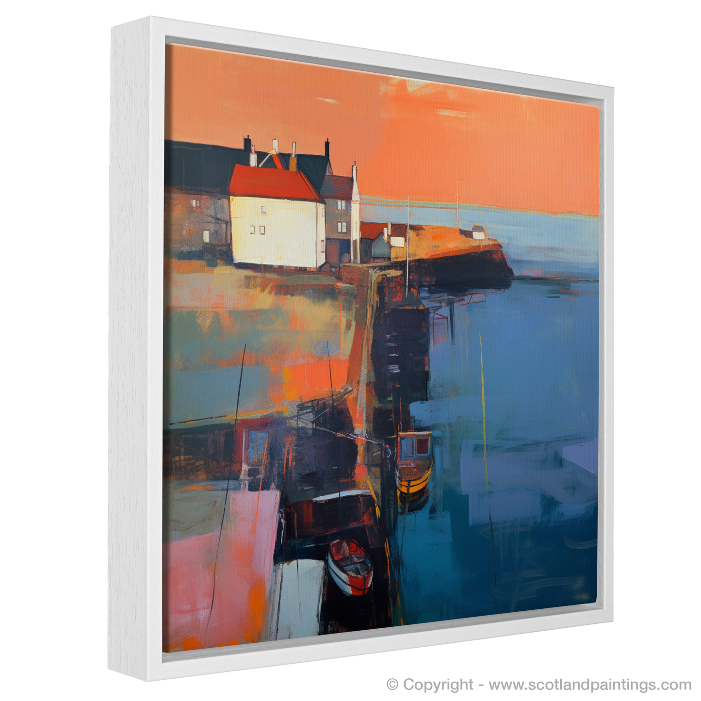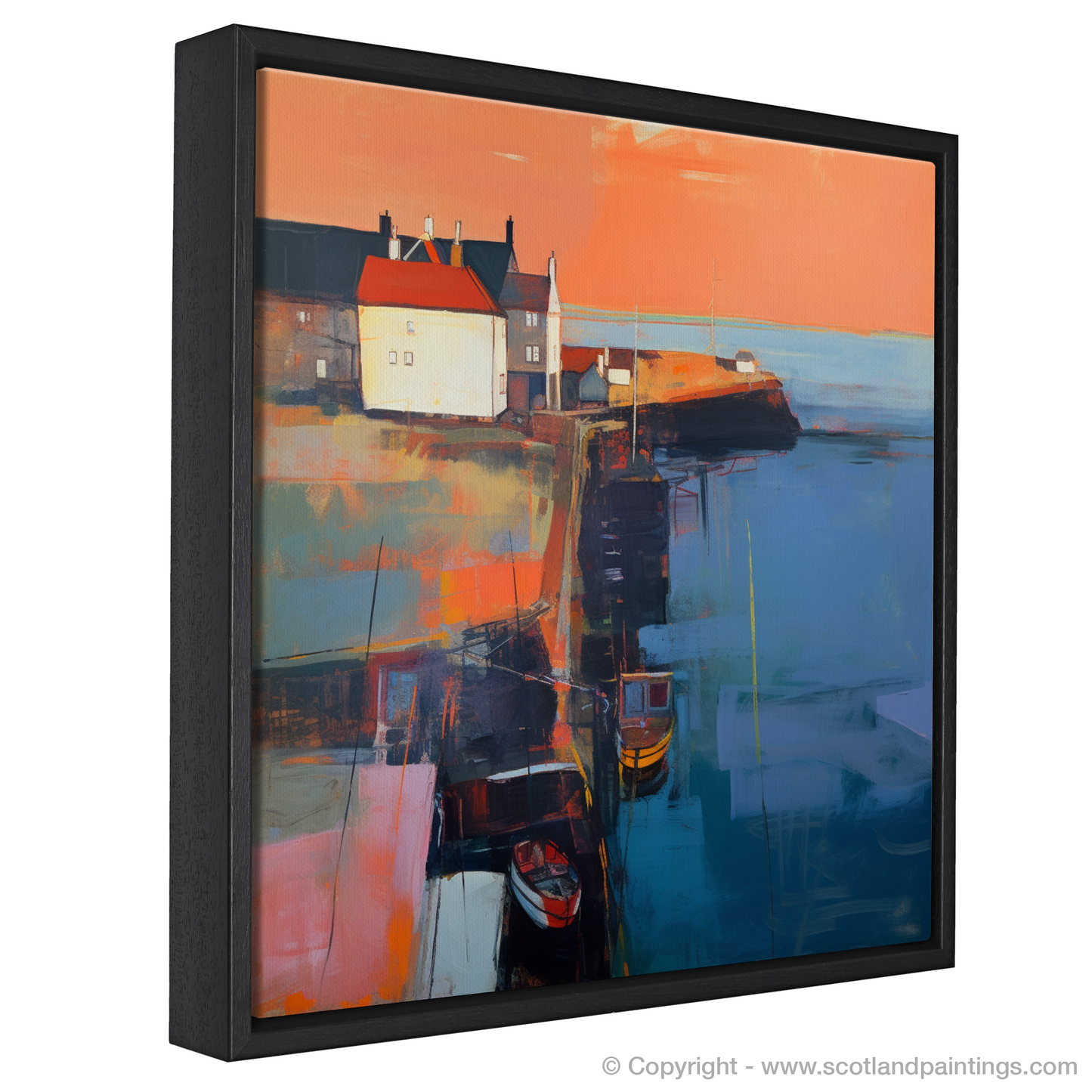 As the golden hues of sunset kiss the horizon, this evocative print captures the essence of St Monans Harbour in a blaze of abstract impressionism. The artwork invites the viewer on a visual journey through the serene Scottish landscape, where the day's last light bathes the scene in warm, vibrant tones.