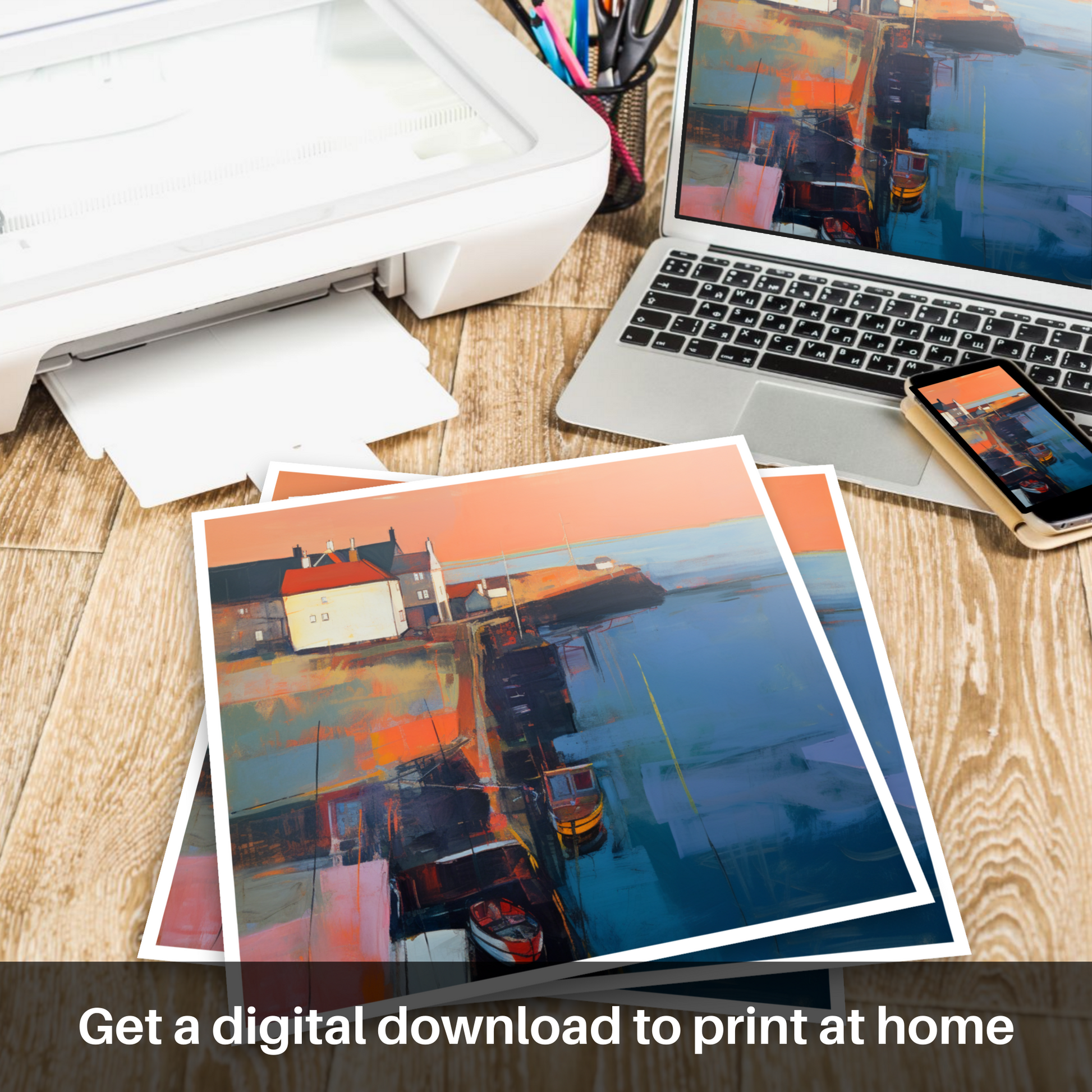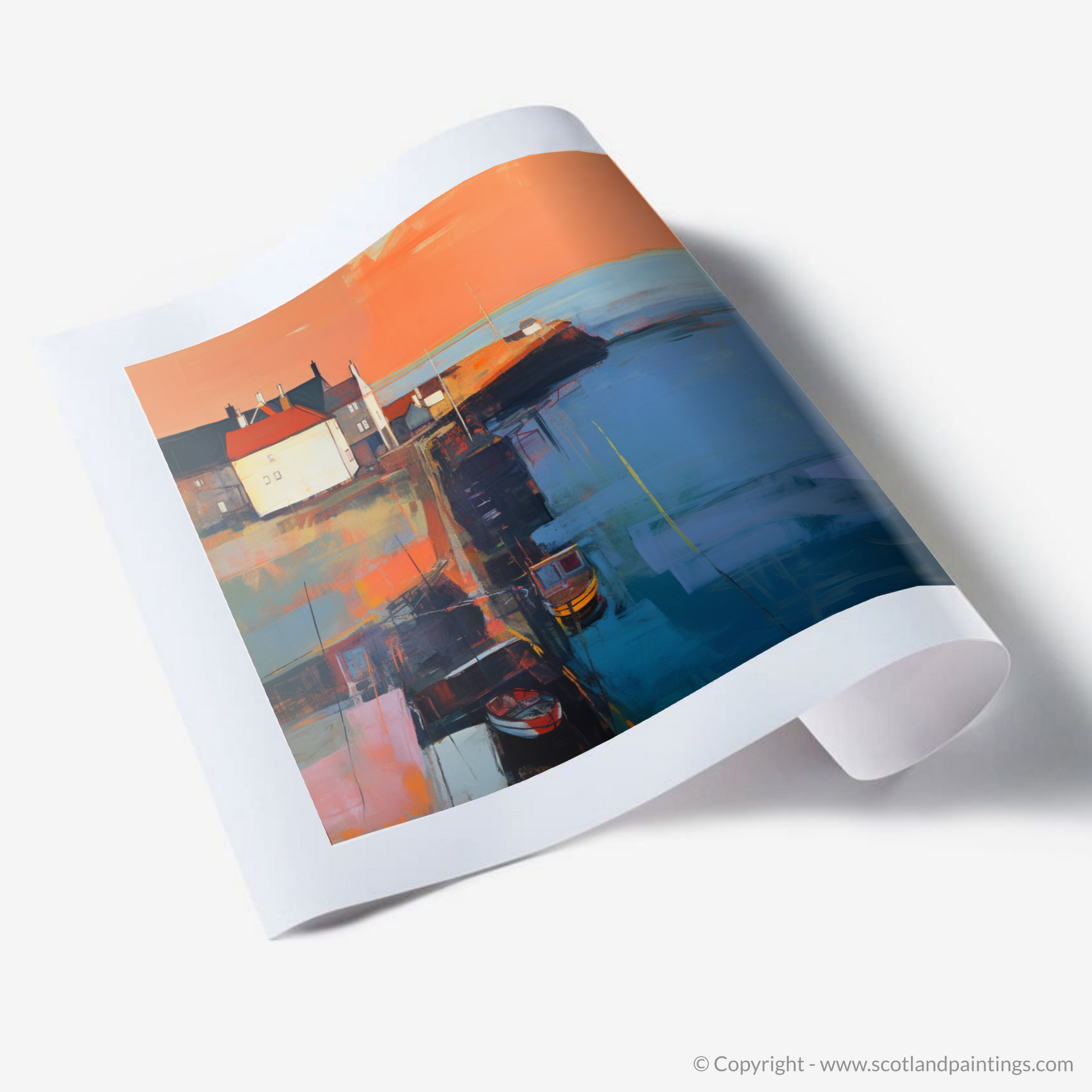 A palette rich with burnt oranges, fiery reds, and calming blues creates a symphony of colour that mirrors the complexities of the sky's twilight performance. This print, a part of the esteemed 'Scottish Harbours' collection, encapsulates the fusion of elements—a harmonious confluence of sea, sky, and the rustic charm of the harbour-side dwellings, all converging to create an abstract dance of light and reflection.