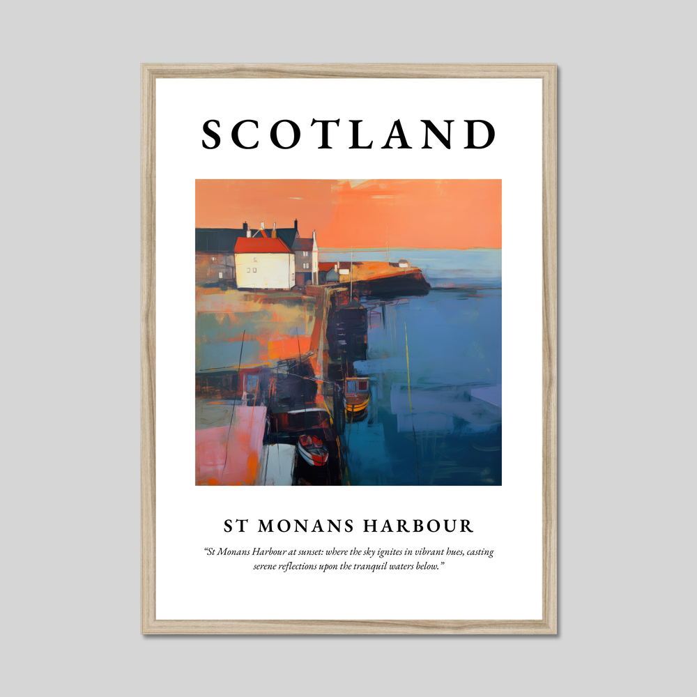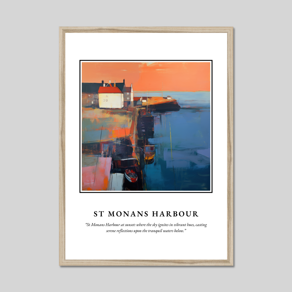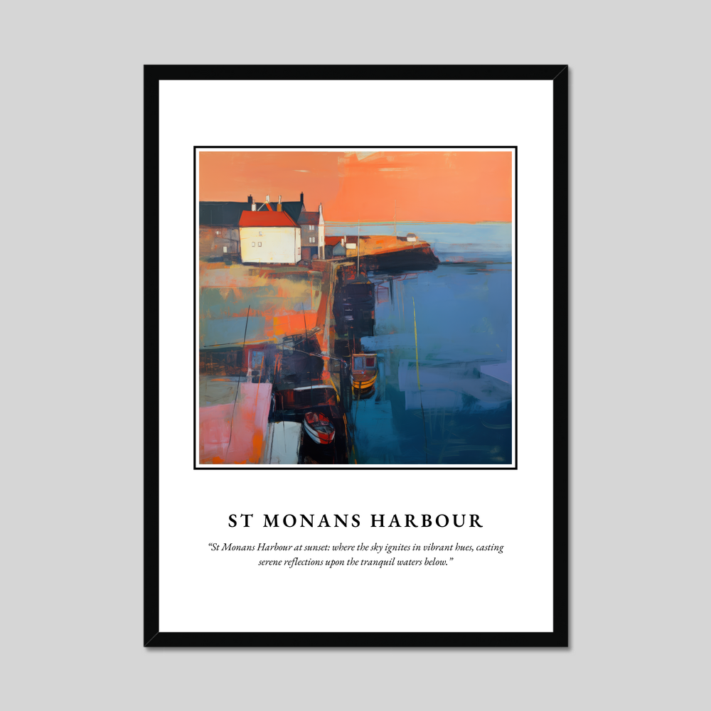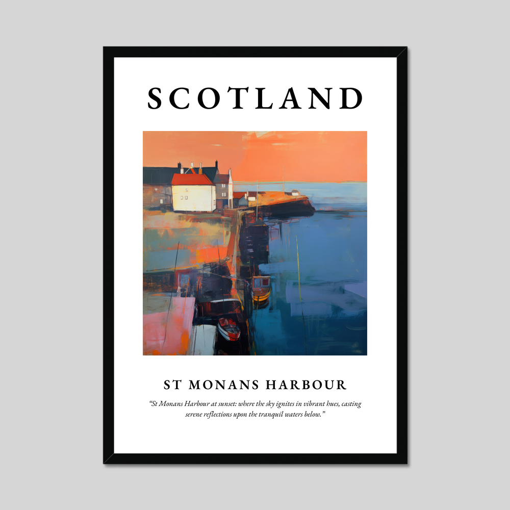 Available in a choice of black, white, or natural wood-effect frames, this piece seamlessly blends into any décor style. The poster showcases a captivating Abstract Impressionism painting of St Monans Harbour, beautifully portraying the vibrant play of colours at sunset. The dynamic brush strokes and vivid hues expertly capture the essence of the scene, where the sky ignites and casts serene reflections upon the tranquil waters below.
