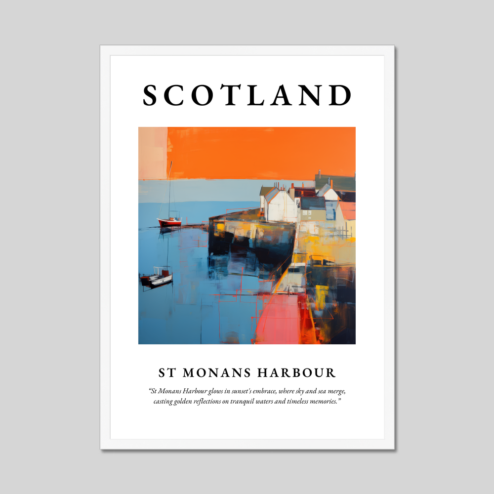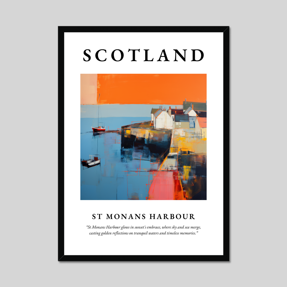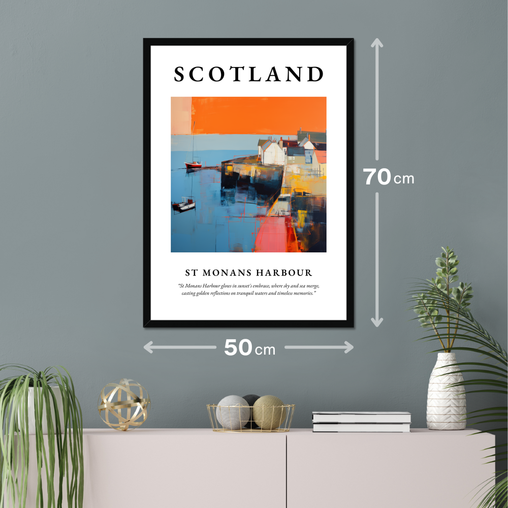 Experience the captivating allure of Scotland with our large, framed poster print, a stunning addition to any home or office space. Measuring an impressive 50cm x 70cm, this piece embodies the enchanting beauty of St Monans Harbour, set against the bold backdrop of the word "SCOTLAND". Enhanced by the intriguing style of Abstract Impressionism, the artwork captures the vivid dance of light as it glows in sunset’s embrace, merging the sky and sea. Below the painting, a delicate quote captures the essence: “St Monans Harbour glows in sunset's embrace, where sky and sea merge, casting golden reflections on tranquil waters and timeless memories.”