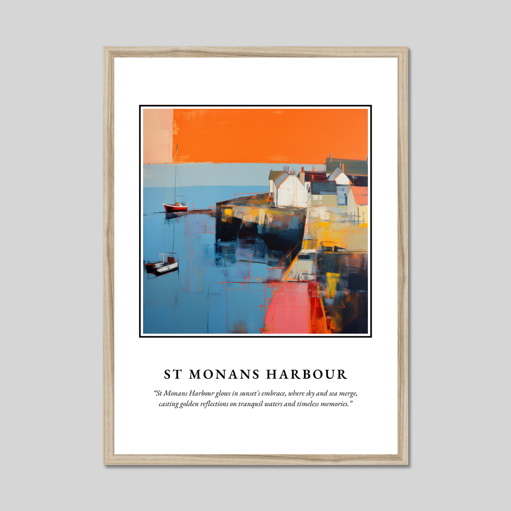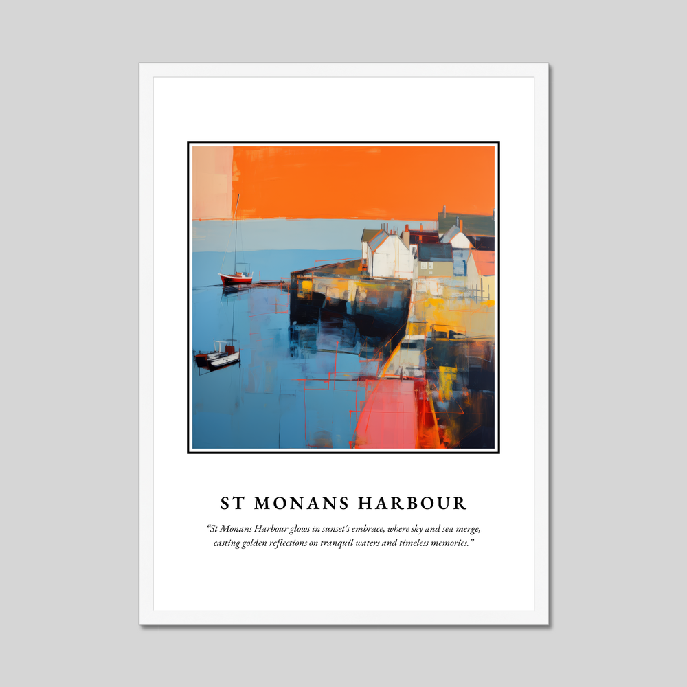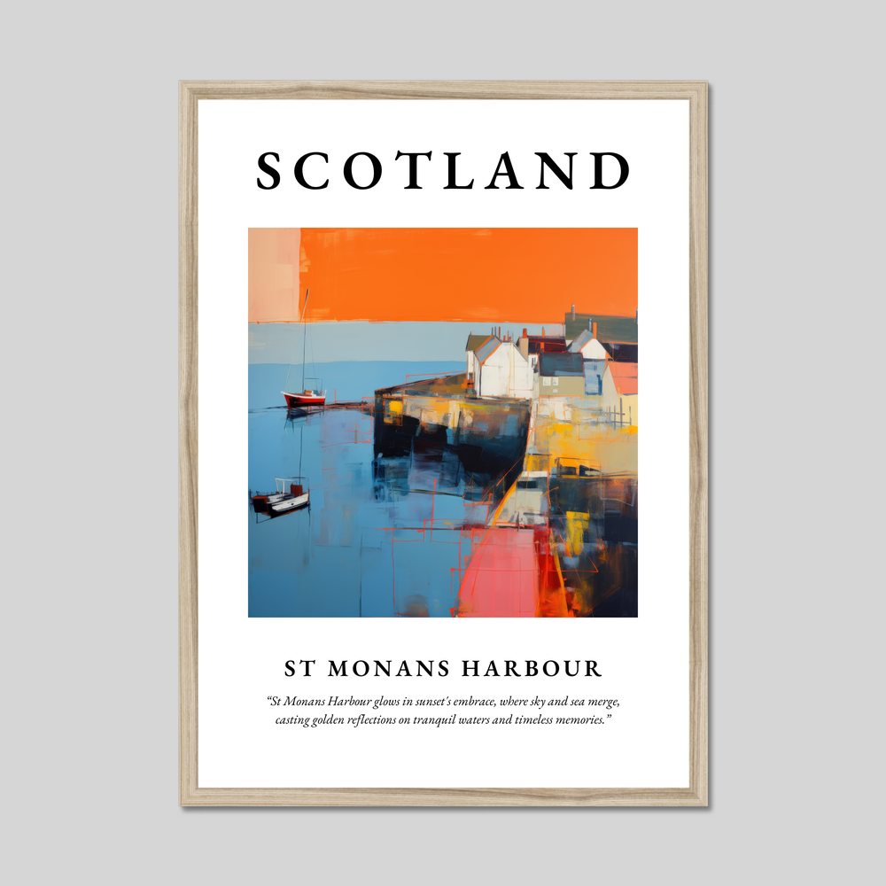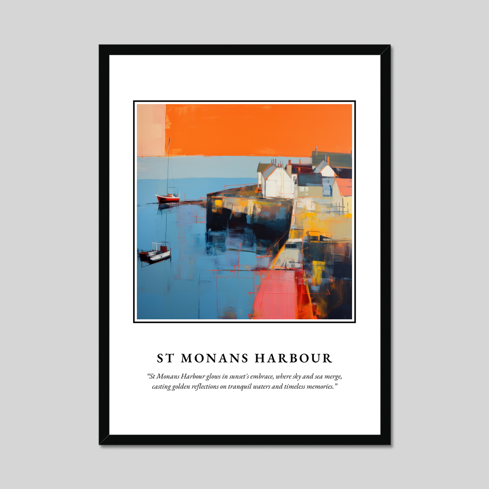 Experience the captivating allure of Scotland with our large, framed poster print, a stunning addition to any home or office space. Measuring an impressive 50cm x 70cm, this piece embodies the enchanting beauty of St Monans Harbour, set against the bold backdrop of the word "SCOTLAND". Enhanced by the intriguing style of Abstract Impressionism, the artwork captures the vivid dance of light as it glows in sunset’s embrace, merging the sky and sea. Below the painting, a delicate quote captures the essence: “St Monans Harbour glows in sunset's embrace, where sky and sea merge, casting golden reflections on tranquil waters and timeless memories.”