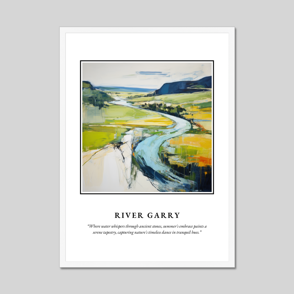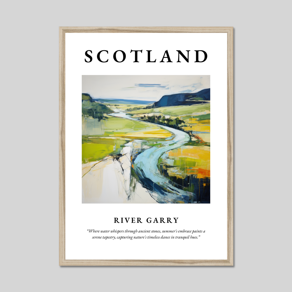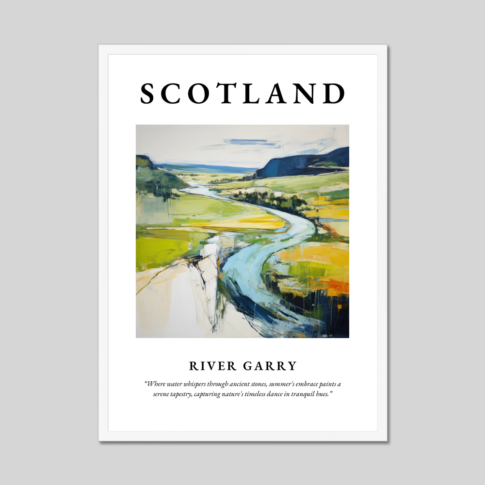 At the heart of the poster is an enchanting abstract impressionist painting of the River Garry. This masterpiece evokes the serene beauty of Scotland’s summer with vibrant brush strokes that dance across the canvas. The painting captures the meandering river as it winds its way through a landscape bathed in golden sunlight, where lush greens meet the crisp blues of the sky and water. Above and below, the artwork is set within a striking layout featuring the word “SCOTLAND” in bold lettering at the top, and beneath the painting, the evocative quote: “Where water whispers through ancient stones, summer's embrace paints a serene tapestry, capturing nature's timeless dance in tranquil hues.”