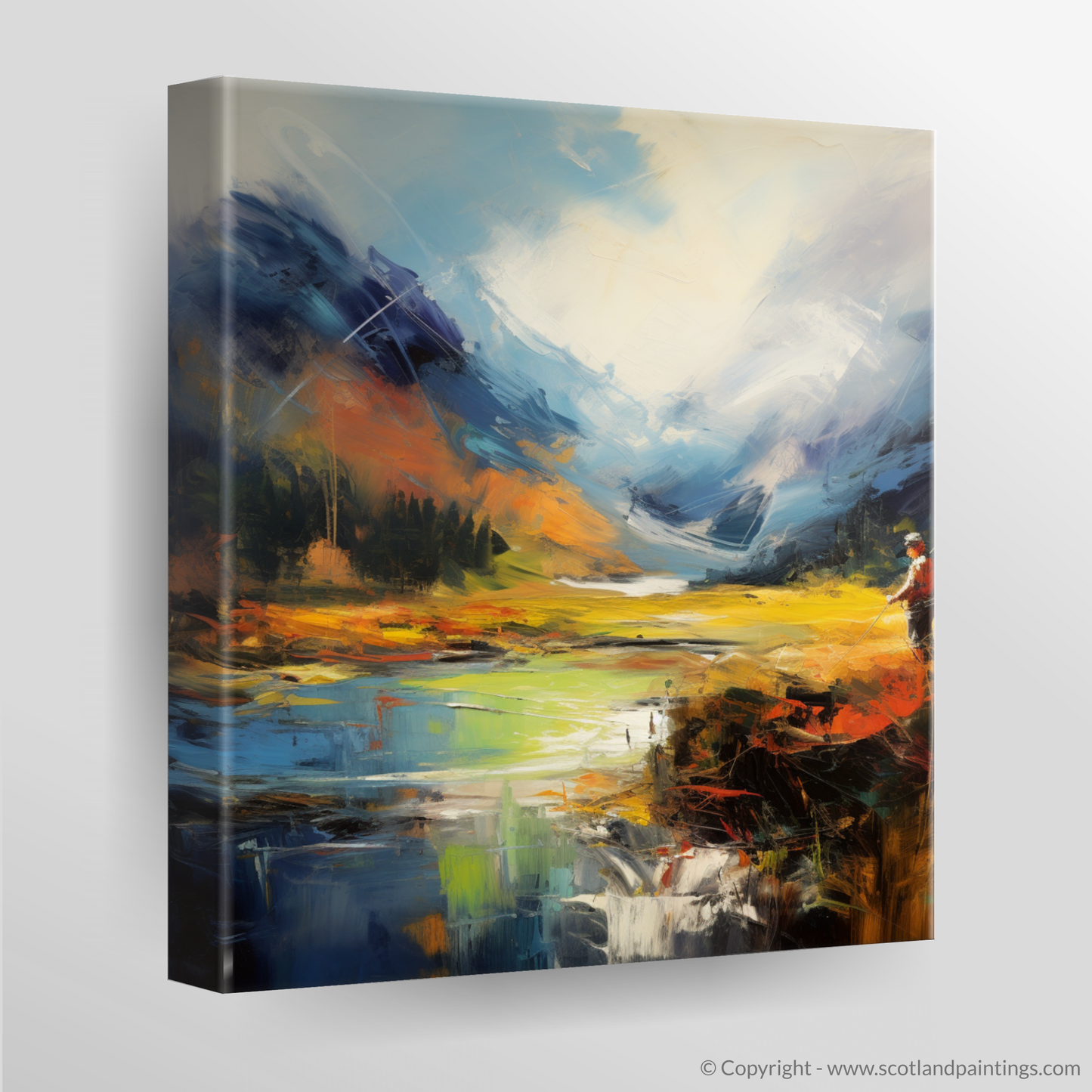 Embrace the tranquility and raw beauty of the Scottish Highlands with this exquisite print that captures the essence of fly fishing on the serene waters of Loch Shiel. Swathed in a palette of vivid hues, the canvas comes alive with the fusion of fiery oranges, rustic ambers, and glowing golds that paint the heather-clad landscape, mirroring the vibrant life beneath the water's surface.