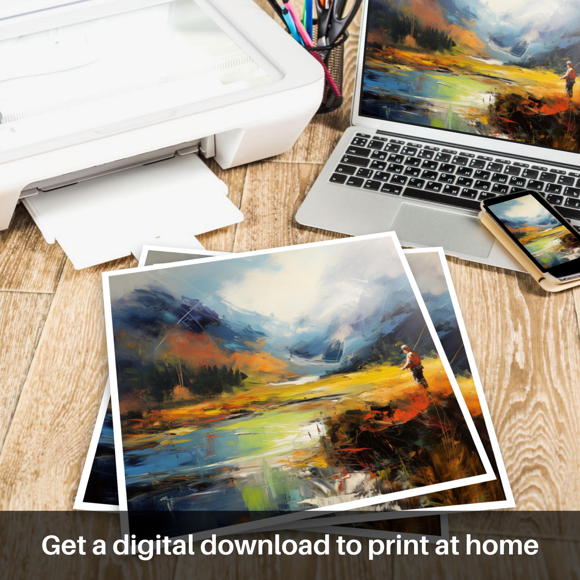 Transporting the viewer to a realm where every moment pulsates with life and every brushstroke tells a tale of the outdoors, this print is more than a visual delight. It is an invitation to wander, to dream, and to connect with the timeless allure of Scotland's unparalleled wilderness. Whether you're a nature lover, an avid angler, or an admirer of expressive art, this piece will add a touch of wild elegance and poetic drama to your collection.