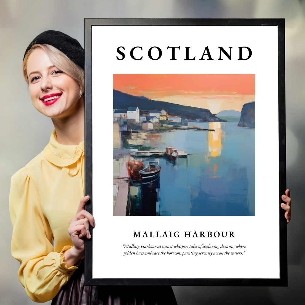 The poster features the word “SCOTLAND” in bold, commanding lettering, followed by a breathtaking Abstract Impressionist painting of Mallaig Harbour. The vibrant hues of the sunset dance across the canvas, capturing the whispers of seafaring dreams with rich, golden tones that embody a serene coastal ambiance. Beneath this captivating artwork, the quote, “Mallaig Harbour at sunset whispers tales of seafaring dreams, where golden hues embrace the horizon, painting serenity across the waters,” beautifully encapsulates the essence of this tranquil scene.