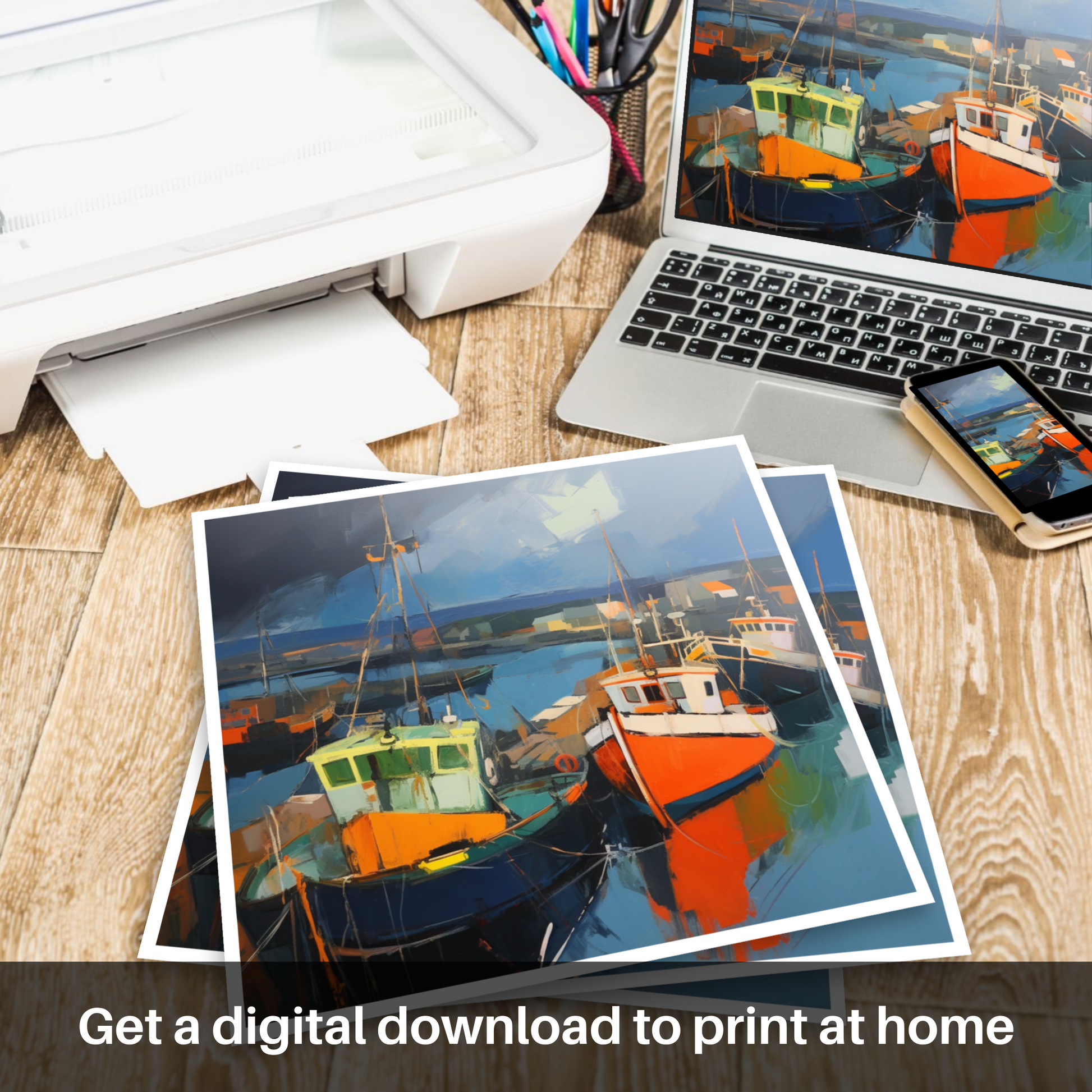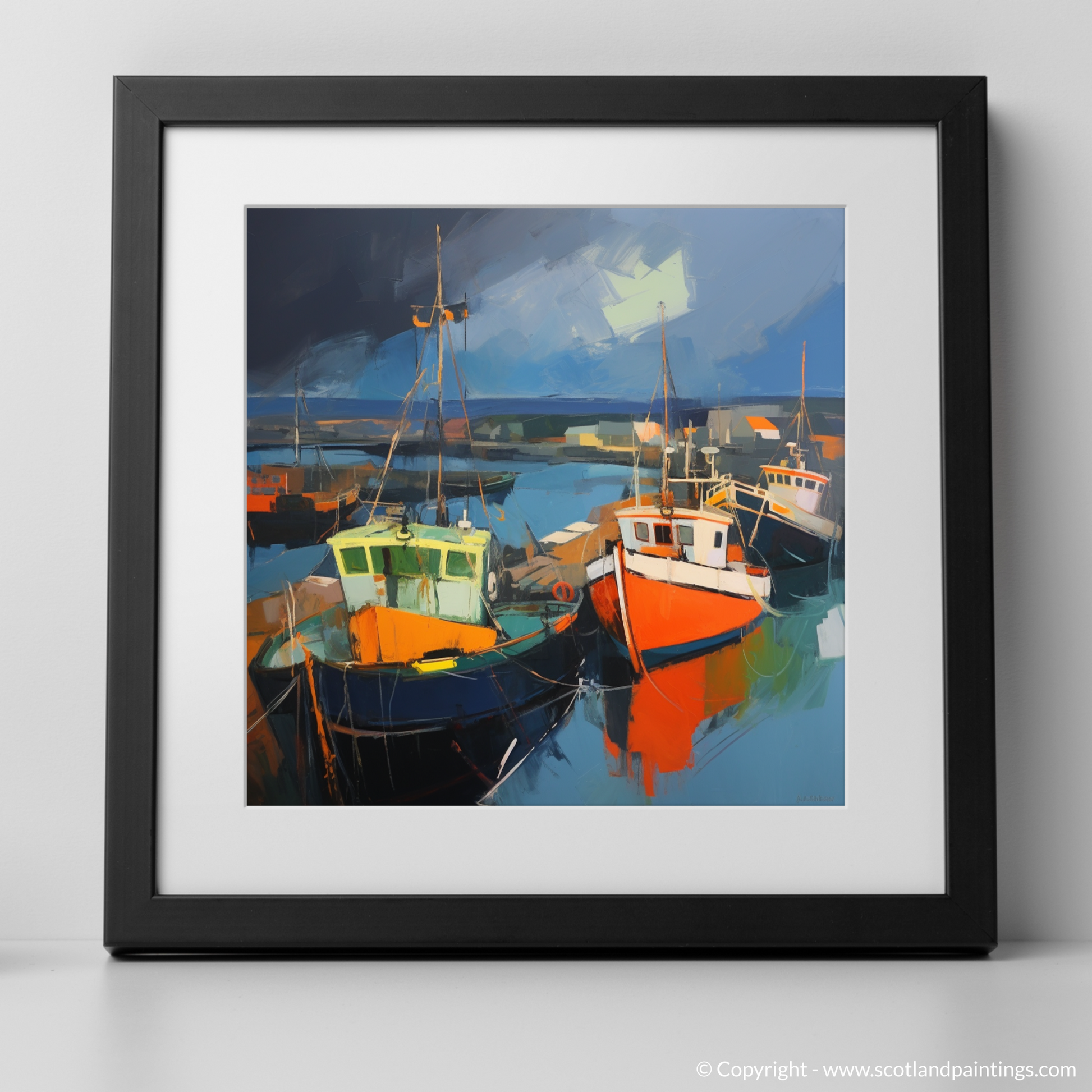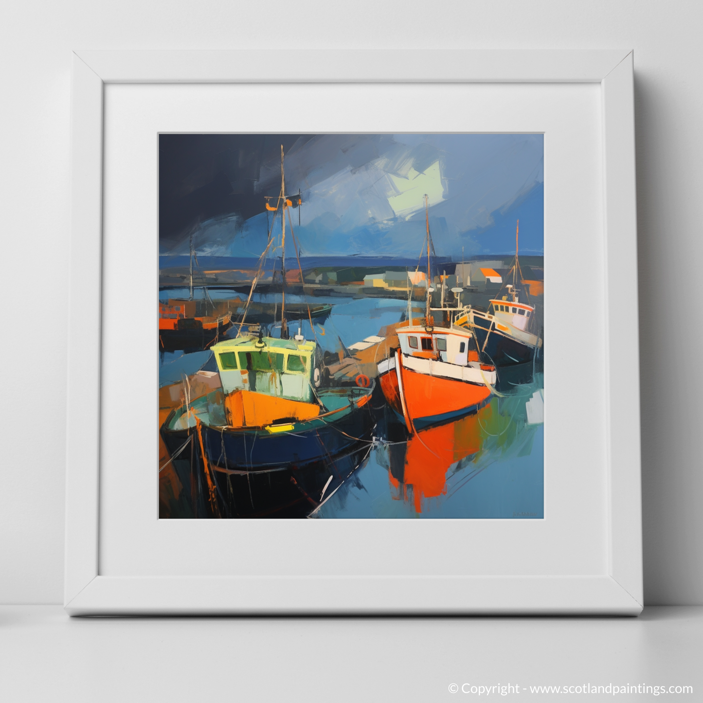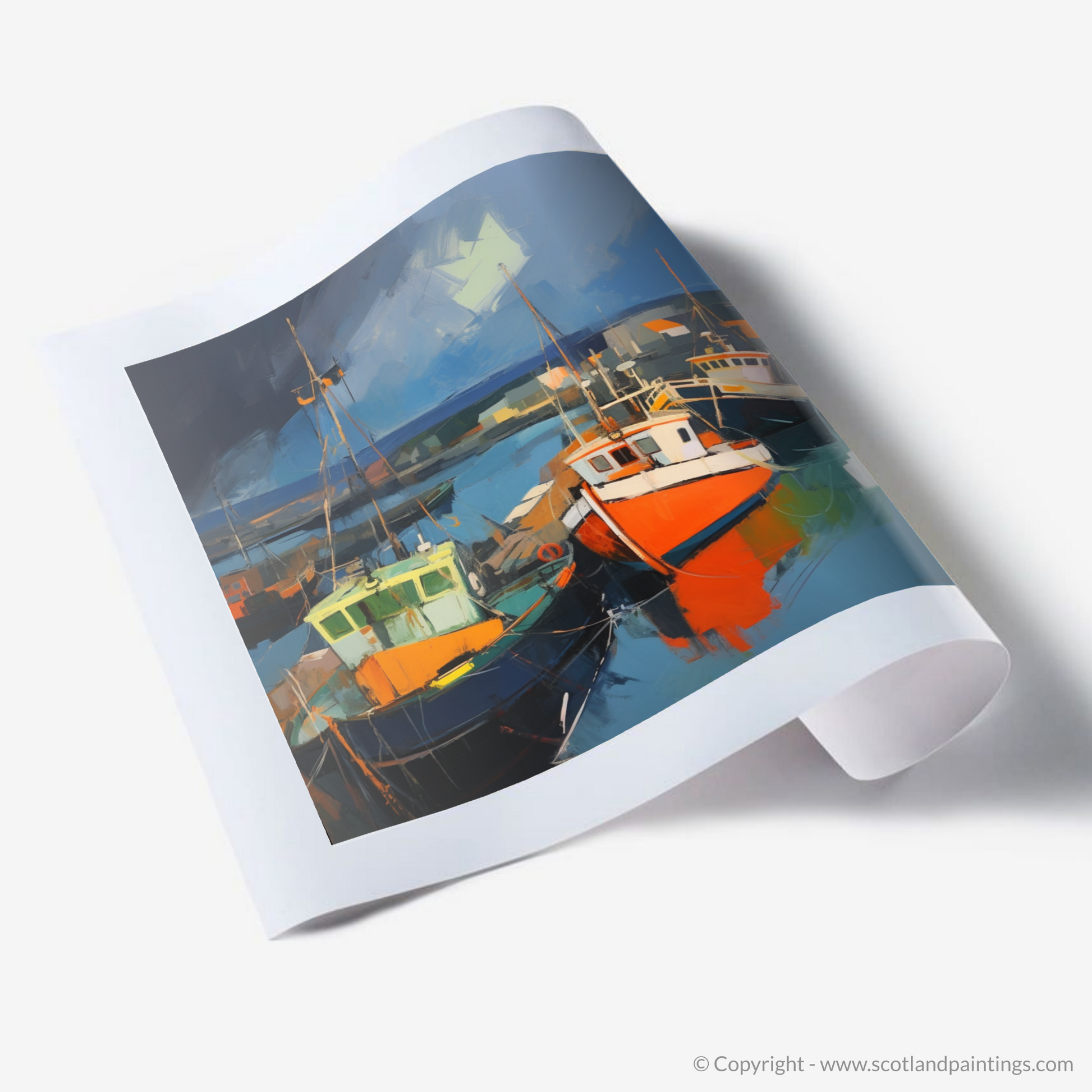 The contemporary interpretation of the harbour scene is charged with a dynamic tension, as the composition balances the stillness of the boats against the impending movement suggested by the chaotic sky. This print from the 'Scottish Harbours' collection encapsulates the spirit of a coastal community that stands resilient against the whims of nature—a testament to both the beauty and the challenges posed by the Scottish seascape.