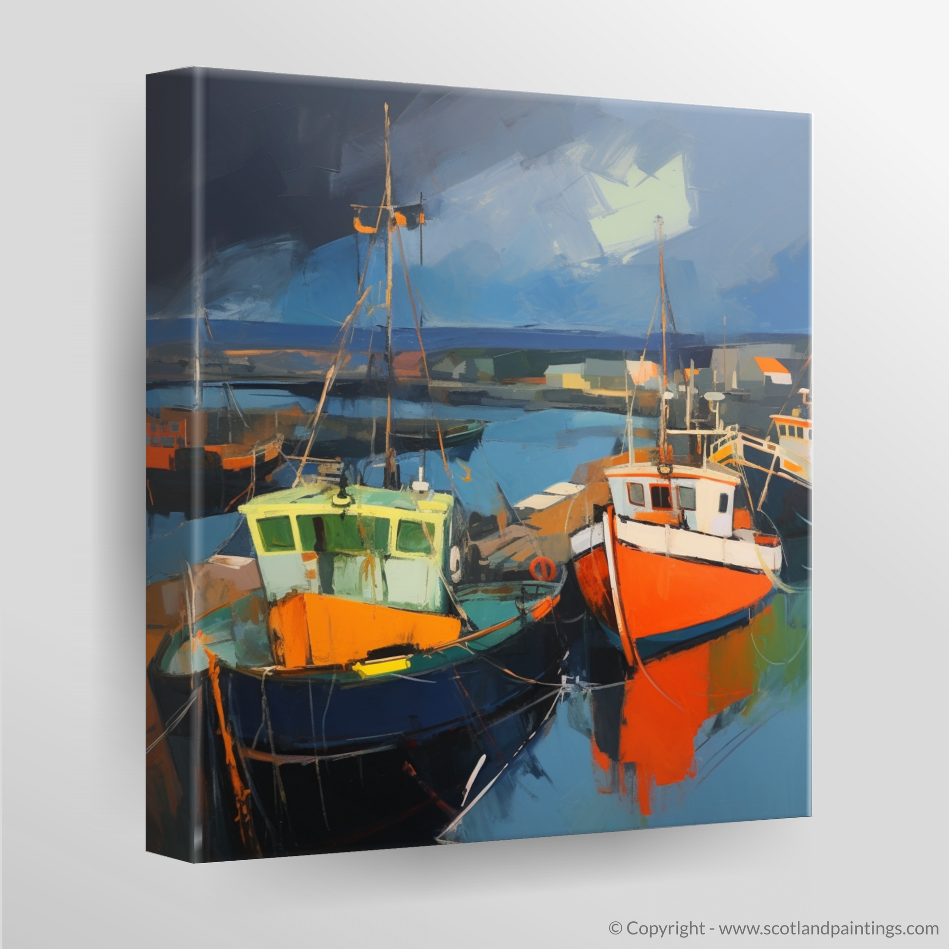 Capturing the dynamic essence of Scotland's rugged coastlines, this evocative piece invites you on a sensory journey to Macduff Harbour, where the mood of the sea is as mercurial as the shifting skies. Bold, sweeping strokes of deep blues and greys dominate the canvas, giving life to a tempestuous sky that broods over steadfast vessels.