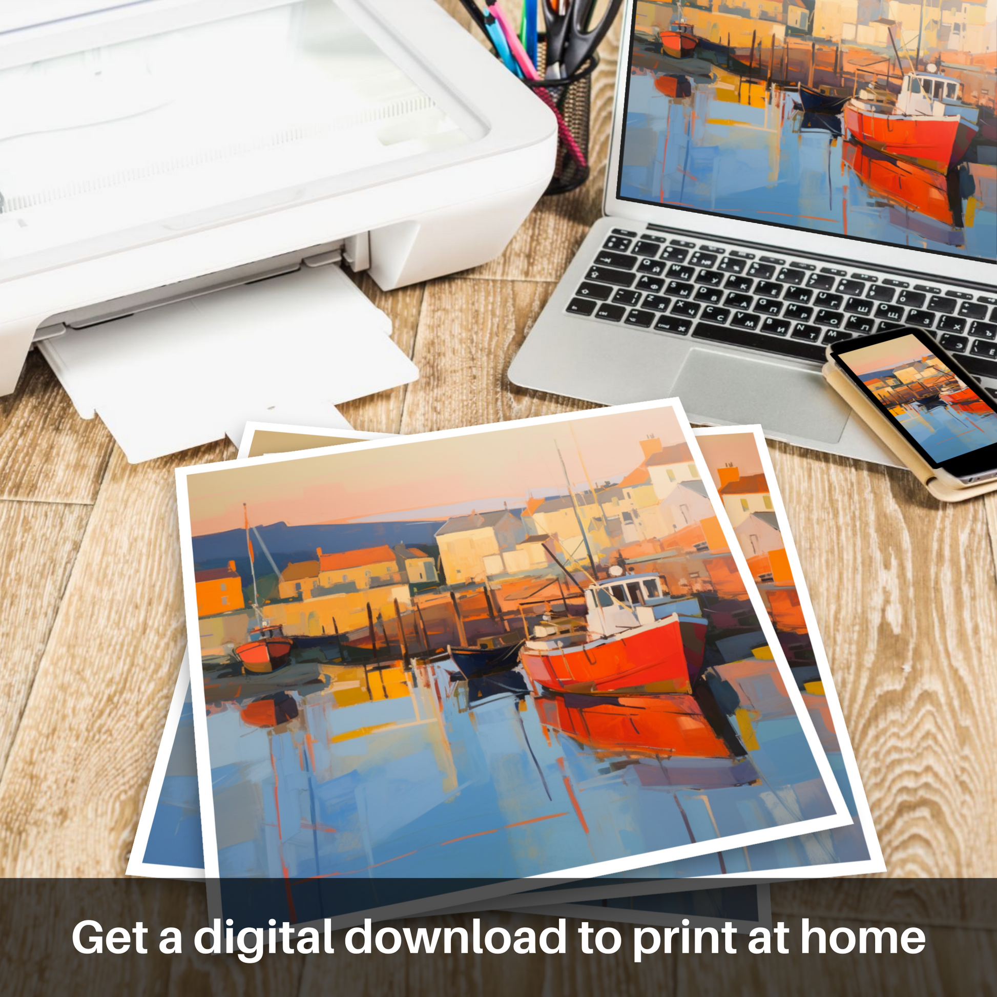Characterised by broad, expressive brushstrokes that deliver a contemporary twist to the timeless setting, the artwork is a harmonious blend of abstraction and realism. Colours transition with an almost musical quality, from the cool blues of the reflecting water to the muted purples of the distant hills, each tone perfectly orchestrated to capture the serene atmosphere of the Scottish harbour at this most magical time of day.