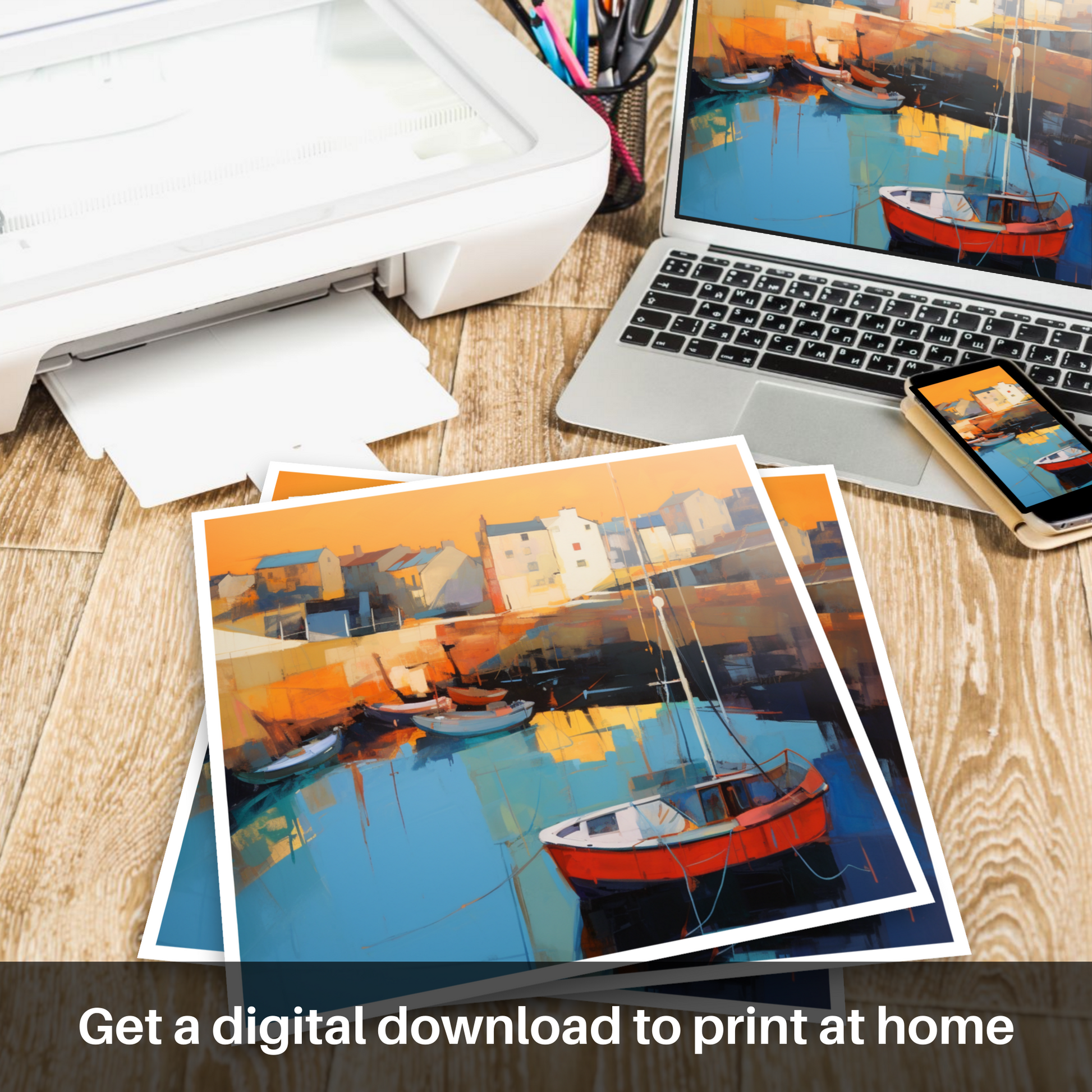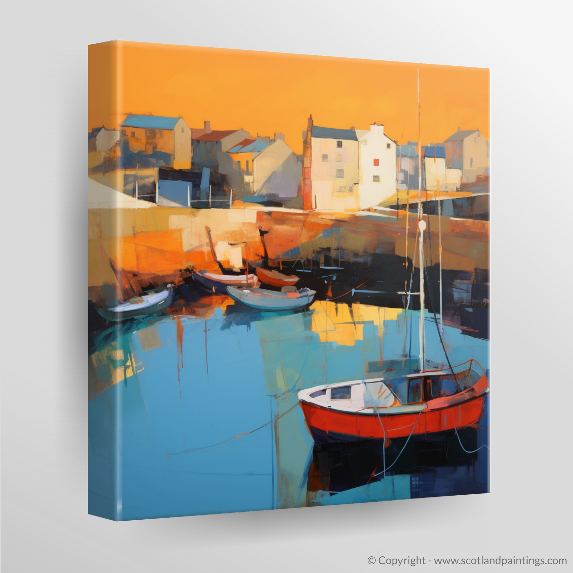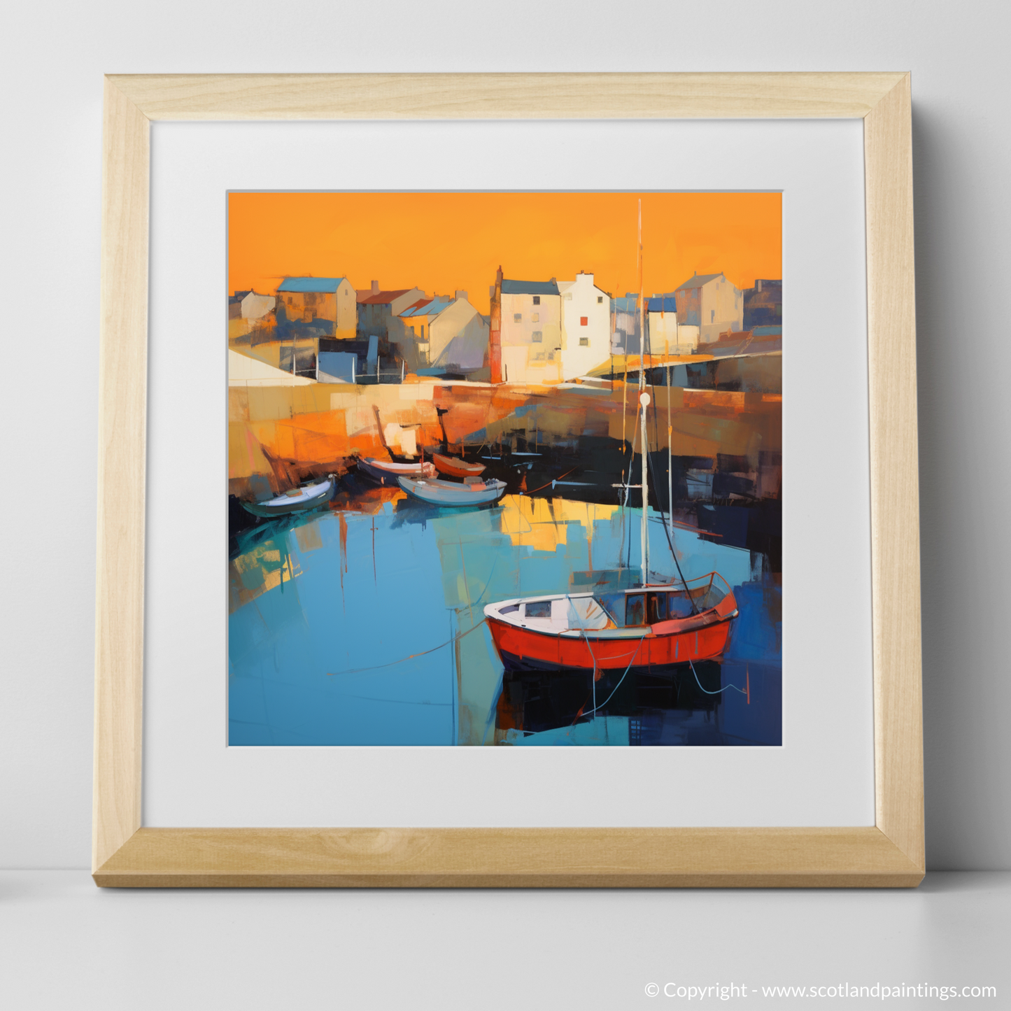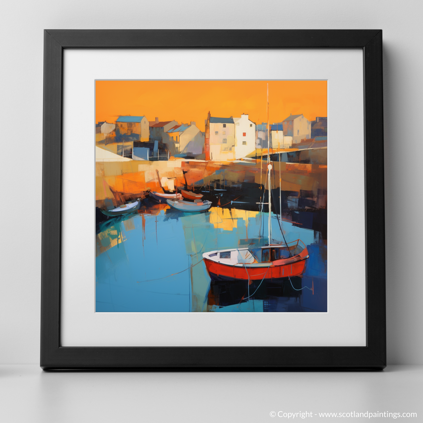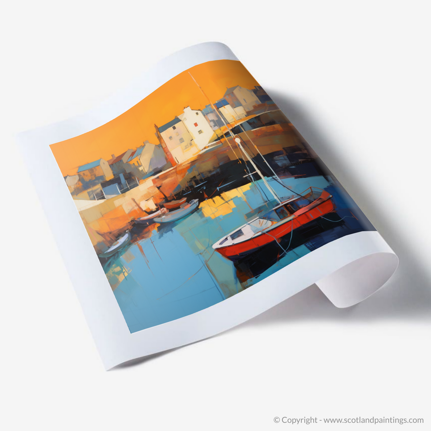 Immerse yourself in the warm glow of golden hour at Dunbar Harbour with this evocative abstract impressionist print. Capturing the serene beauty of the Scottish coast, the artwork transports viewers to a tranquil seaside moment where time appears to stand still.