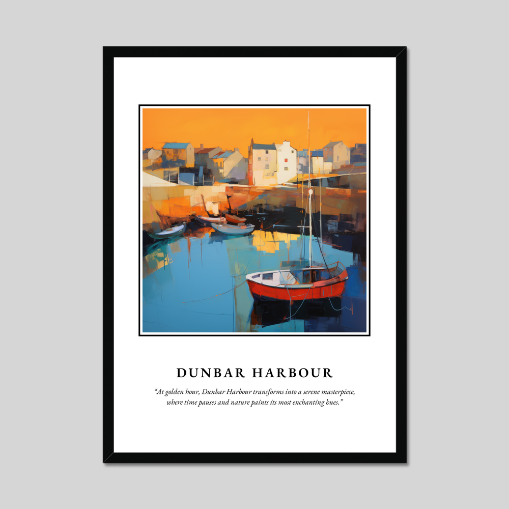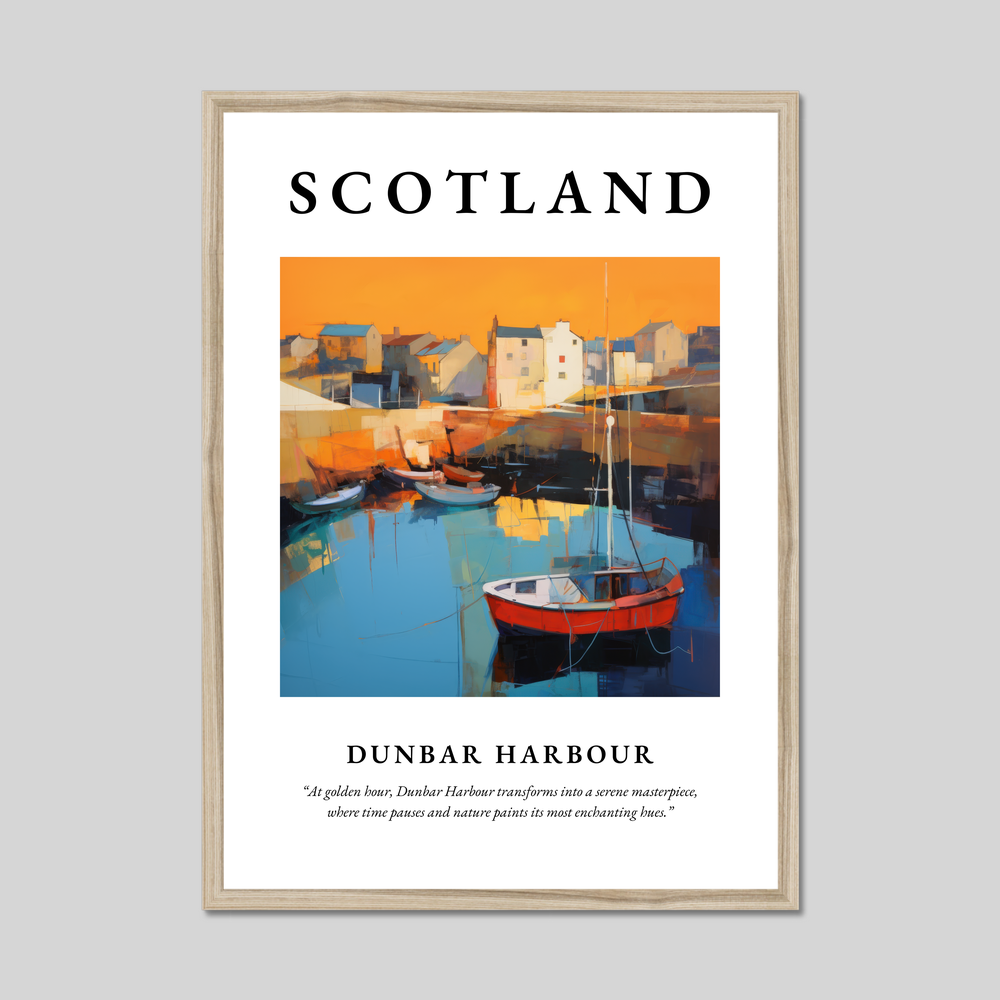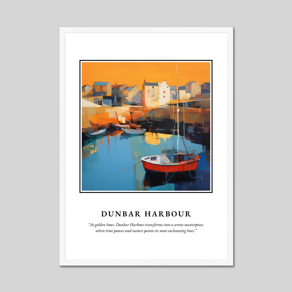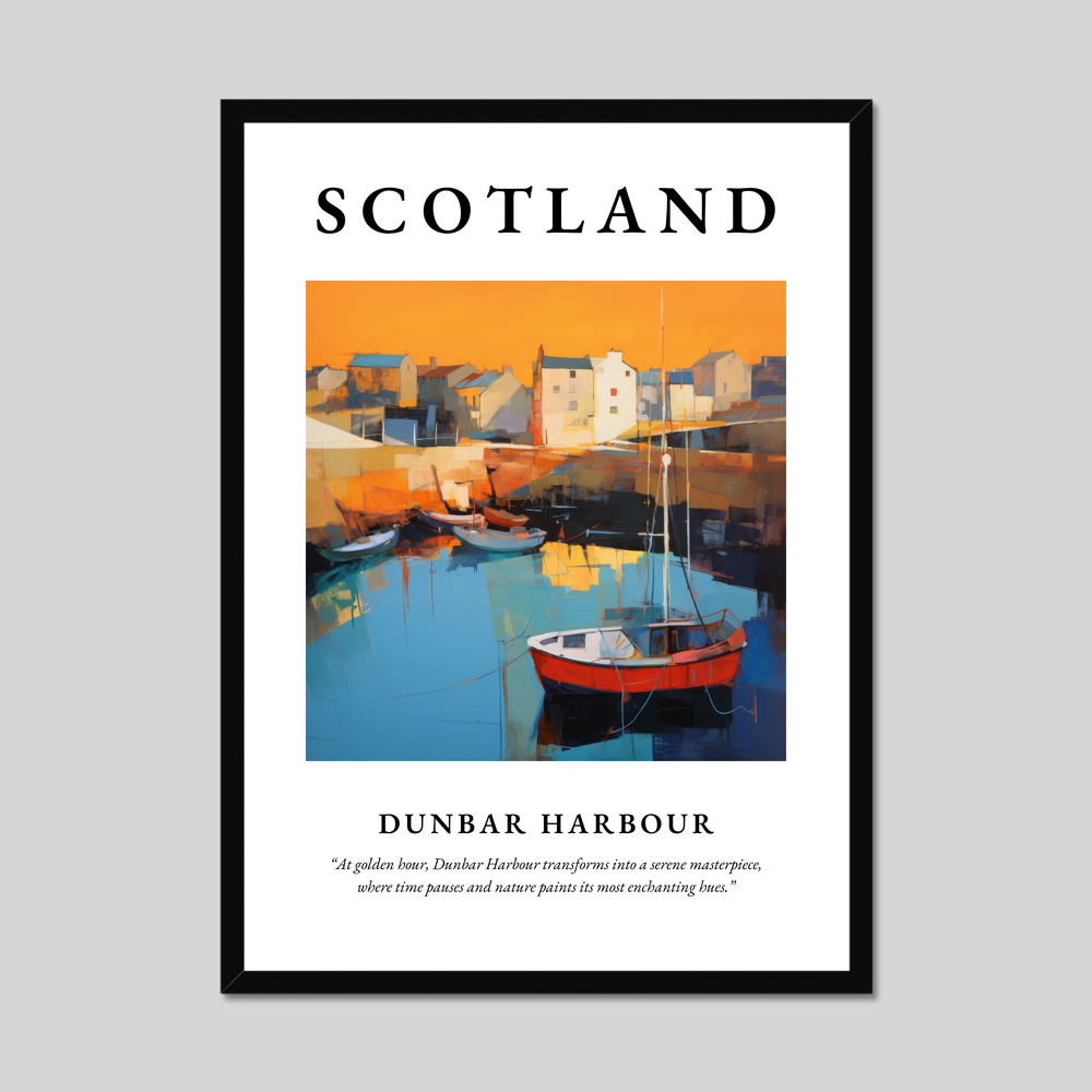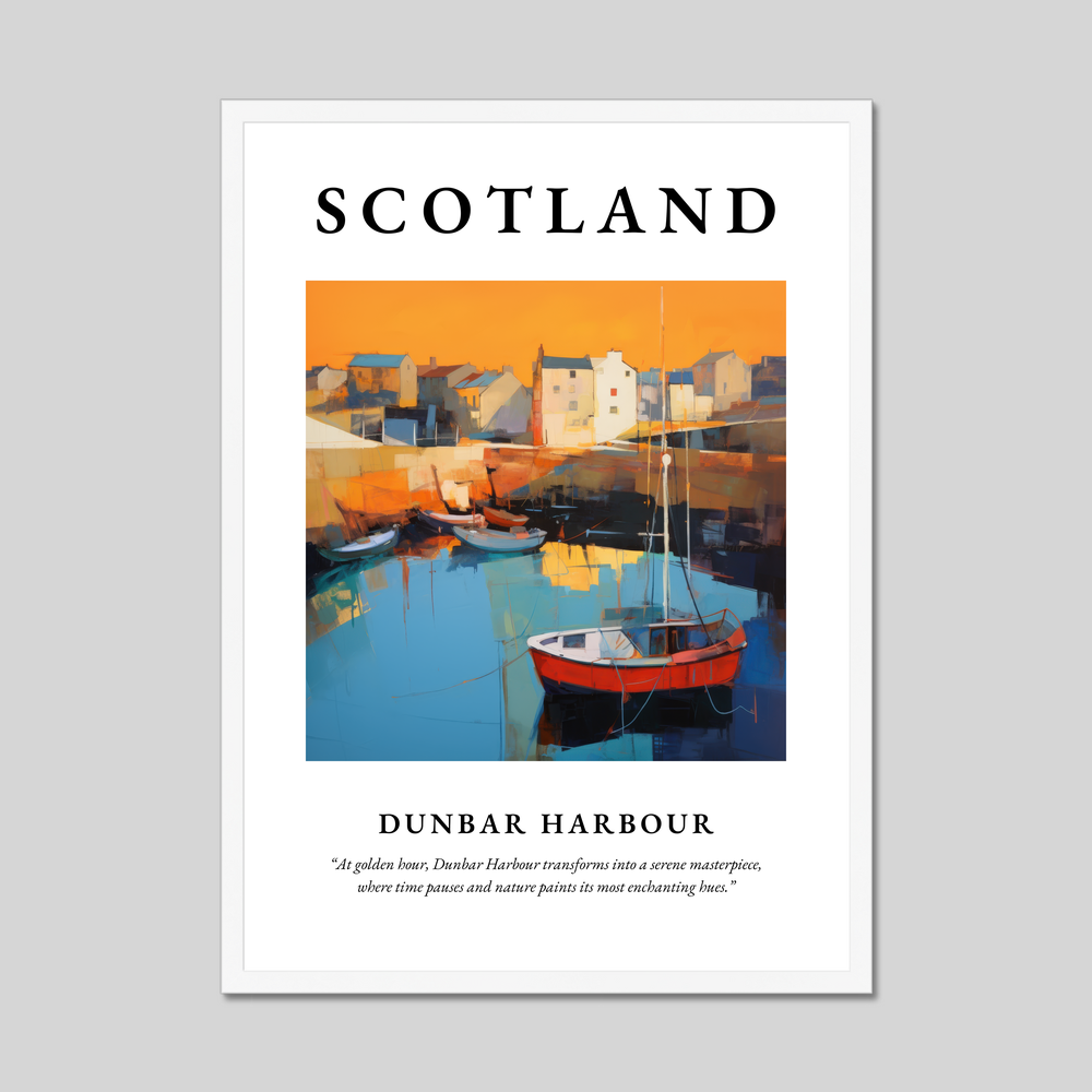 Featuring the word “SCOTLAND” in bold, evocative lettering, the poster draws your eye down to an abstract impressionist painting of Dunbar Harbour. The vibrant hues and expressive brushstrokes create a captivating scene where boats rest gently on the water, and quaint buildings bask in the soft glow of the golden hour. Beneath the painting, the quote, “At golden hour, Dunbar Harbour transforms into a serene masterpiece, where time pauses and nature paints its most enchanting hues,” perfectly encapsulates the atmosphere of the moment.