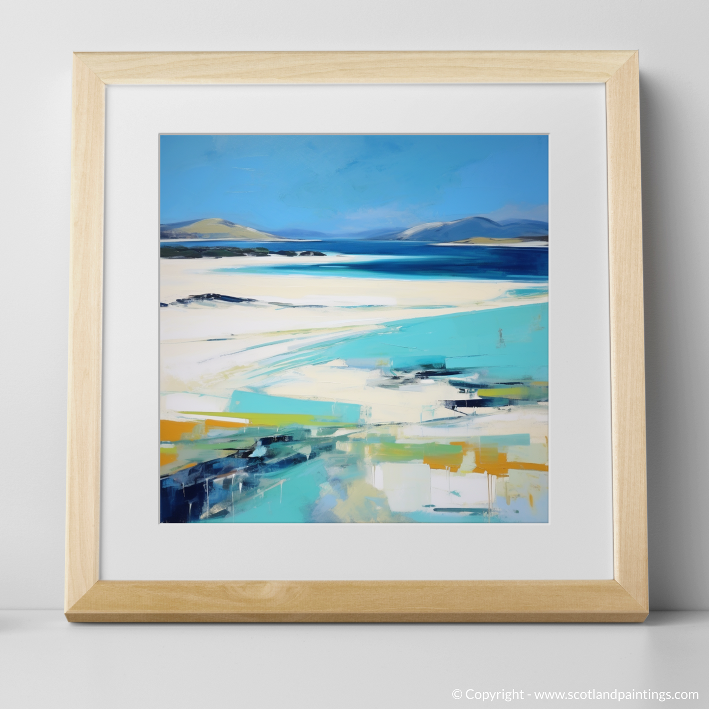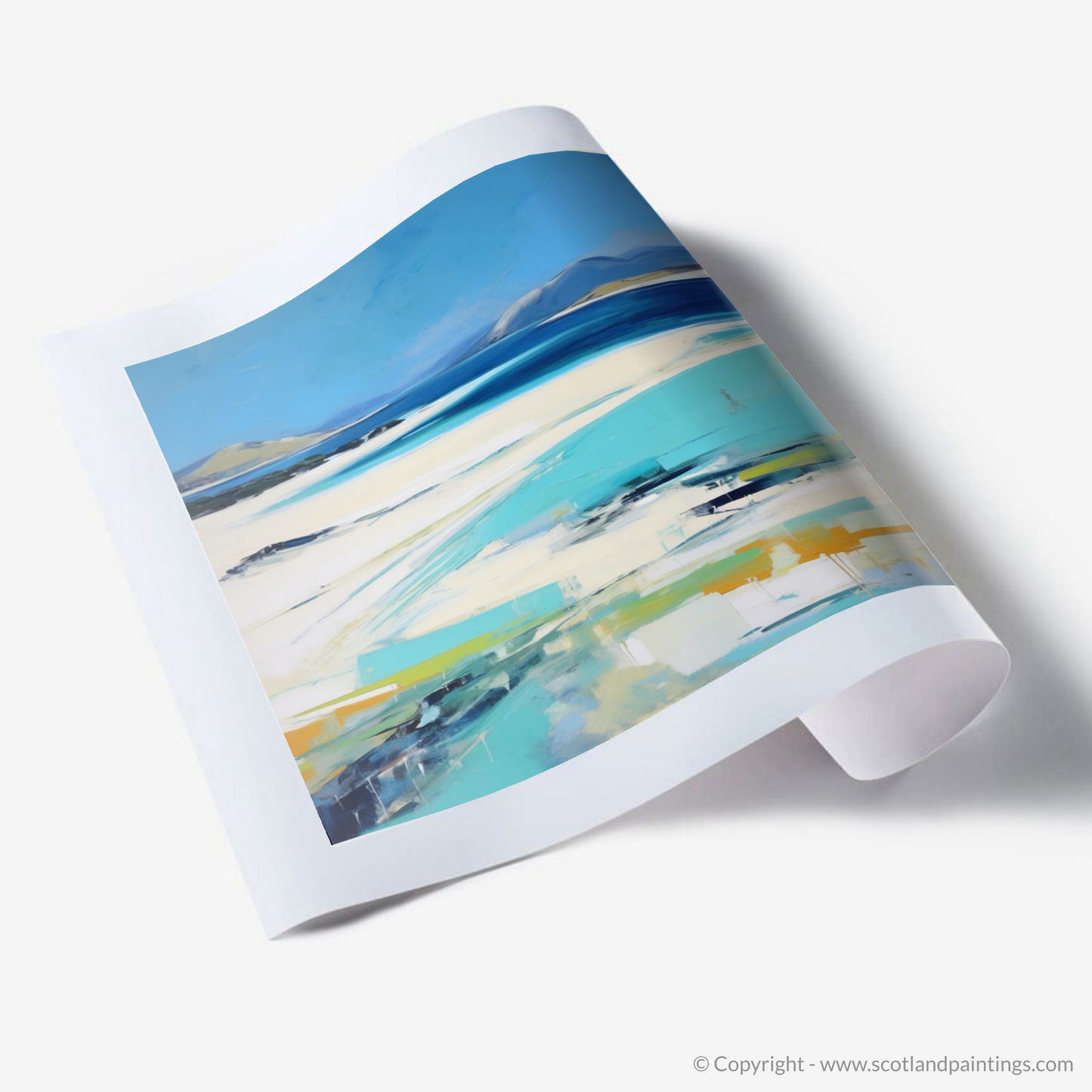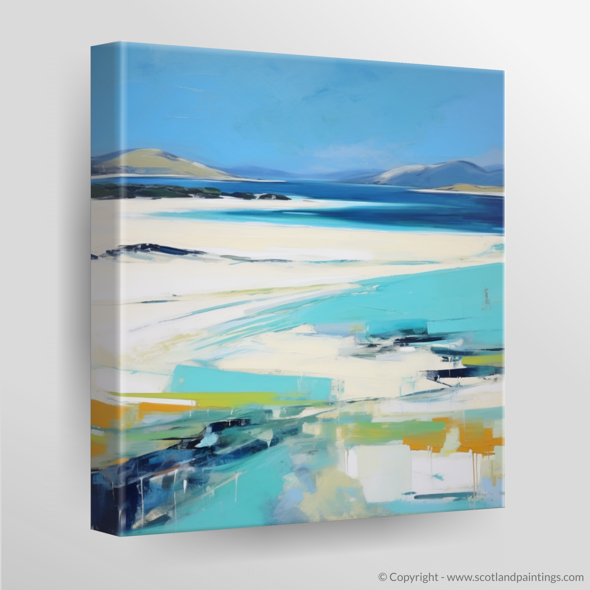 Immerse yourself in the sweeping coastal vistas of the Outer Hebrides with this evocative abstract impressionistic representation of Seilebost Beach on the Isle of Harris. Cascading azure blues, which mimic the clear Hebridean waters, dominate the upper echelons of the composition, whilst the softer ivory and sandy tones evoke the pristine stretches of beach that make this location so cherished.
