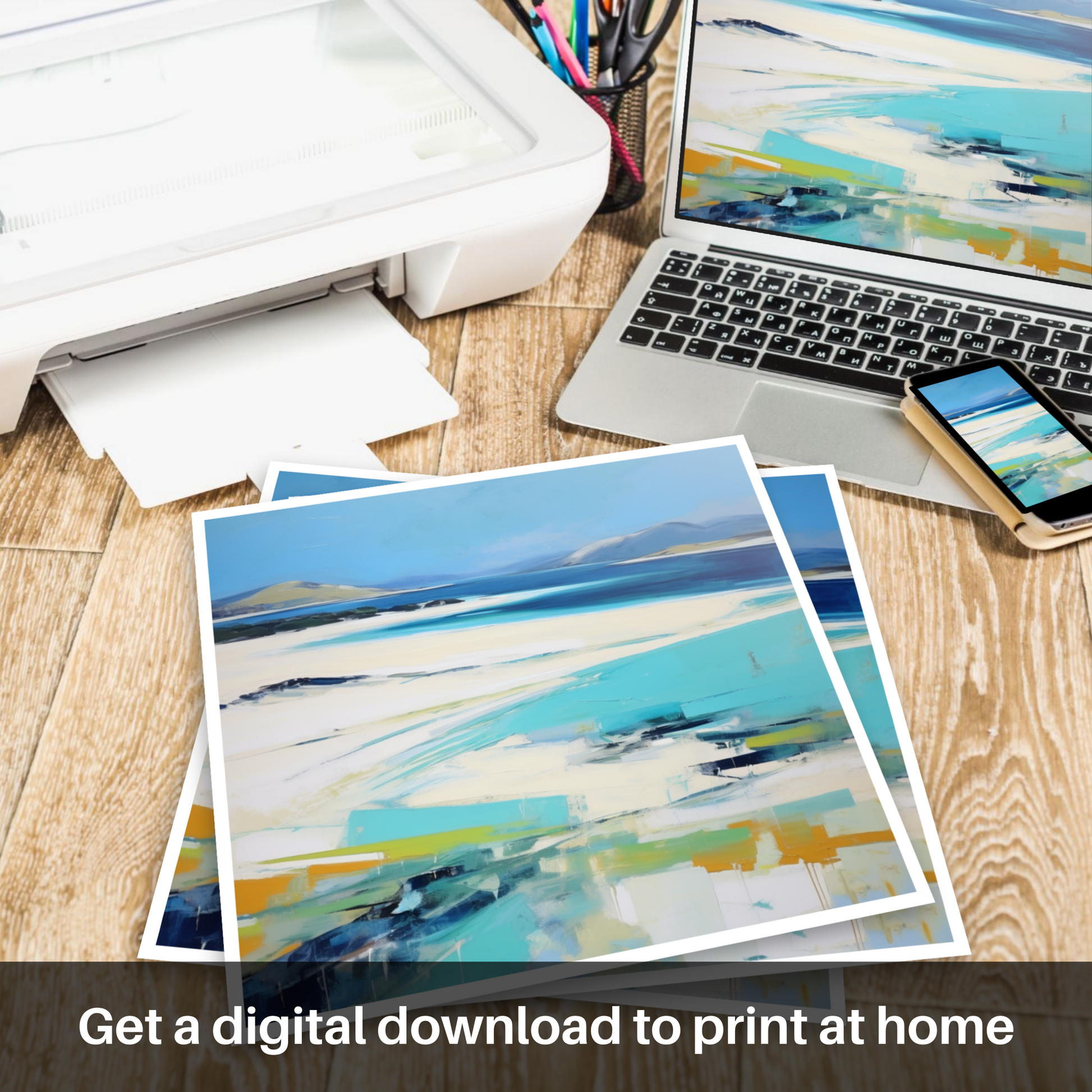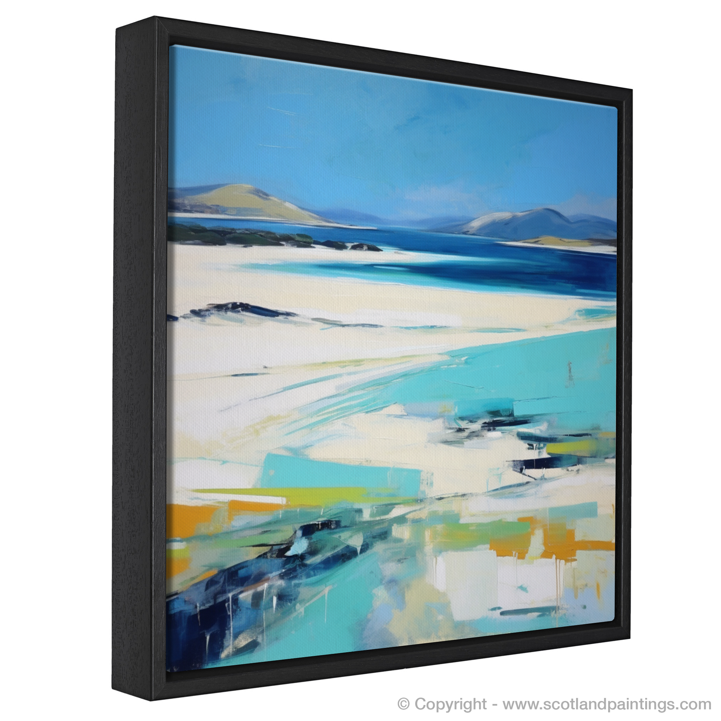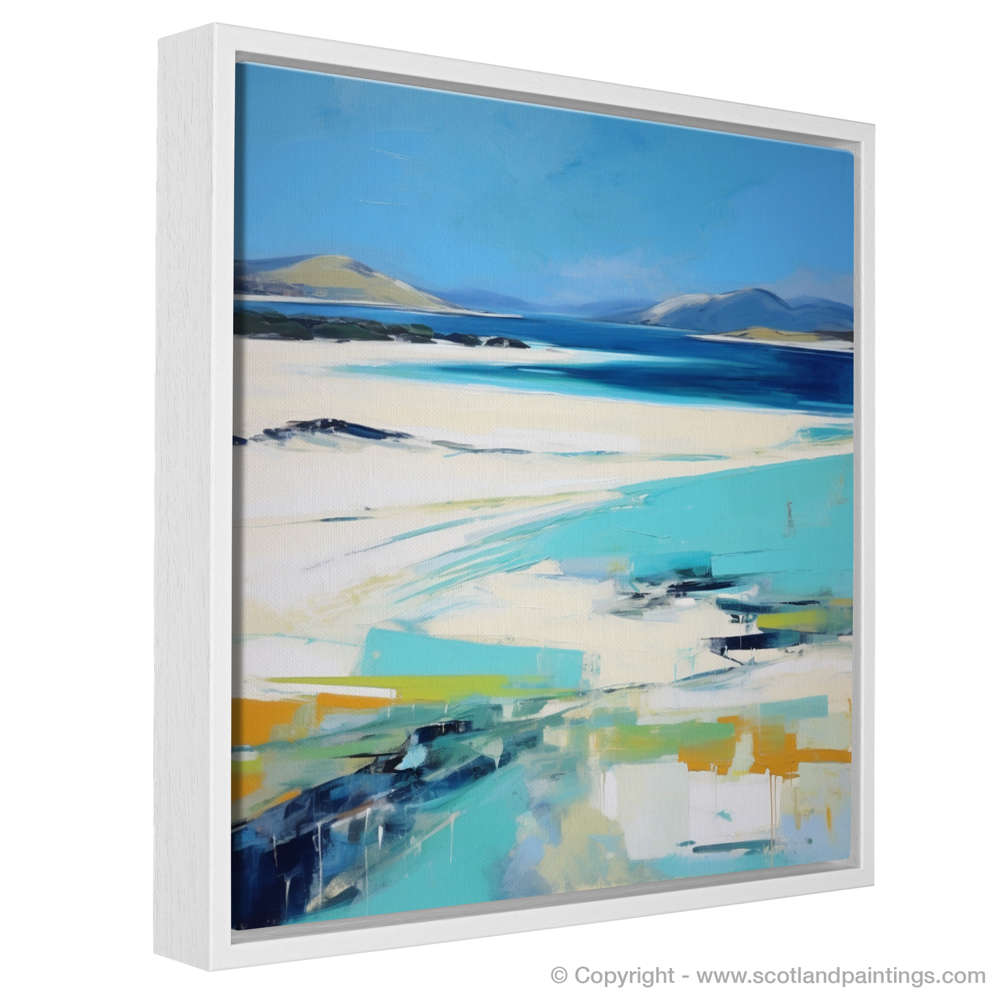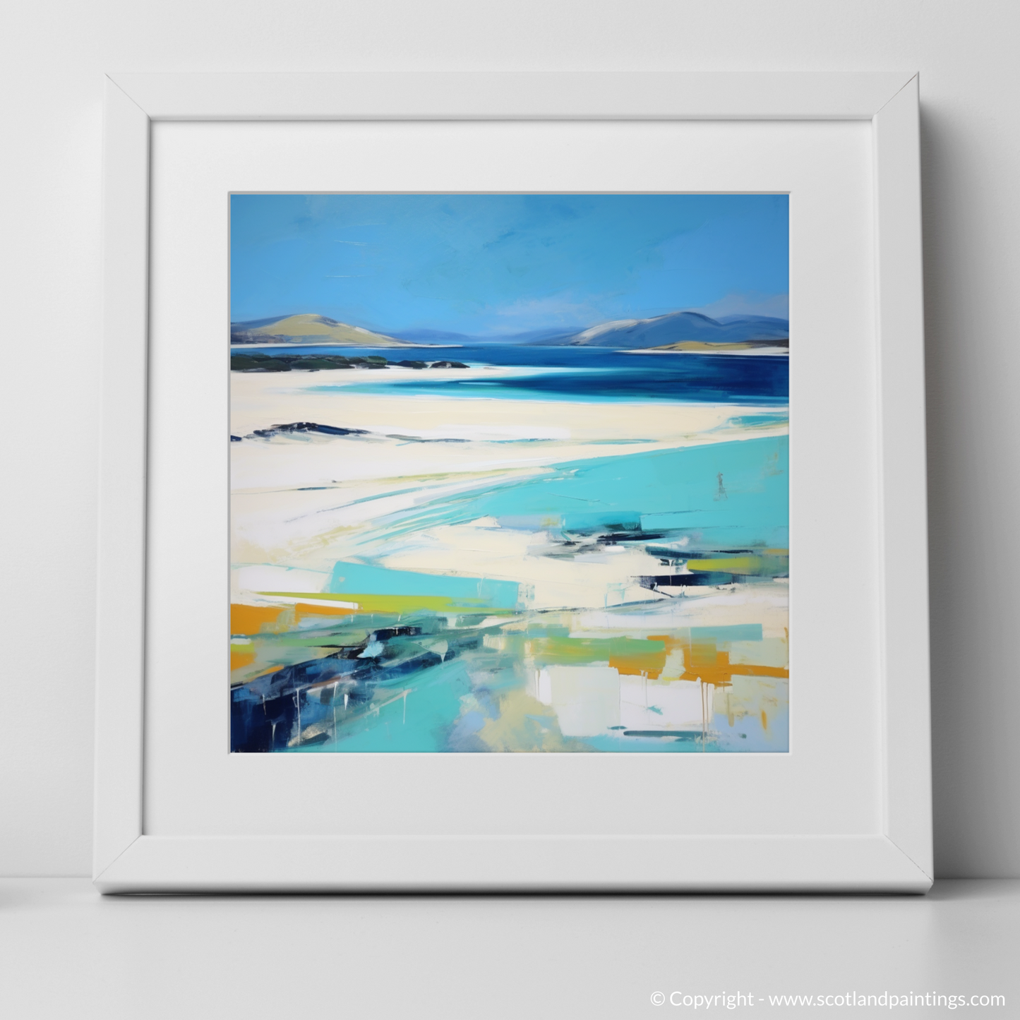 Immerse yourself in the sweeping coastal vistas of the Outer Hebrides with this evocative abstract impressionistic representation of Seilebost Beach on the Isle of Harris. Cascading azure blues, which mimic the clear Hebridean waters, dominate the upper echelons of the composition, whilst the softer ivory and sandy tones evoke the pristine stretches of beach that make this location so cherished.