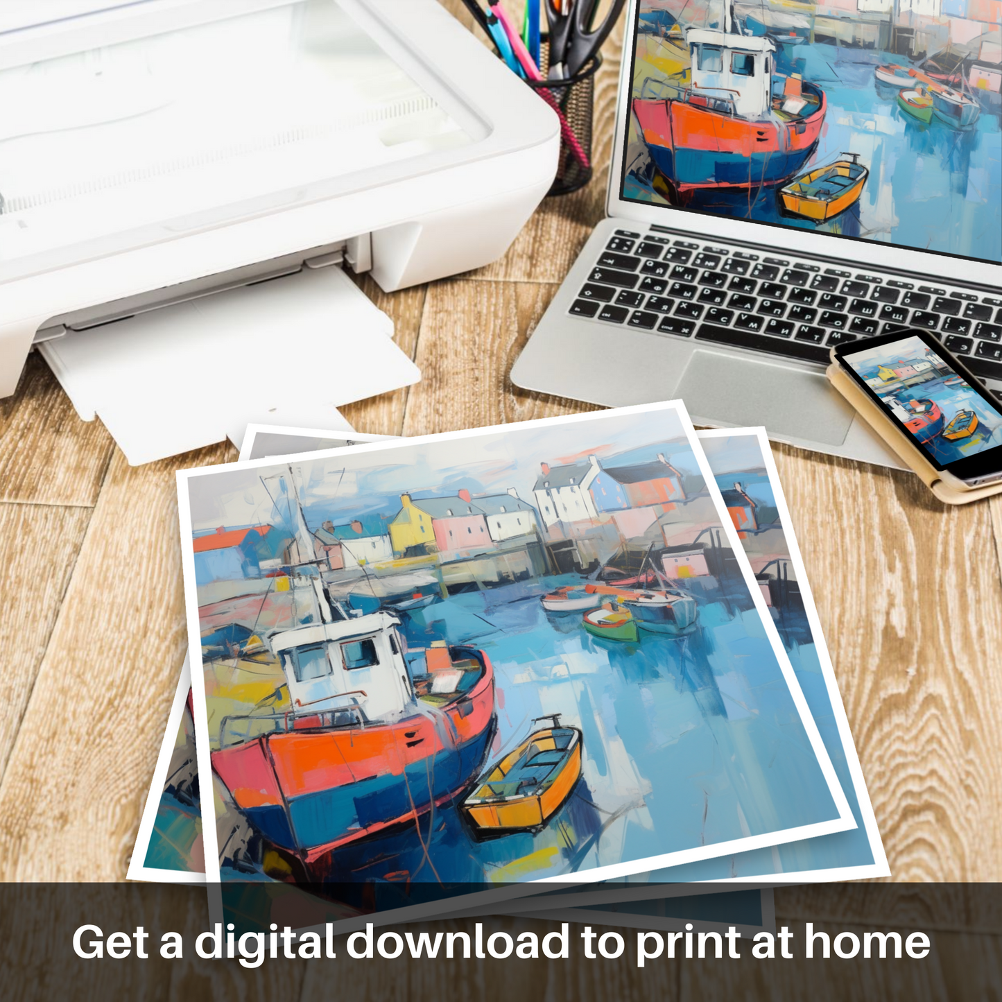 This expressive piece elicits more than the mere visual charm of Millport Harbour; it incites a sense of freedom and artistic rebellion, mirroring the unconstrained nature of the sea against the structured beauty of the isle's haven. This print is a bold statement, perfect for adding a burst of inspiration and colour to any living space or gallery wall. Collect a slice of Scottish maritime splendour with this abstract print, where the traditional meets the modern through an exuberant symphony of form and colour.