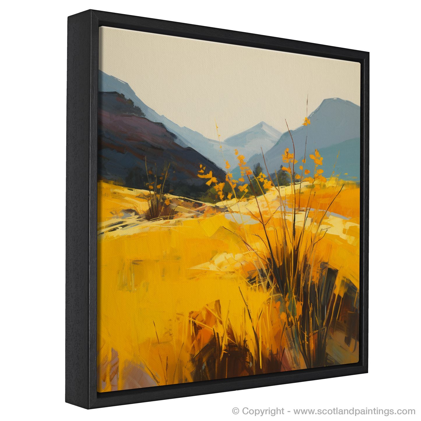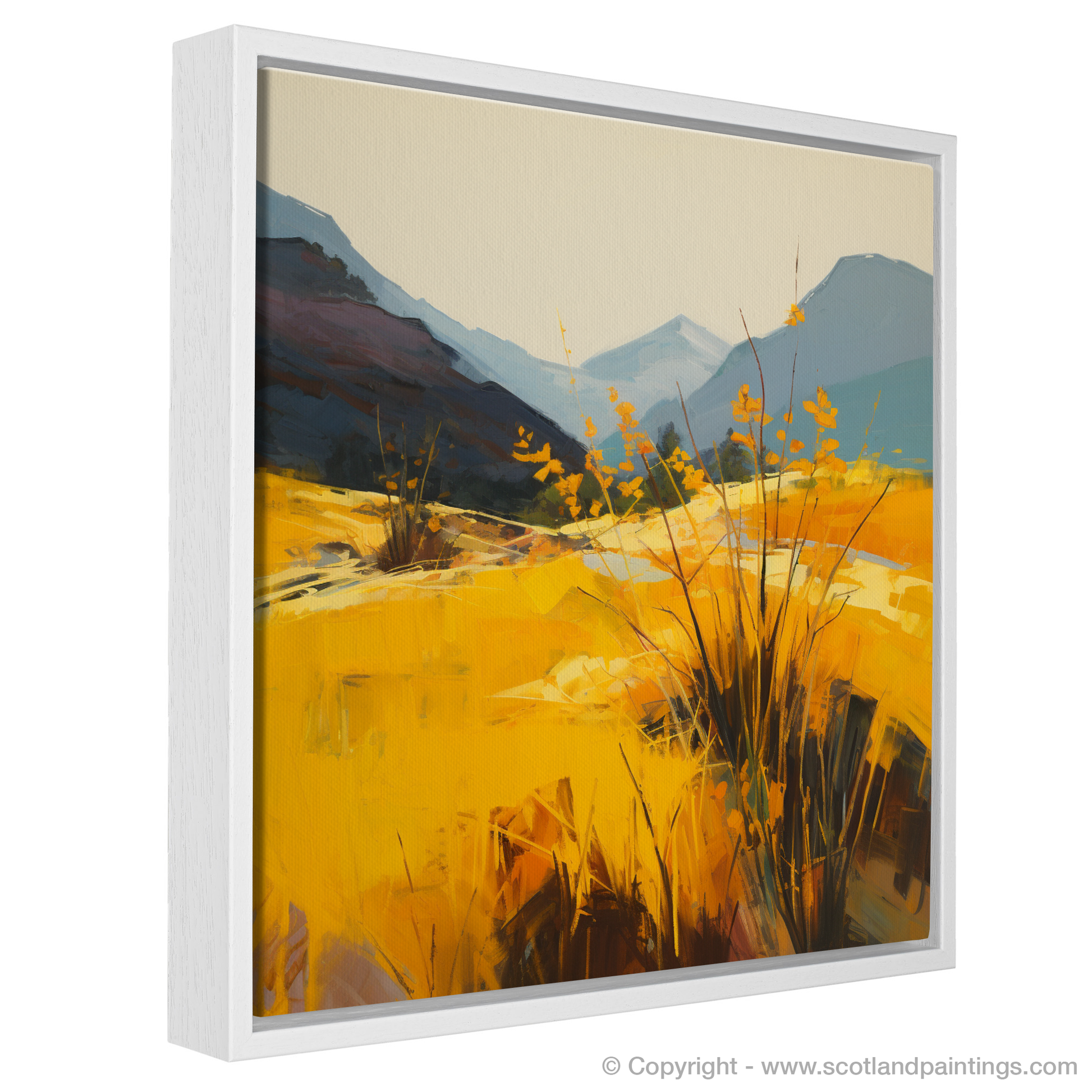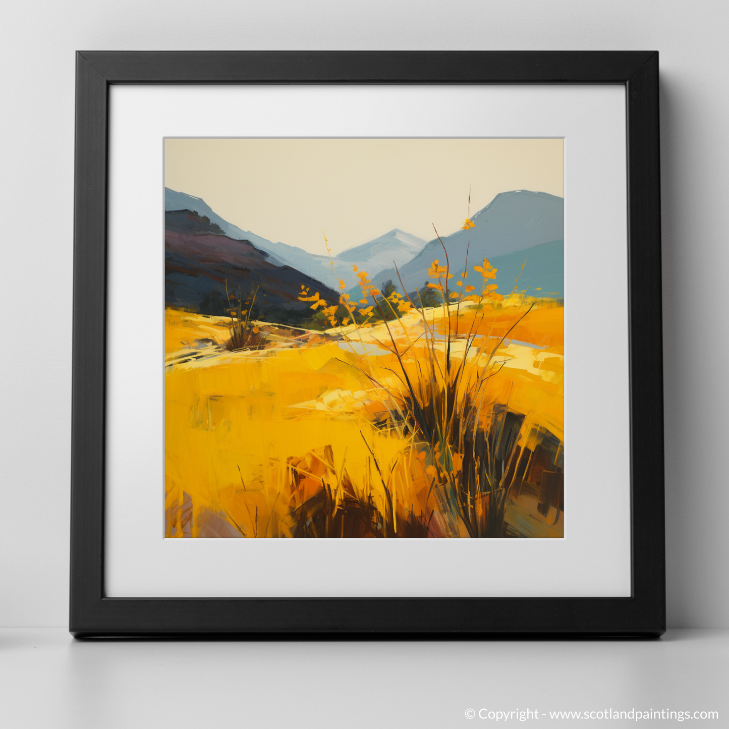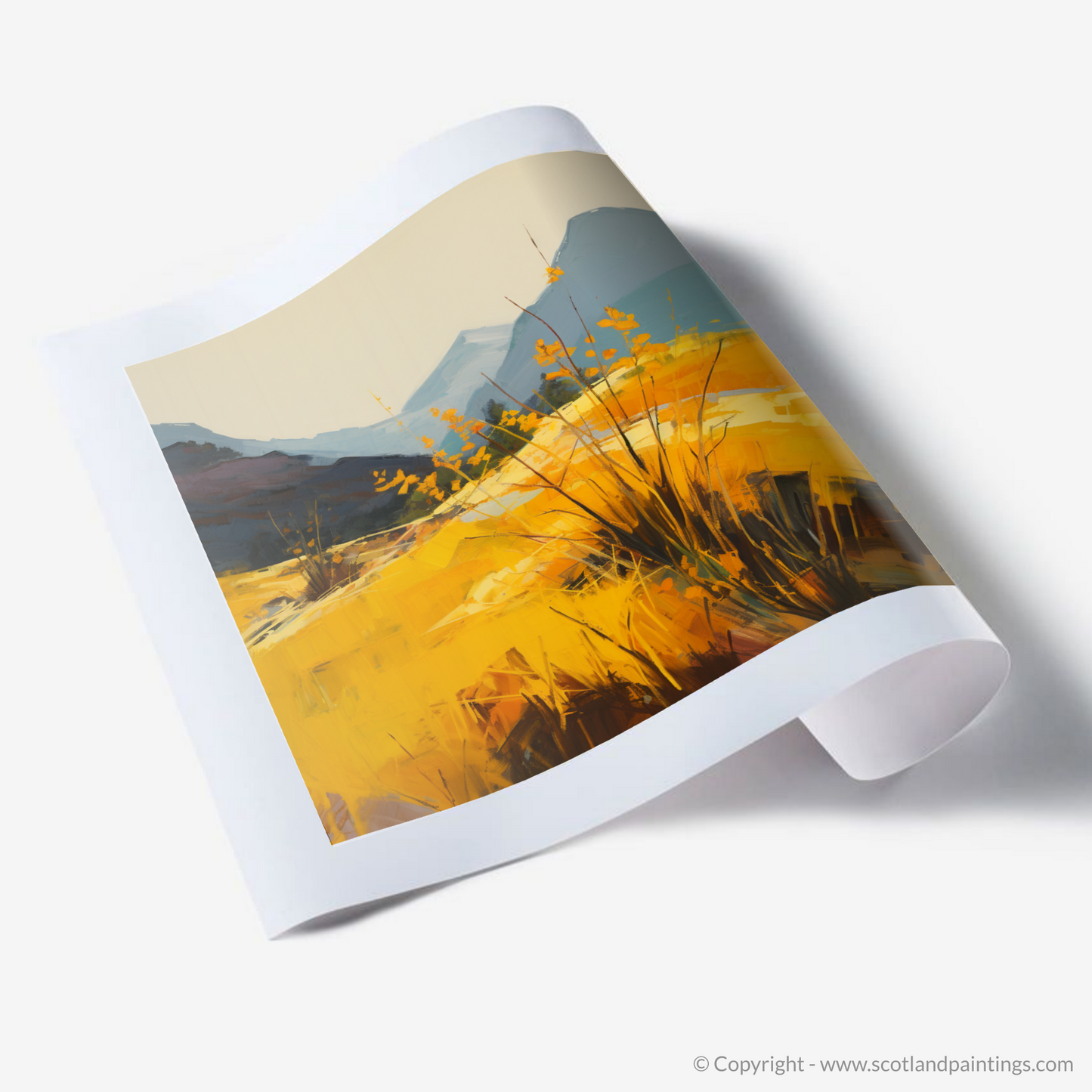 Amidst the wild beauty of Glencoe, our latest print captures the effervescent glow of golden bracken under the tender caress of sunlight. Vivid hues of yellow and amber dominate the foreground, bringing warmth and vibrancy to the scene, as if the bracken itself is radiating the serene light of the setting sun. Bold brushstrokes convey the dynamic textures of the foliage, contrasting exquisitely with the smooth washes that sculpt the distant mountains.