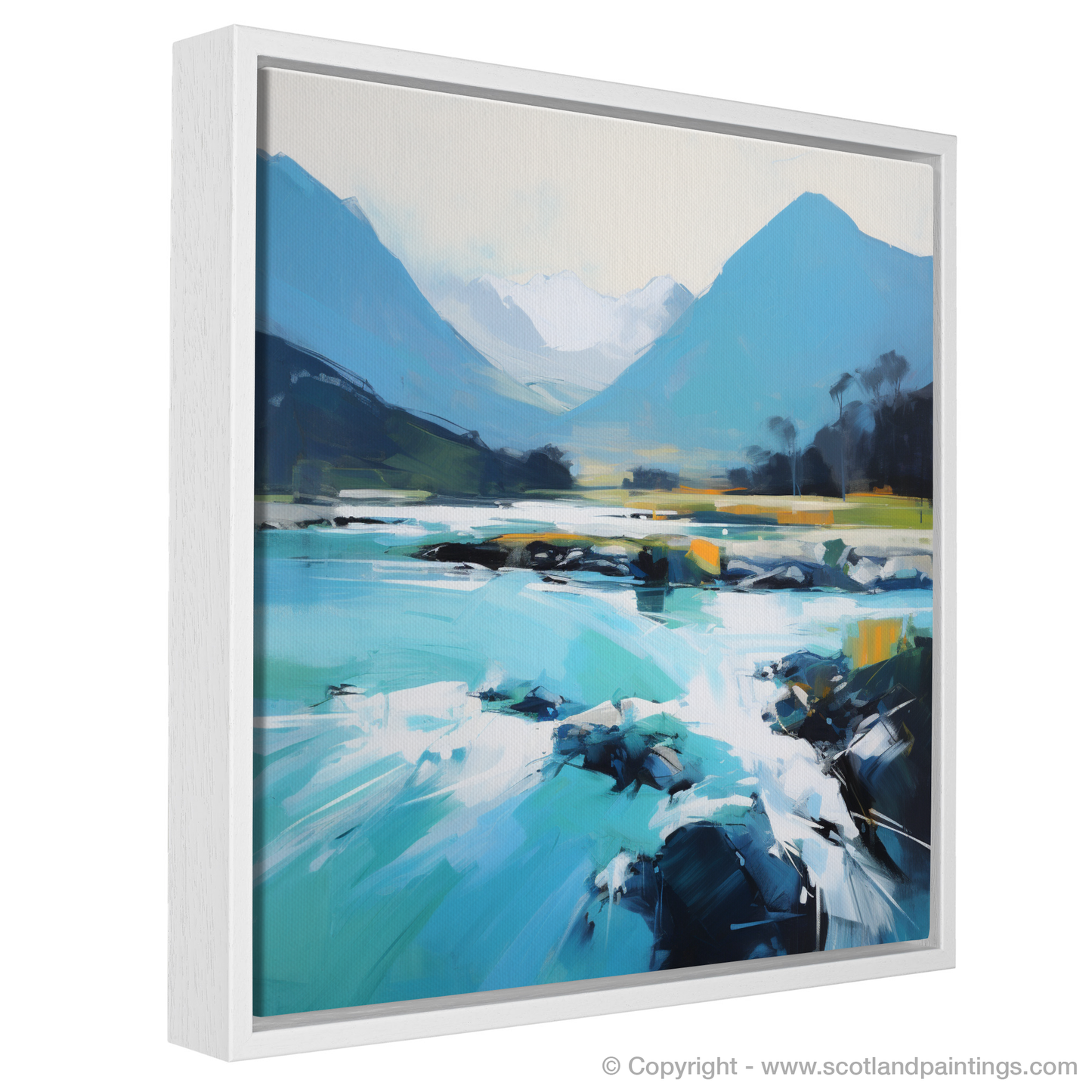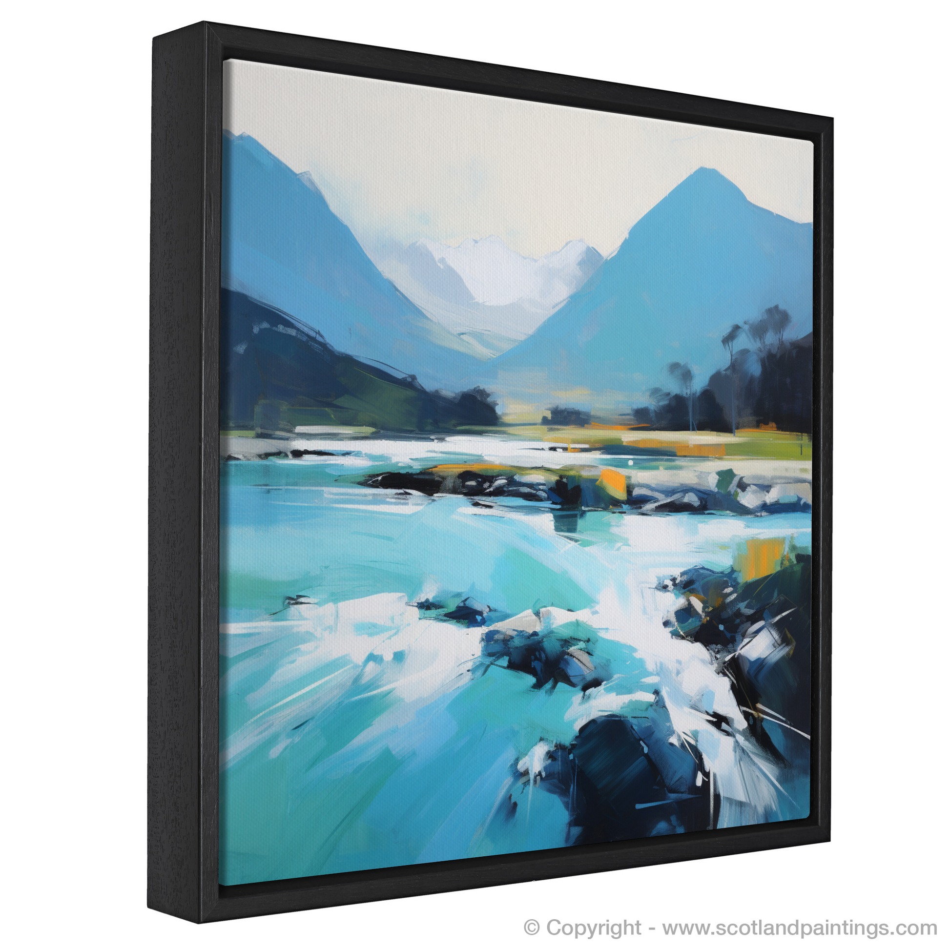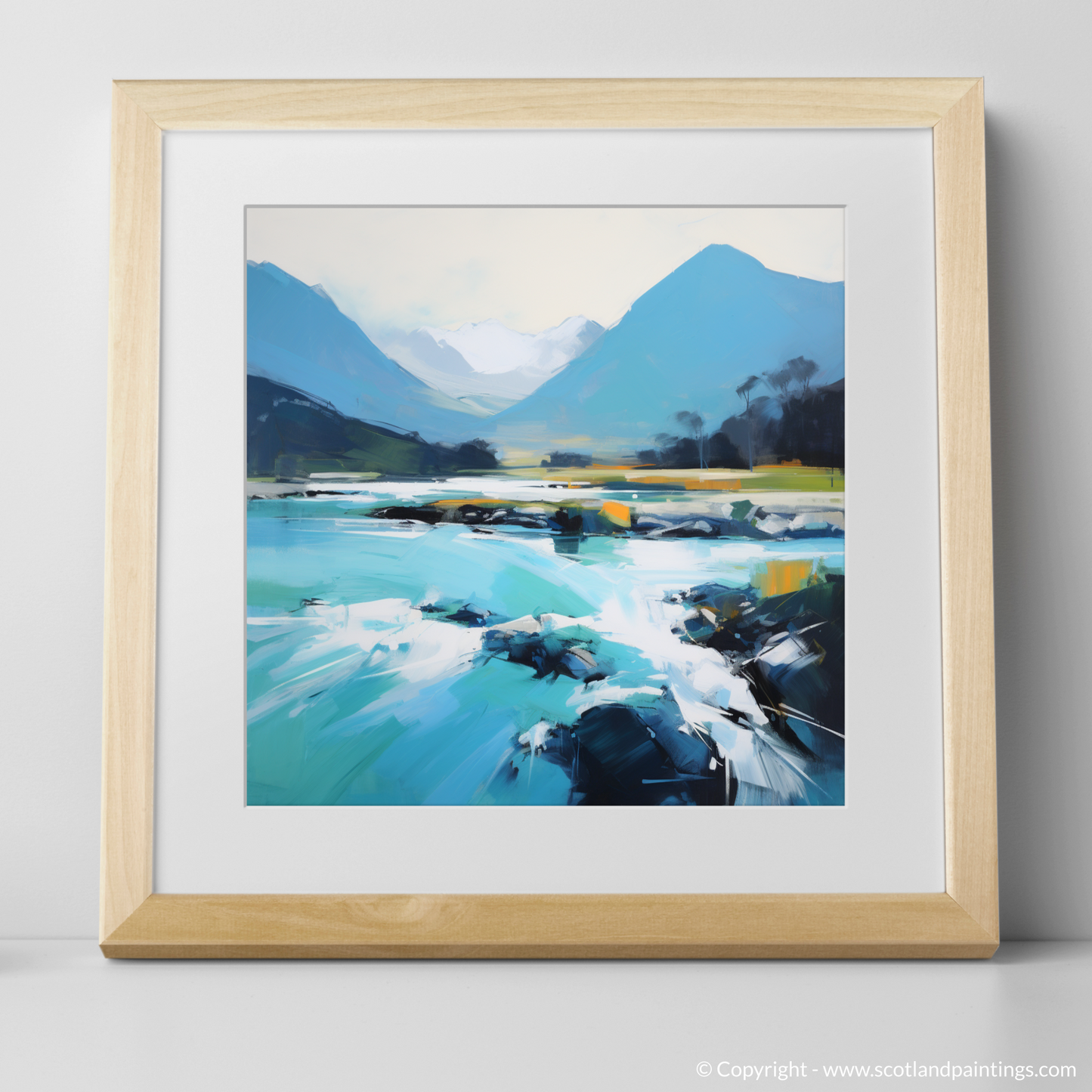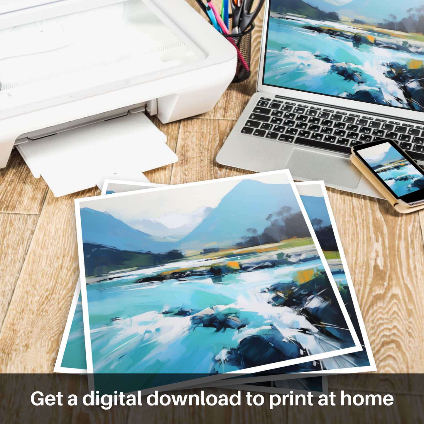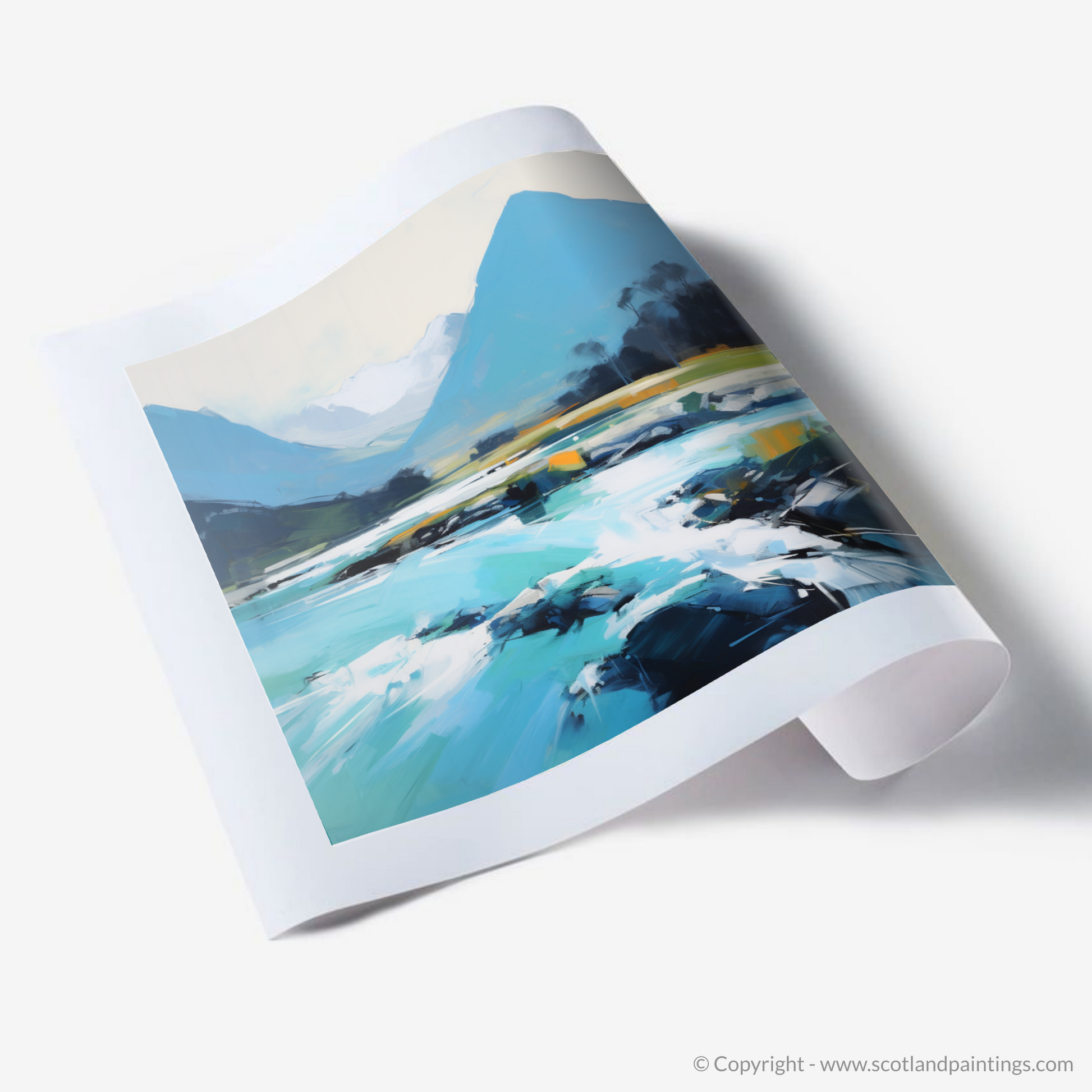 Invoking the wild and untamed spirit of Scotland's natural landscapes, this vibrant print captures the dynamic essence of River Etive, located in the picturesque region of Argyll and Bute. Rendered in a contemporary style, the piece showcases broad, expressive brushstrokes and a captivating interplay of light and colour, which seems to dance across the canvas, immersing the viewer in the scene’s natural beauty.