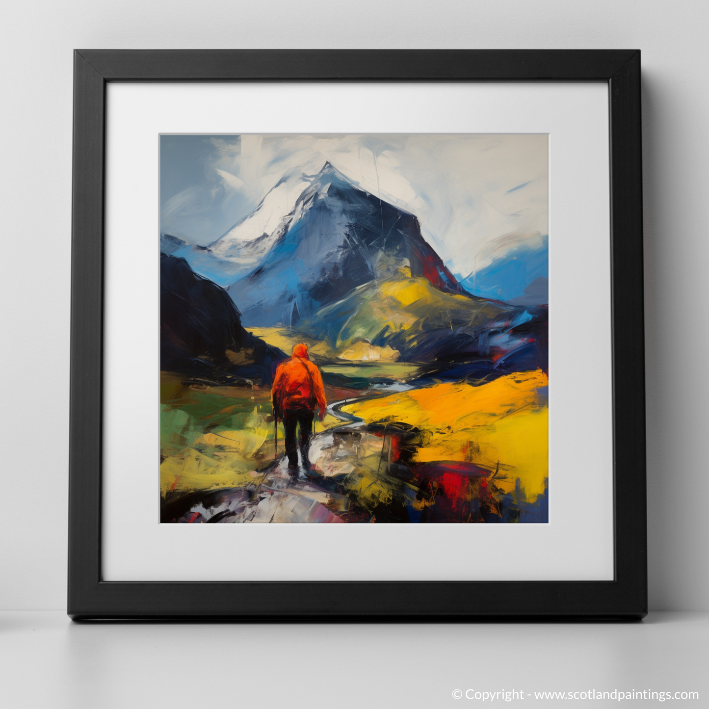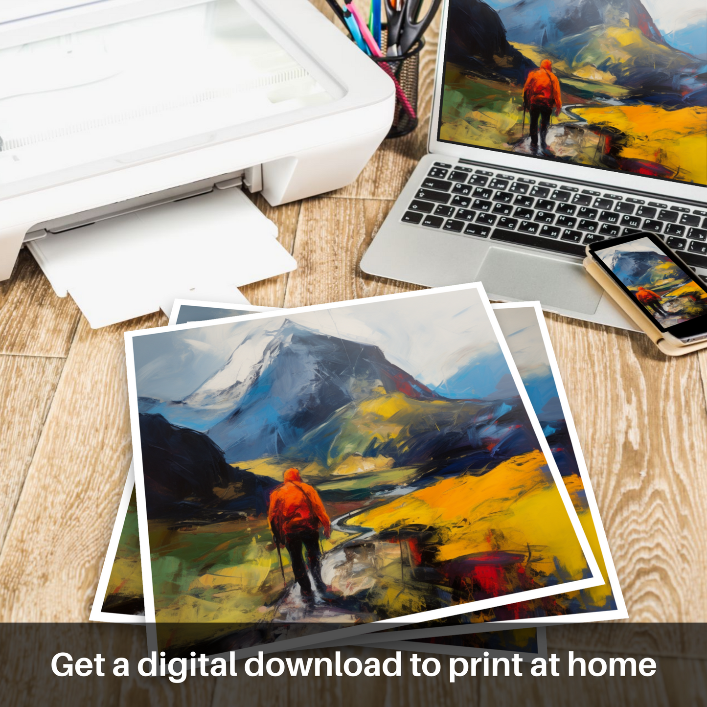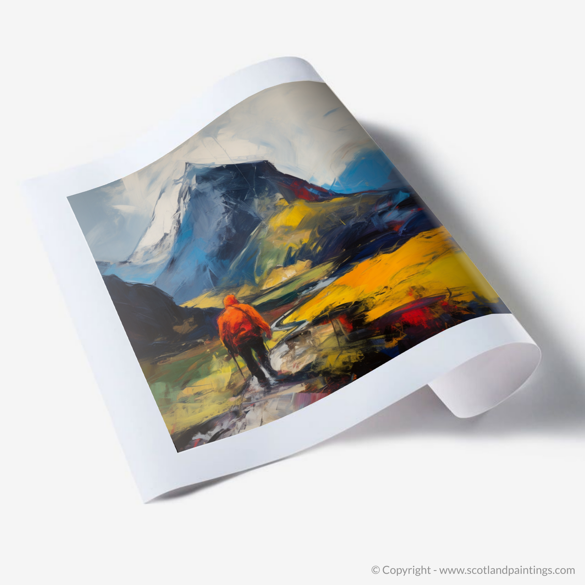 Embrace the allure of the Scottish Highlands with this stirring abstract expressionist portrayal of a lone hiker in the dramatic landscape of Glencoe. The bold composition captures the essence of adventure, as a solitary figure stands out in a vividly rendered red jacket against the blur of undulating terrain.