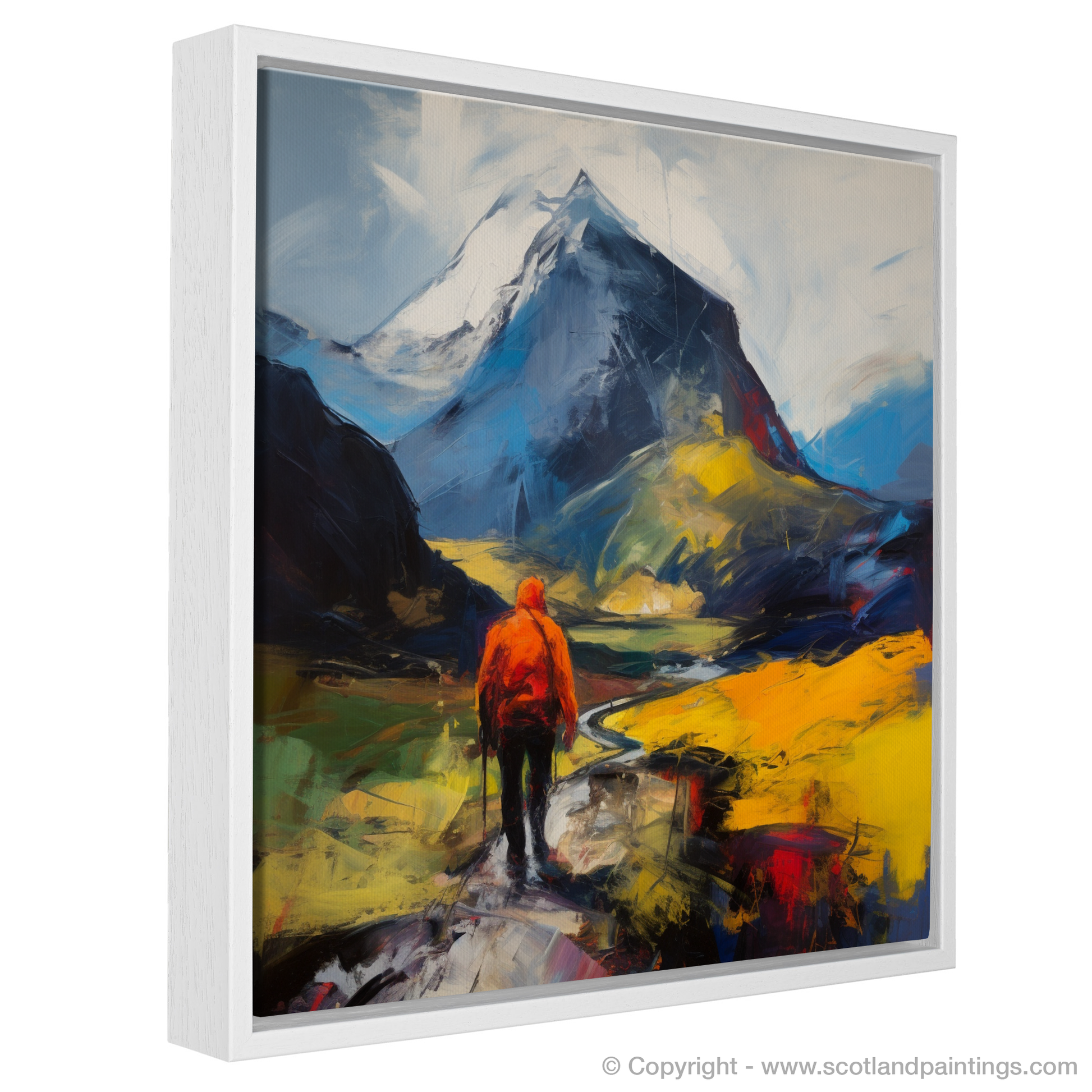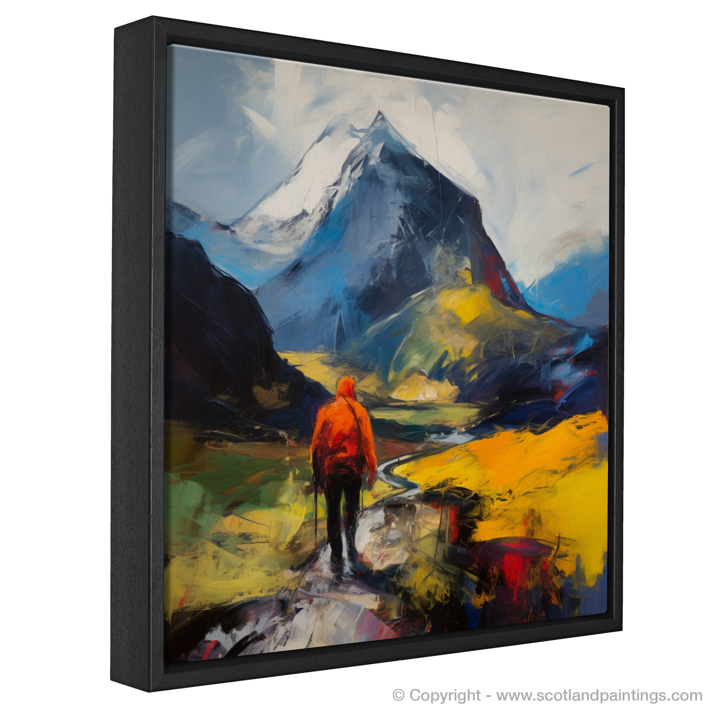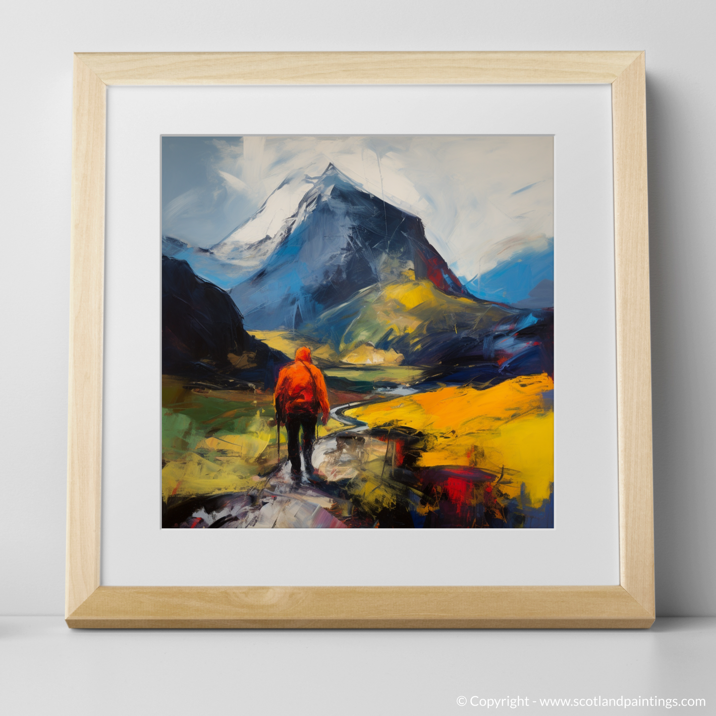Embrace the allure of the Scottish Highlands with this stirring abstract expressionist portrayal of a lone hiker in the dramatic landscape of Glencoe. The bold composition captures the essence of adventure, as a solitary figure stands out in a vividly rendered red jacket against the blur of undulating terrain.