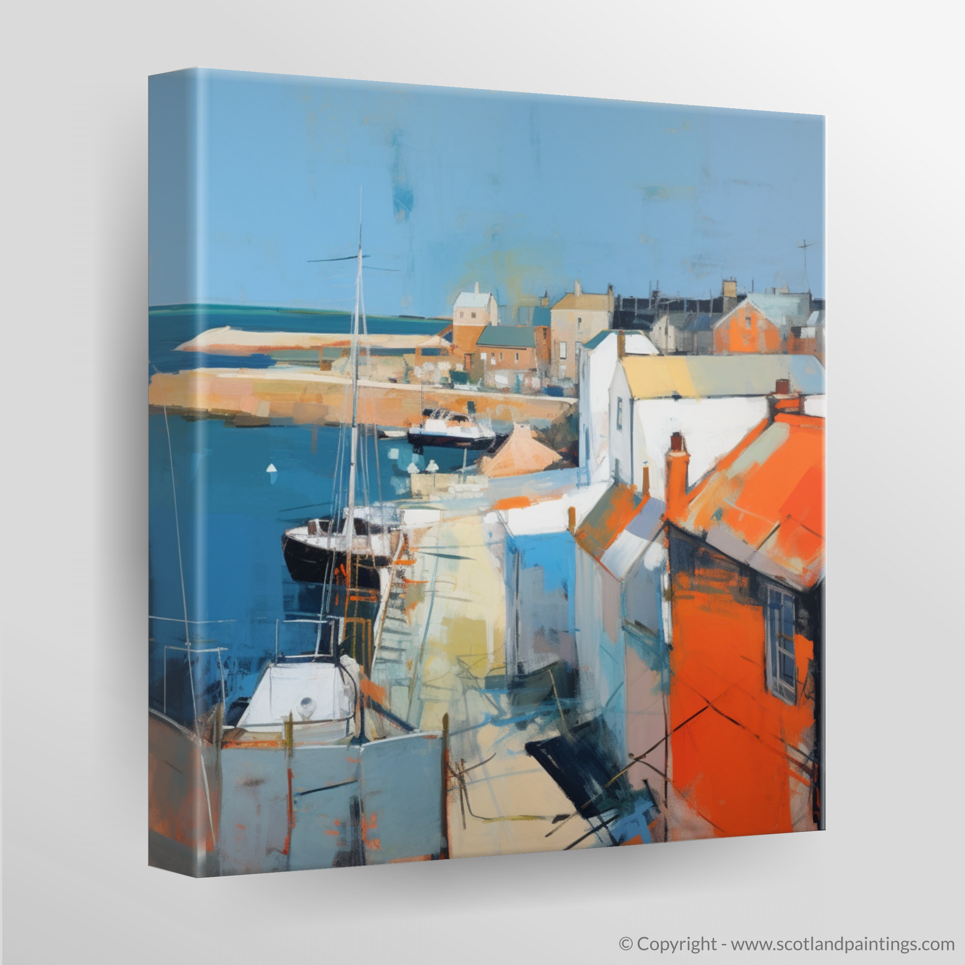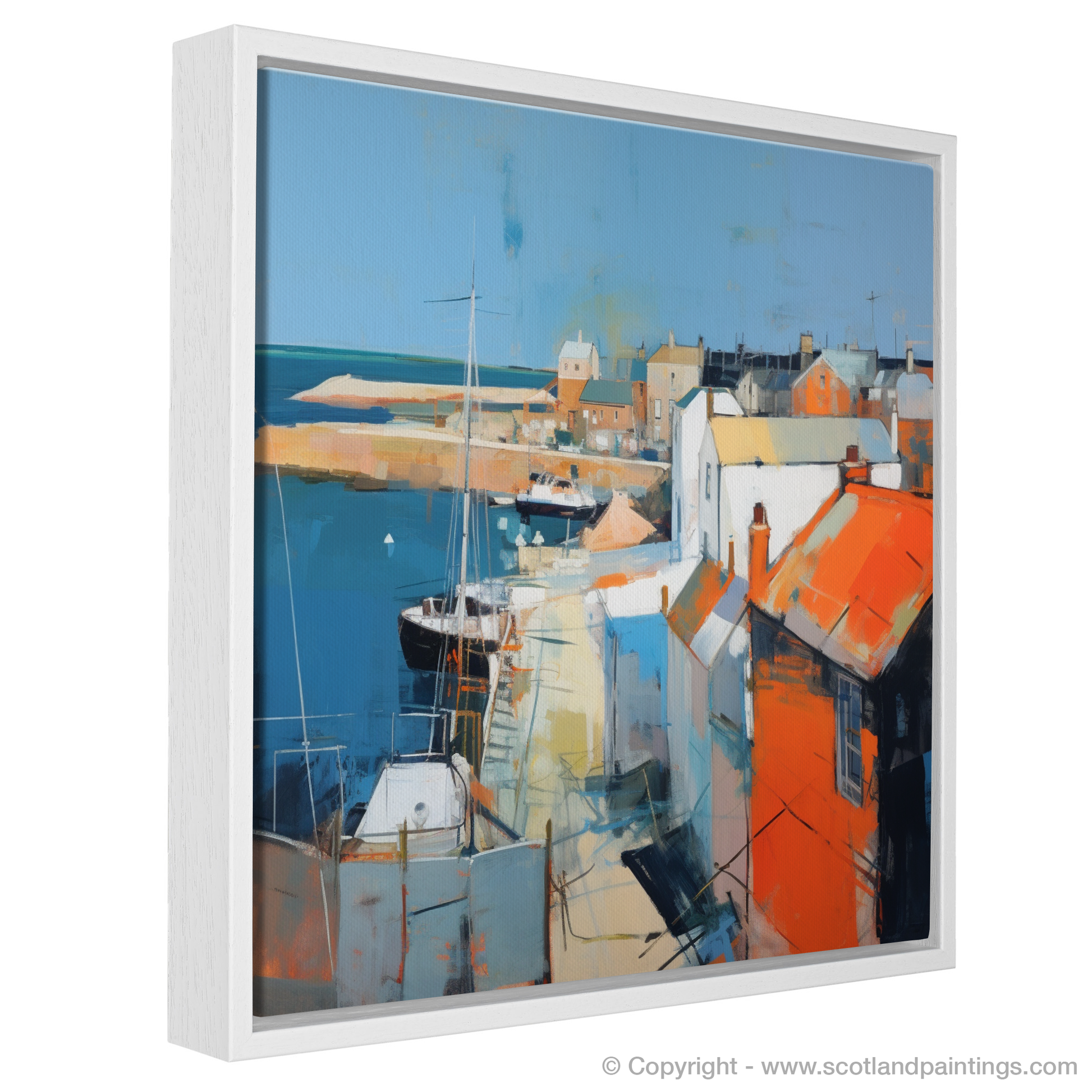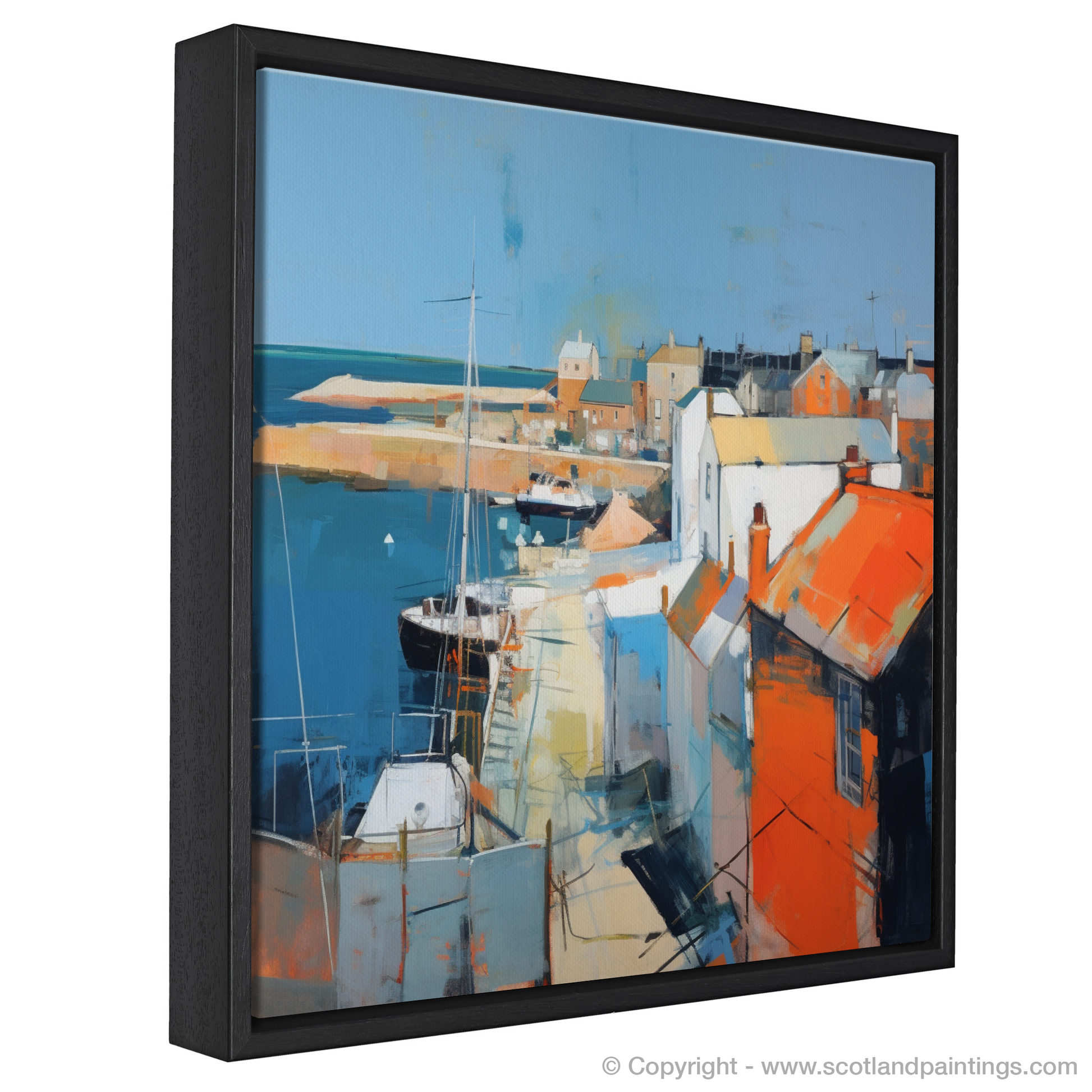 The piece conveys the energy and atmosphere of Anstruther with a palette that ranges from deep hues of blue, reflecting the profound depths of the sea, to the rich oranges and stark whites of the sun-kissed village rooftops. Broad, confident brush strokes create an abstract depiction of the boats resting in the harbour, their masts punctuating the skyline with a rhythm that echoes the pulse of this vibrant coastal community.