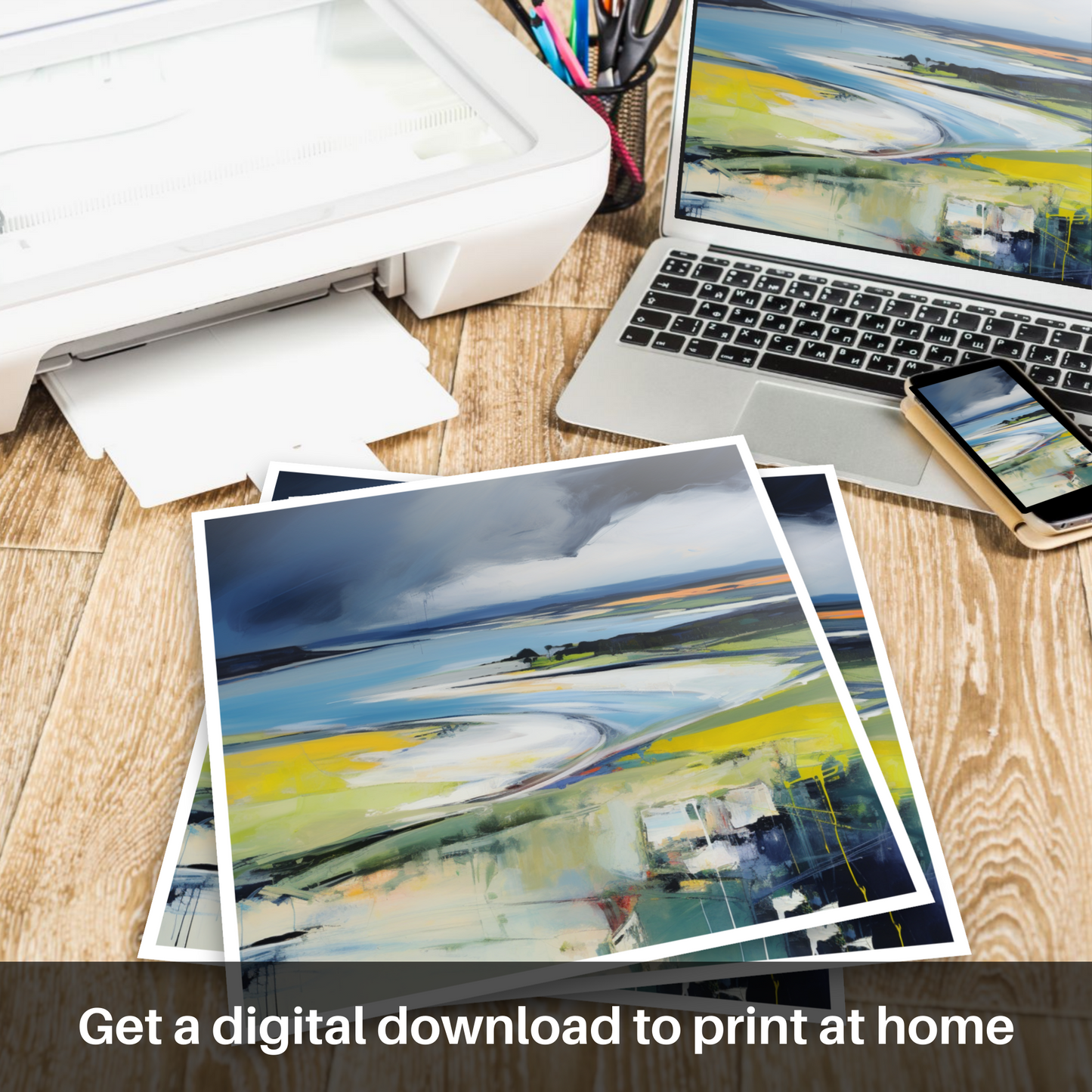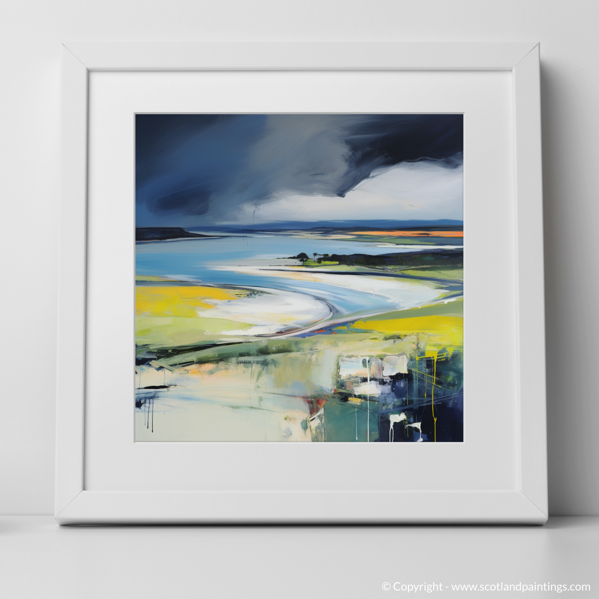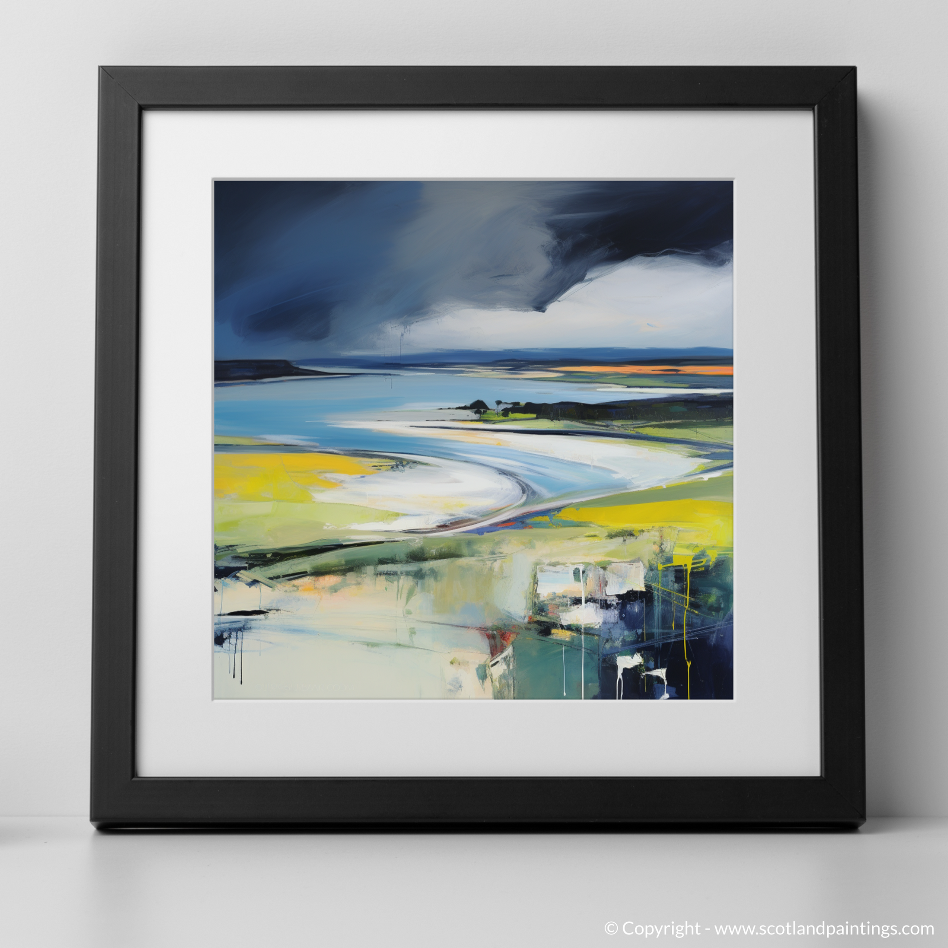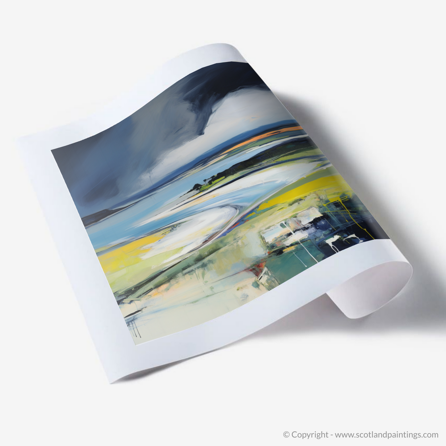 As tempestuous skies loom over the serene Ardtun Bay, this captivating print from our 'Scottish Coves' collection brings the tumultuous beauty of Scotland's wild coast into your space. The essence of Abstract Impressionism is present in every dynamic brush stroke, with the stormy heavens painted in an intense dance of dark, brooding hues, seeming almost alive with the energy of an impending gale.
