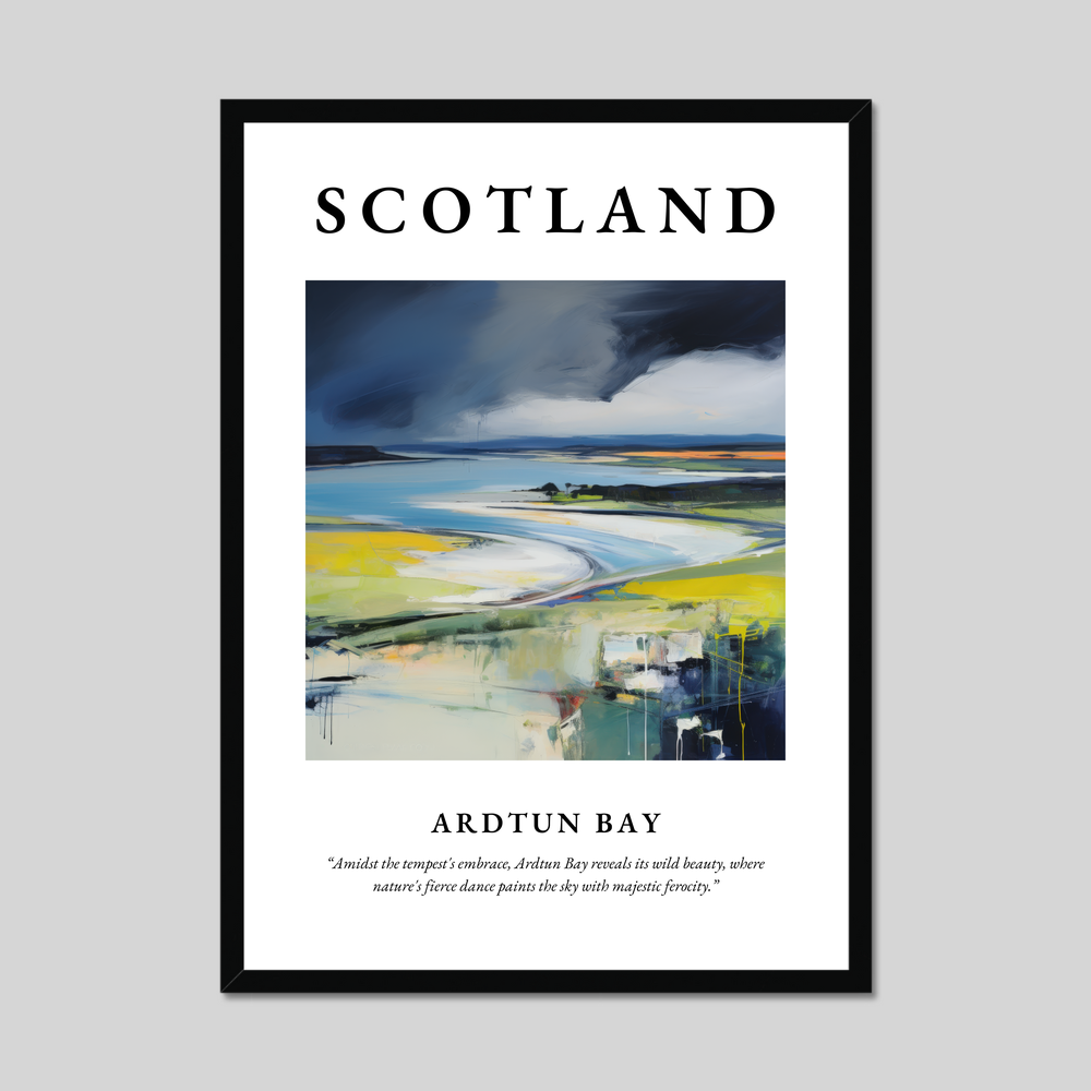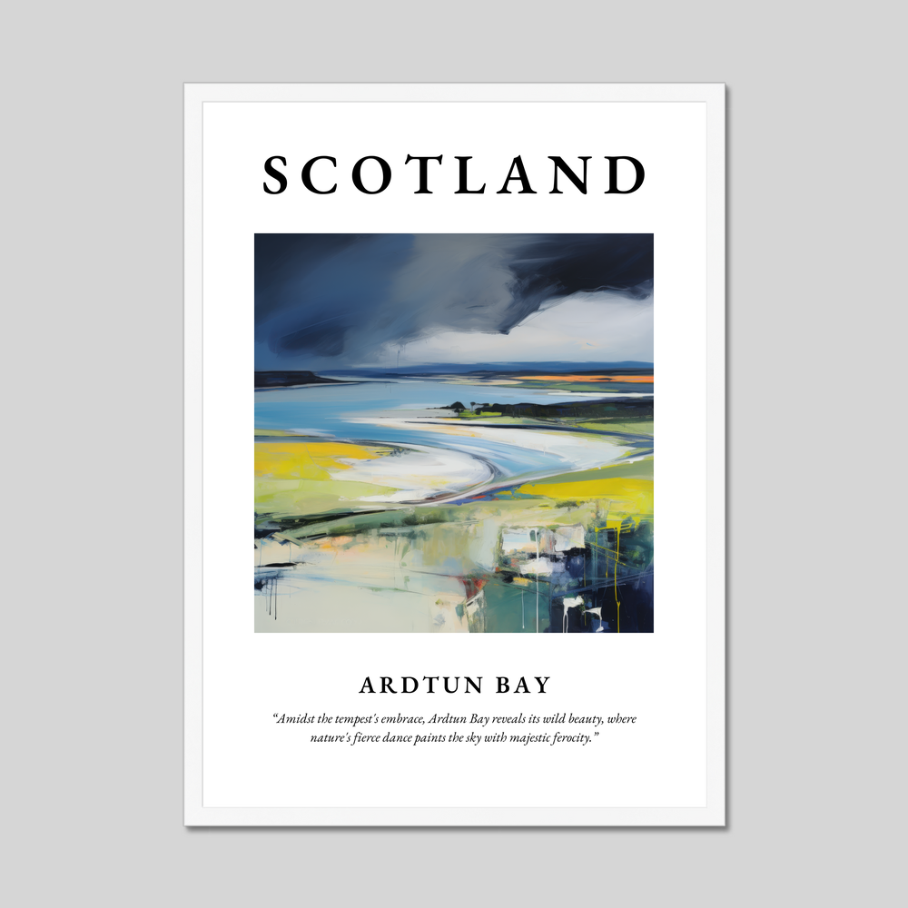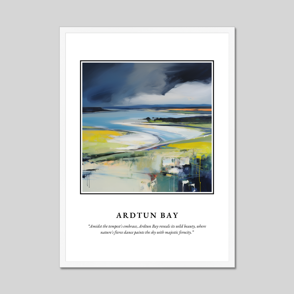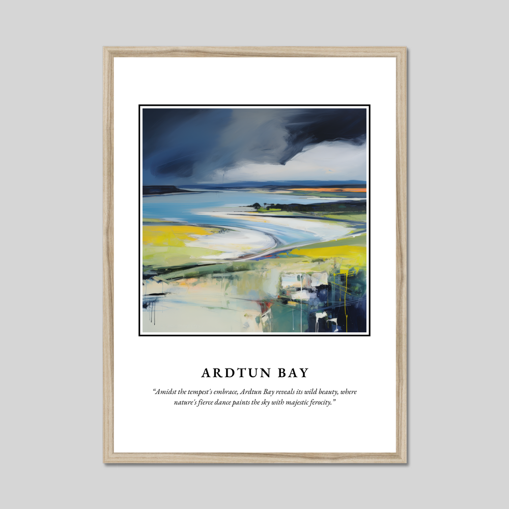 The name “SCOTLAND” emblazoned at the top sets the stage for the majestic scene below—an abstract representation of Ardtun Bay. Vivid brushstrokes and a dynamic palette convey the tempestuous embrace of the natural world. The quote beneath perfectly encapsulates the scene: “Amidst the tempest's embrace, Ardtun Bay reveals its wild beauty, where nature's fierce dance paints the sky with majestic ferocity.” Choose from a black, white, or natural wood-effect frame to complement your decor and amplify your connection to this mesmerising landscape.
