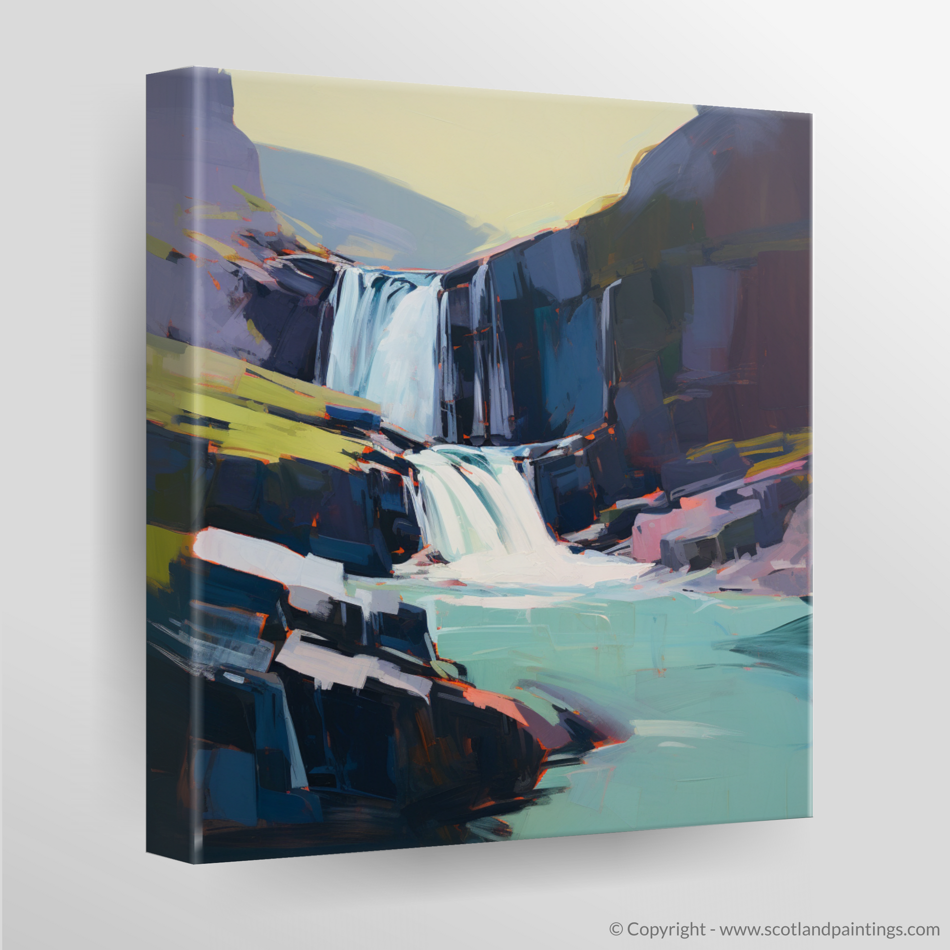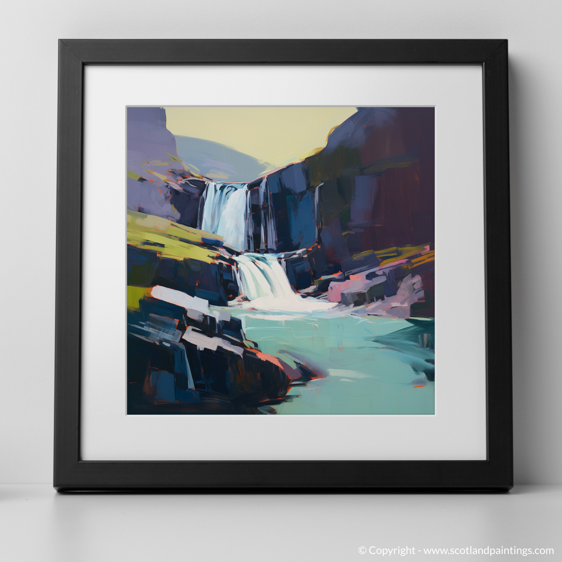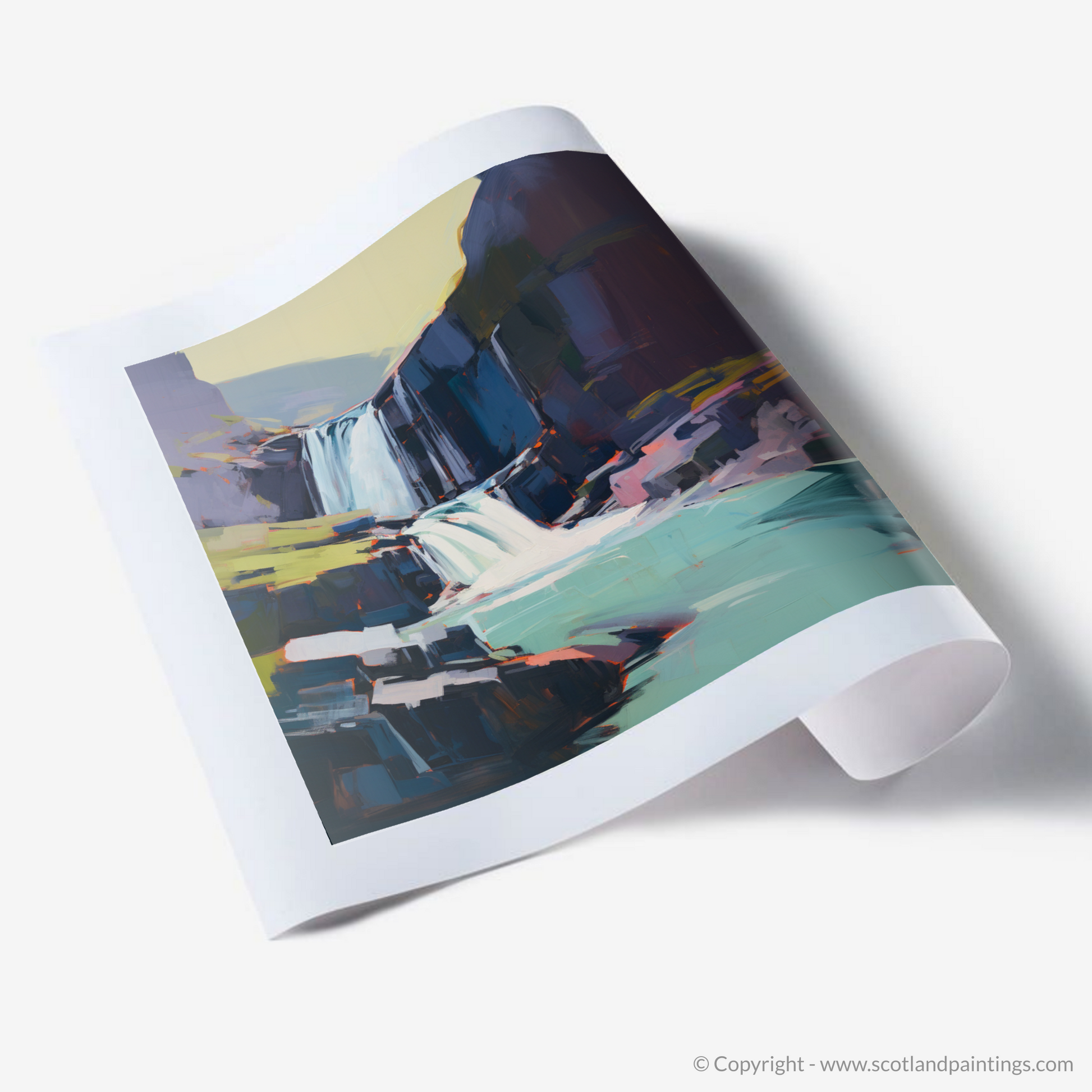 Immerse yourself in the rugged beauty of the Scottish Highlands with our exquisite print, capturing the raw splendour of the Falls of Kirkaig. Set against a canvas that blends audacious strokes and a rich palette, this piece evokes both the tranquillity and the tumultuous power of nature. Sharp cerulean blues and serene azure hues sing in perfect harmony with the frothy whites cascading down the water's path, creating a stunning visual symphony. The surrounding cliffs, portrayed through geometric delineations and softened edges, rise stoically in shades of charcoal and slate, interspersed with unexpected pops of vermilion and ochre adding an arresting contrast to the overall composition.