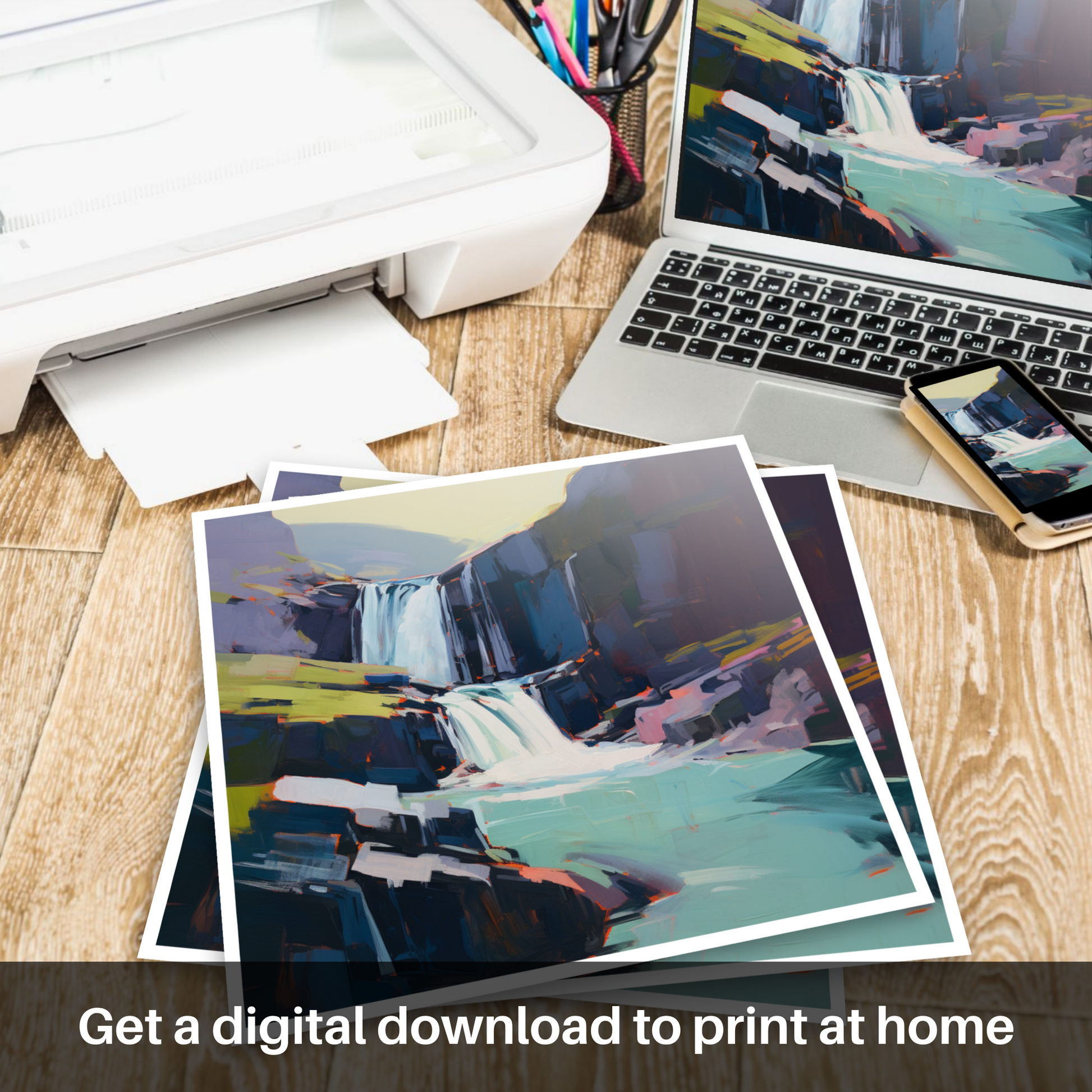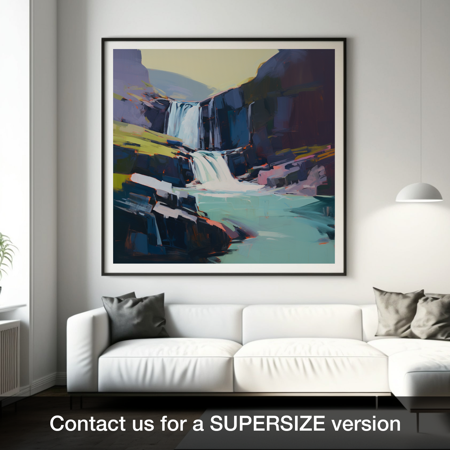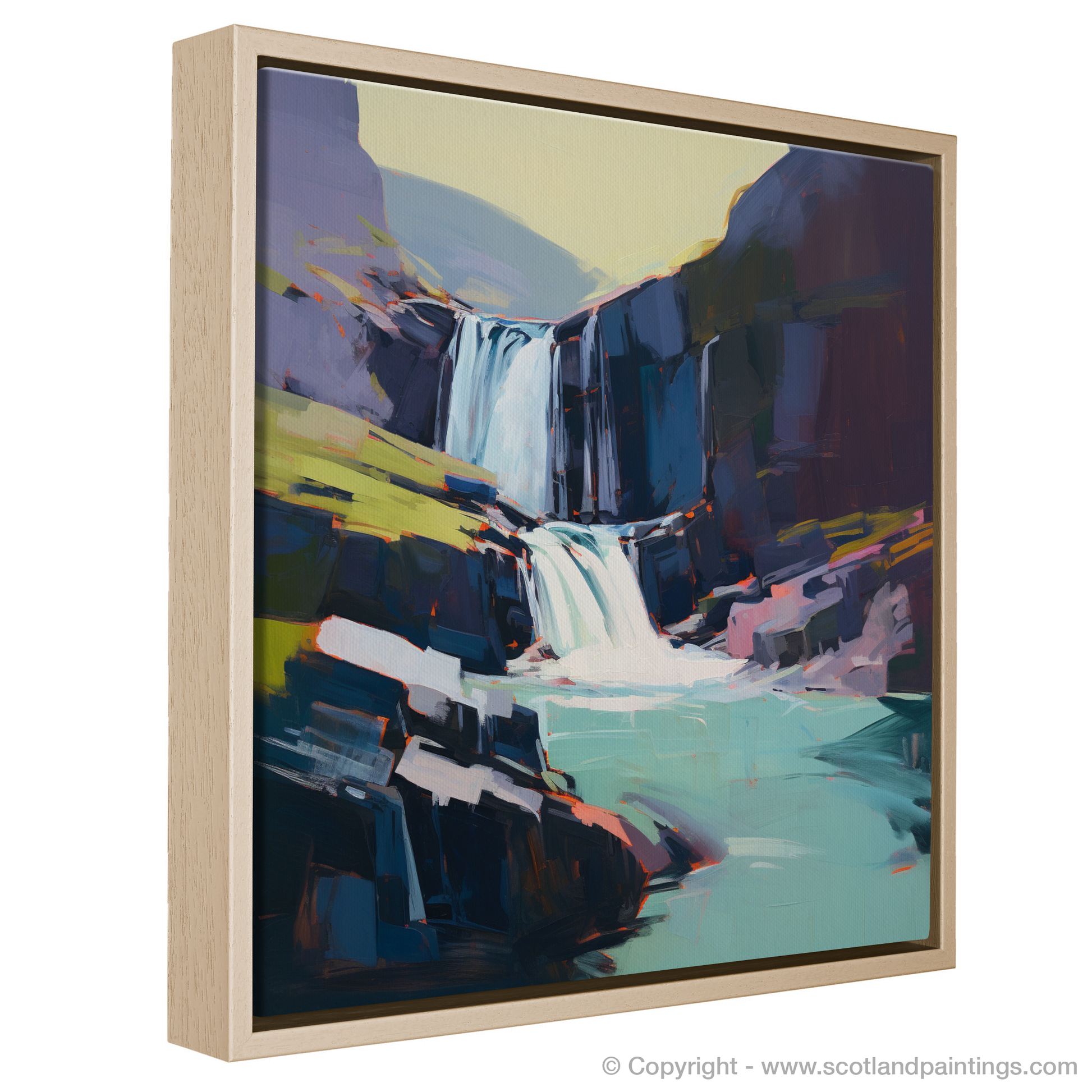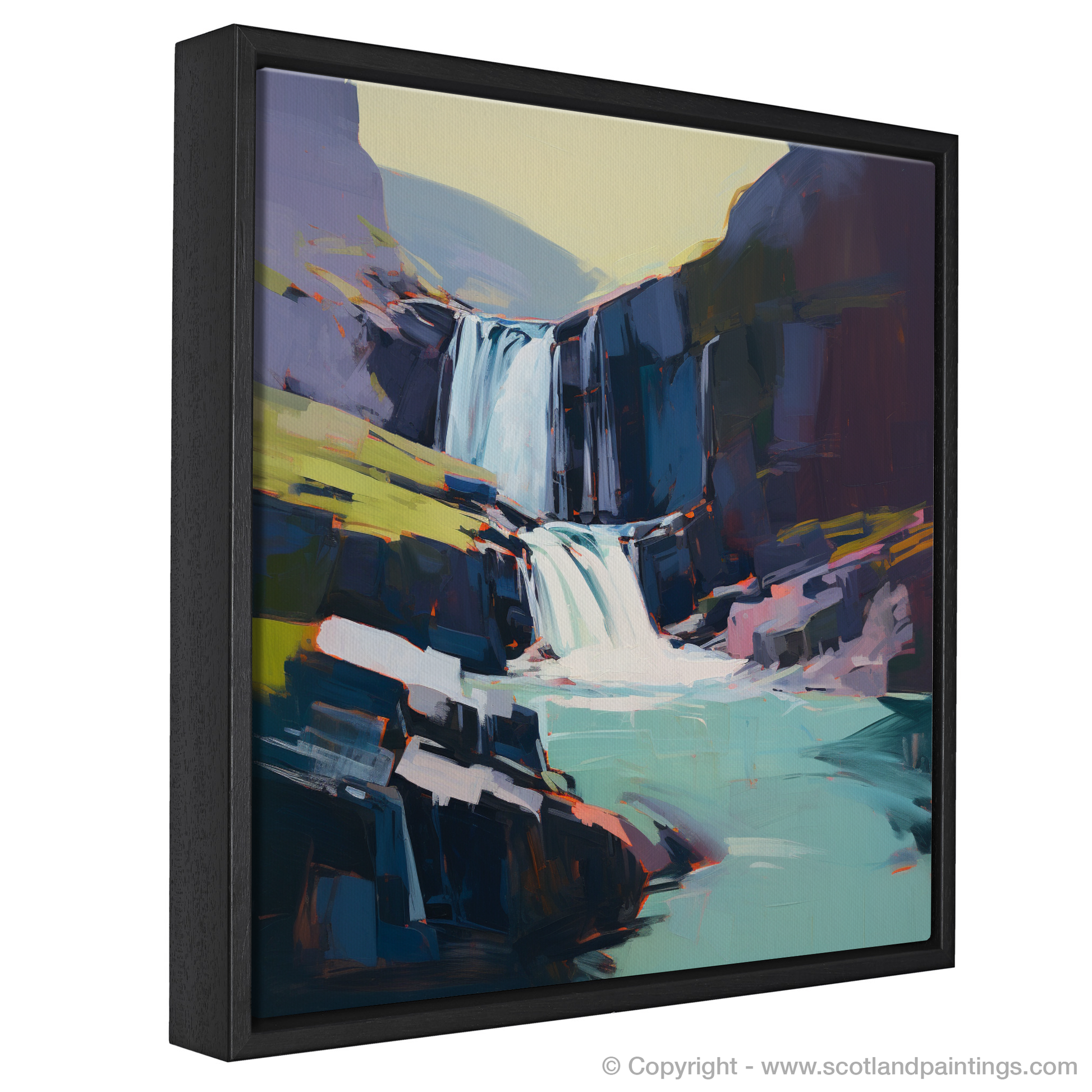 Immerse yourself in the rugged beauty of the Scottish Highlands with our exquisite print, capturing the raw splendour of the Falls of Kirkaig. Set against a canvas that blends audacious strokes and a rich palette, this piece evokes both the tranquillity and the tumultuous power of nature. Sharp cerulean blues and serene azure hues sing in perfect harmony with the frothy whites cascading down the water's path, creating a stunning visual symphony. The surrounding cliffs, portrayed through geometric delineations and softened edges, rise stoically in shades of charcoal and slate, interspersed with unexpected pops of vermilion and ochre adding an arresting contrast to the overall composition.