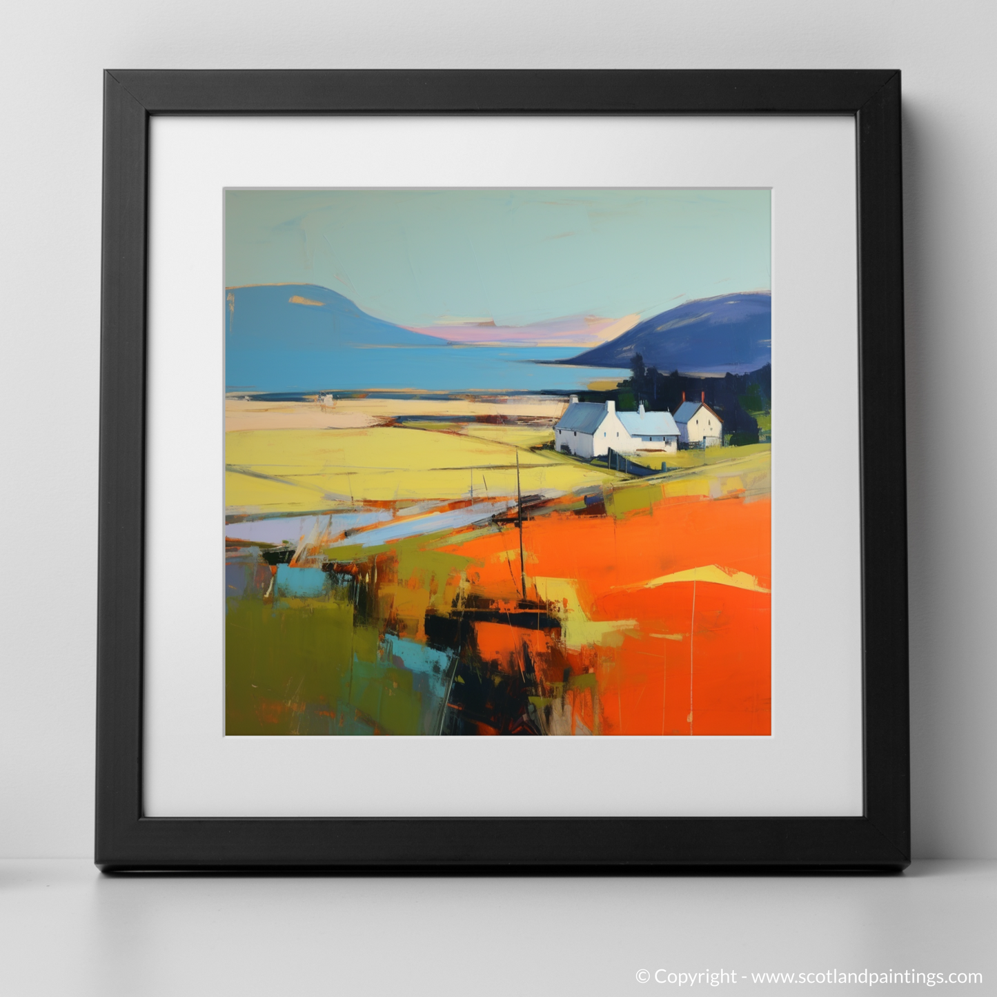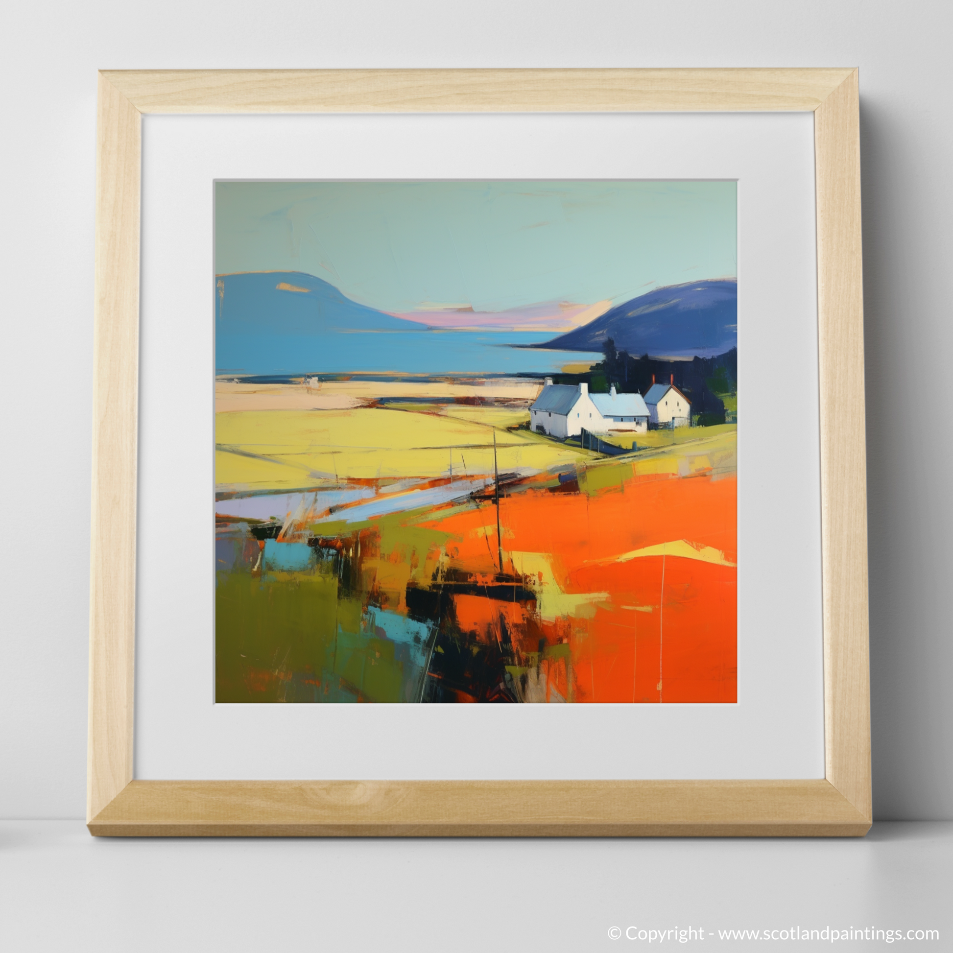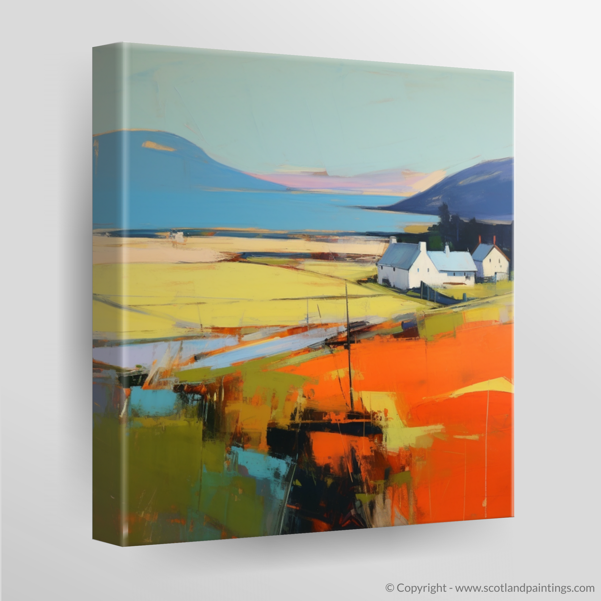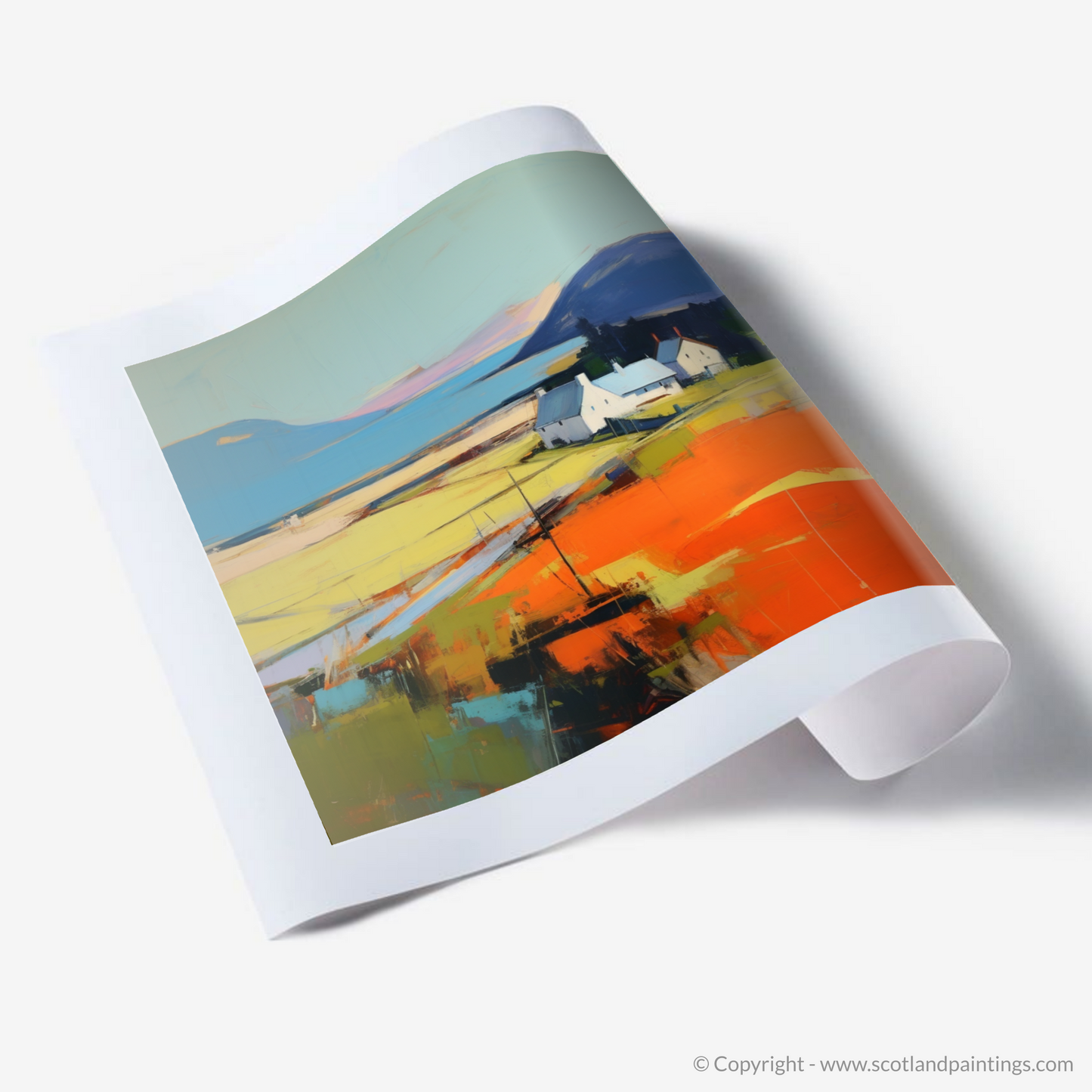 The artwork pulsates with bold, sweeping colours that dance across the canvas, inviting the viewer into a landscape reimagined. An audacious palette of oranges and yellows forms an abstract foreground, reminiscent of Wick's raw, natural terrain. The colours merge and contrast, evoking the ever-changing Scottish skies and the vibrance of the untouched fields.