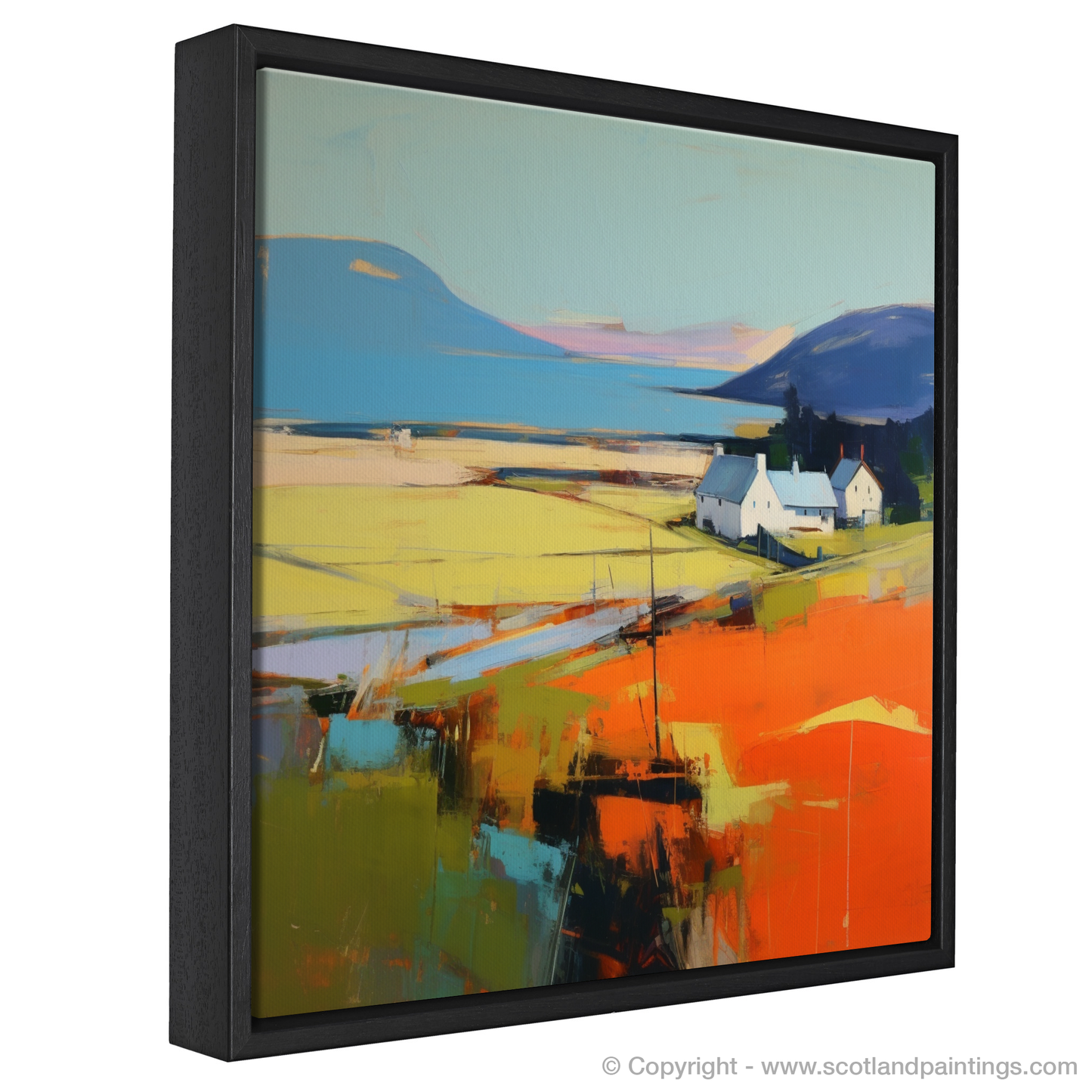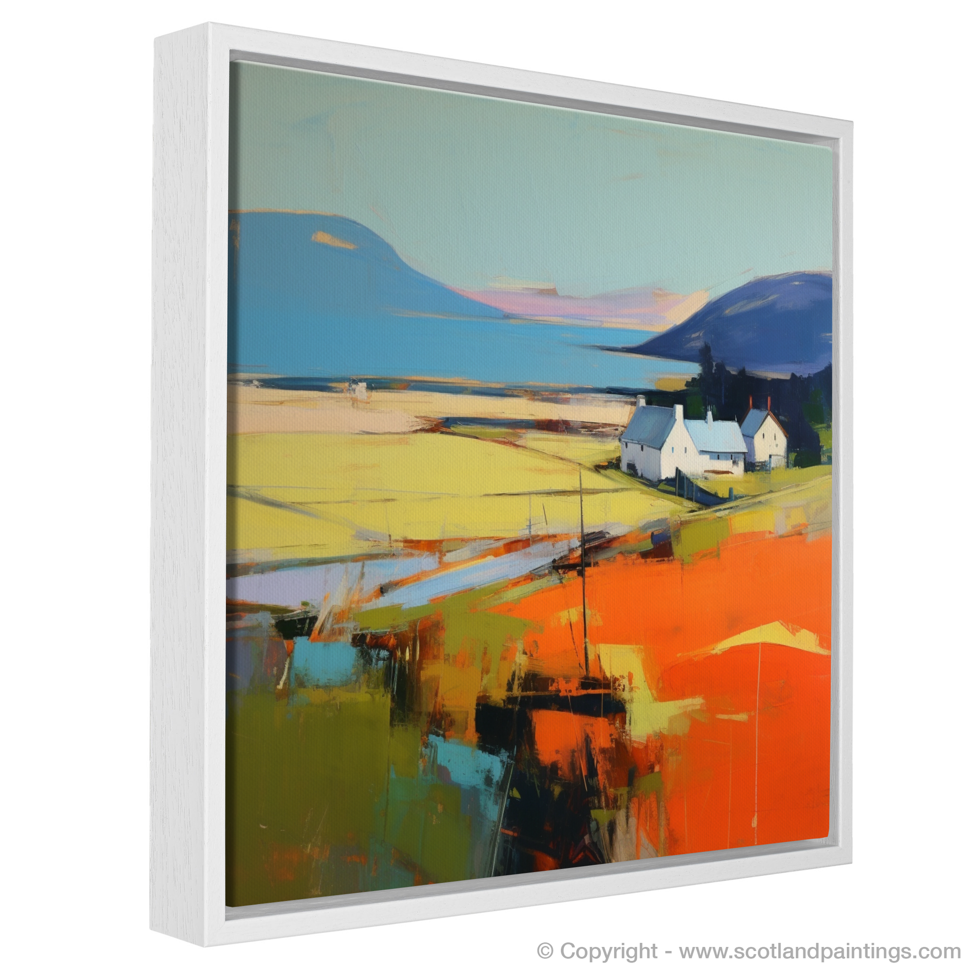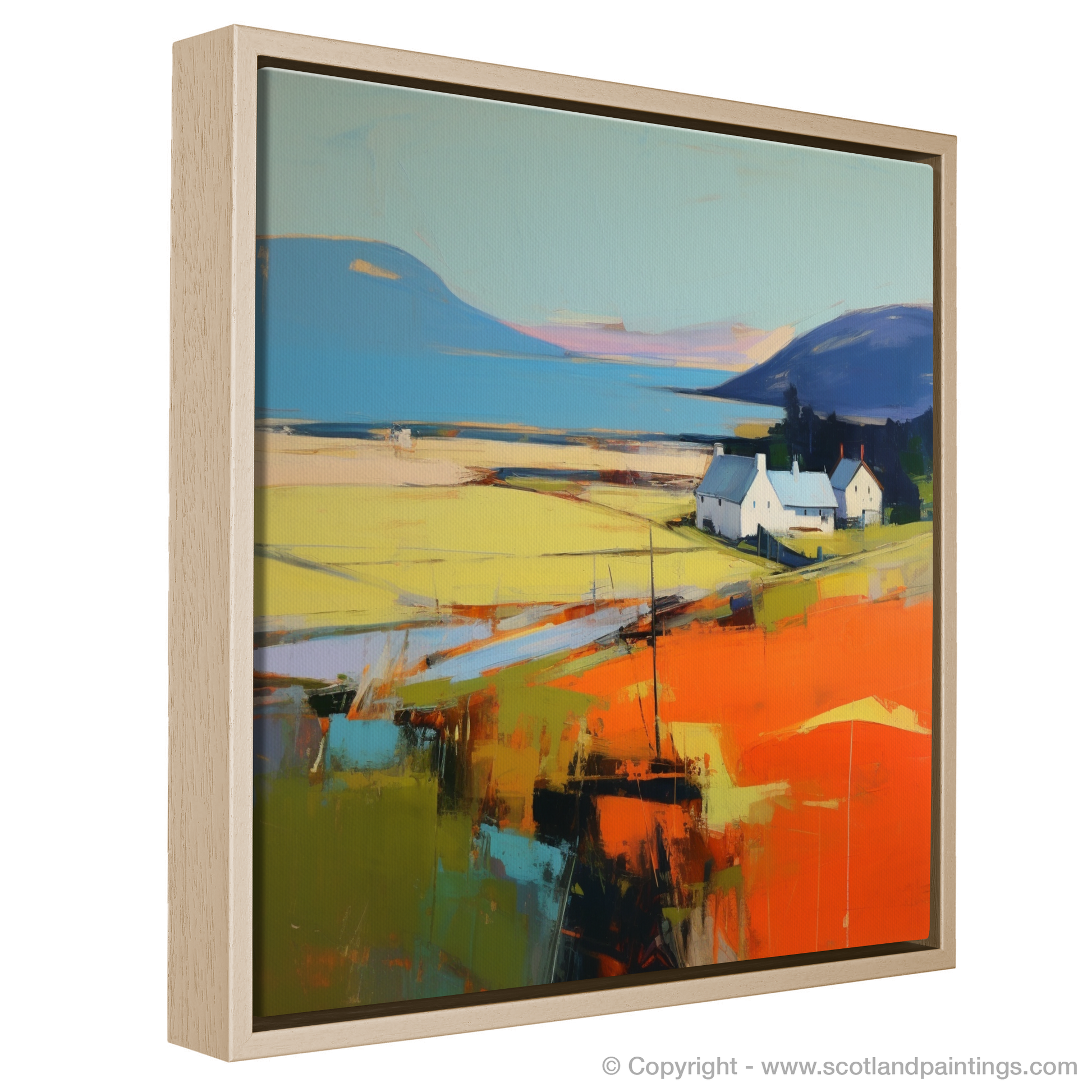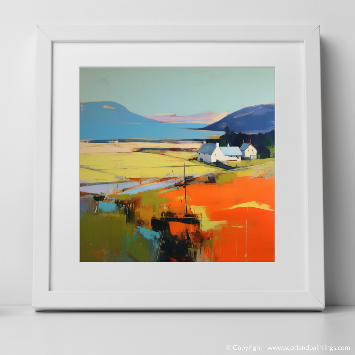 The artwork pulsates with bold, sweeping colours that dance across the canvas, inviting the viewer into a landscape reimagined. An audacious palette of oranges and yellows forms an abstract foreground, reminiscent of Wick's raw, natural terrain. The colours merge and contrast, evoking the ever-changing Scottish skies and the vibrance of the untouched fields.