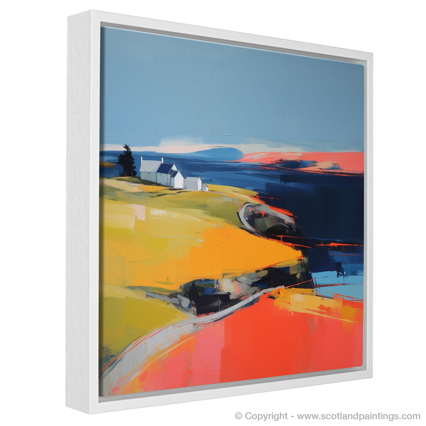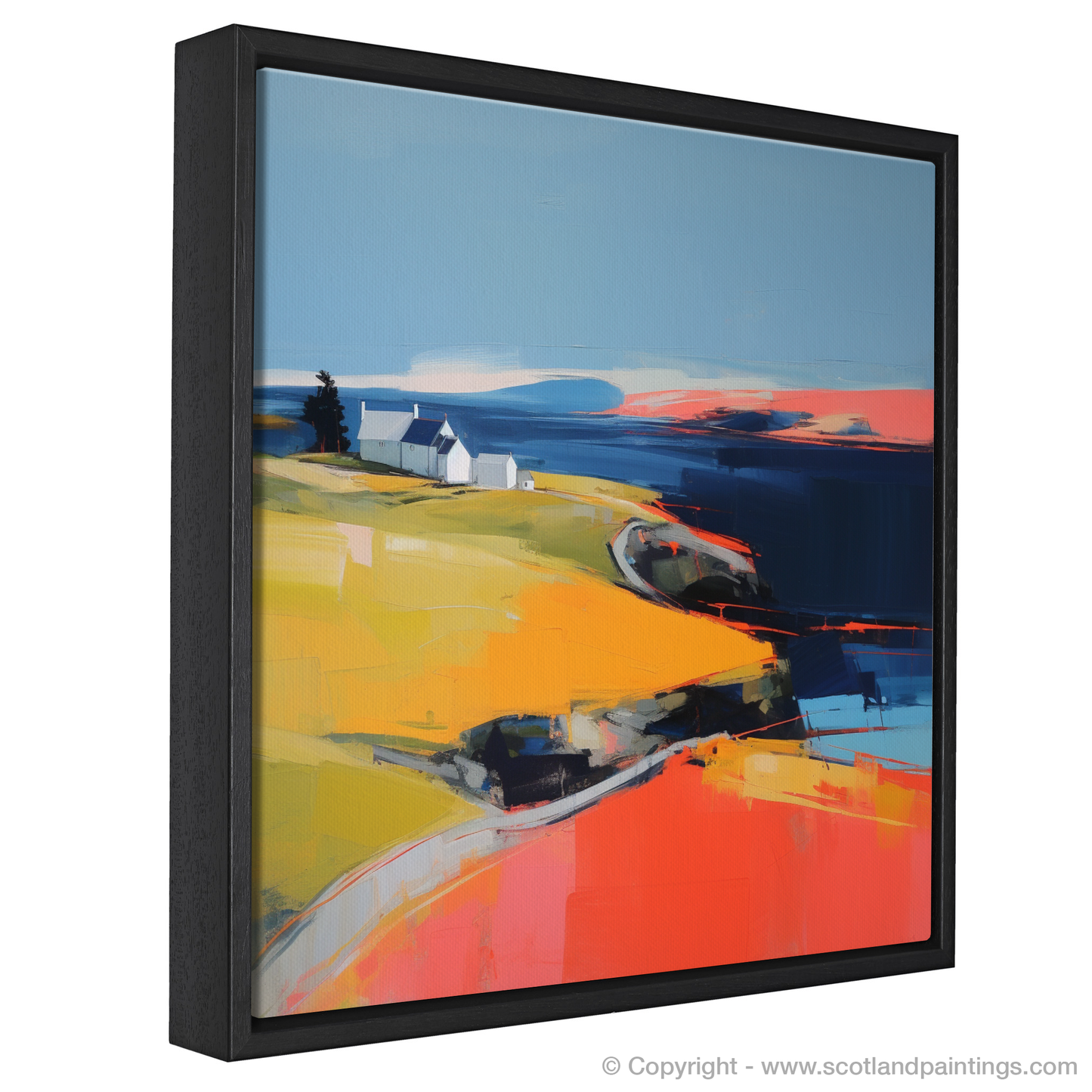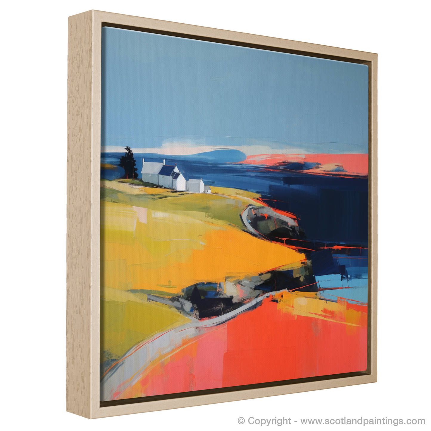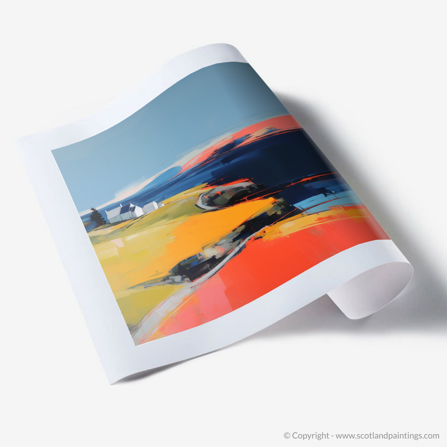 Step into a world where the vibrant hues of the Scottish Highlands come alive, encapsulating the essence of Wick with a contemporary twist. This exquisite piece showcases an abstract landscape that balances the line between representational and imaginative. The canvas is alive with bold blocks of colour, where clear blue skies meet a patchwork of fields; vivid yellows, fiery oranges, and deep blues dominate the scene, conjuring a sense of warmth and depth that is truly captivating.