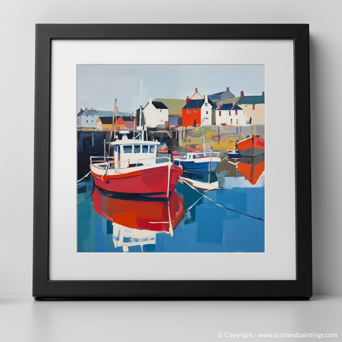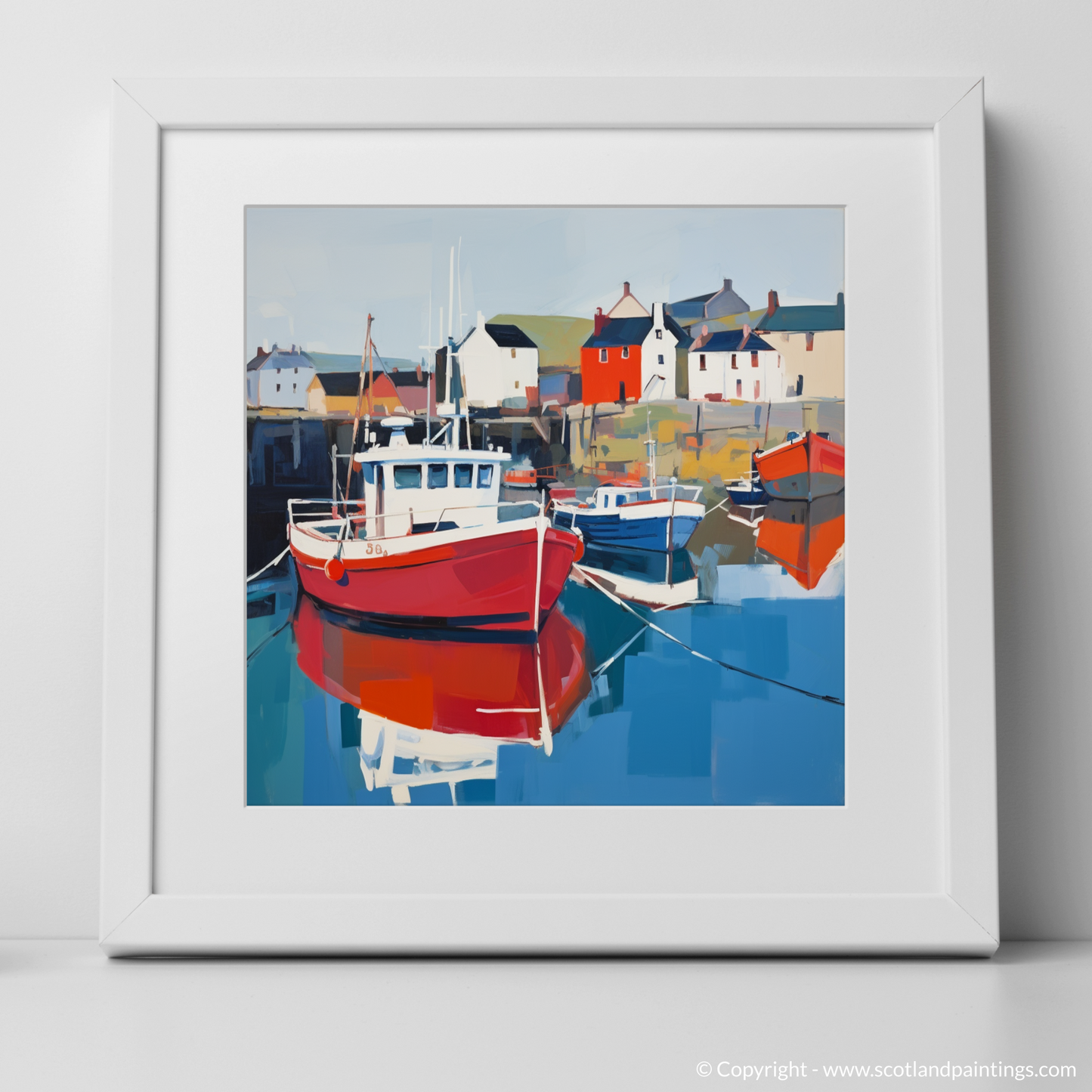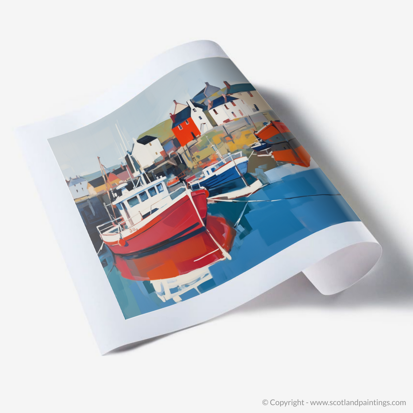 Step into the serene realm of a Scottish harbour brought vividly to life through this invigorating contemporary print. The piece masterfully captures the tranquil yet bustling energy of coastal life, framed by the distinct architecture that Scotland's seaside towns are renowned for.