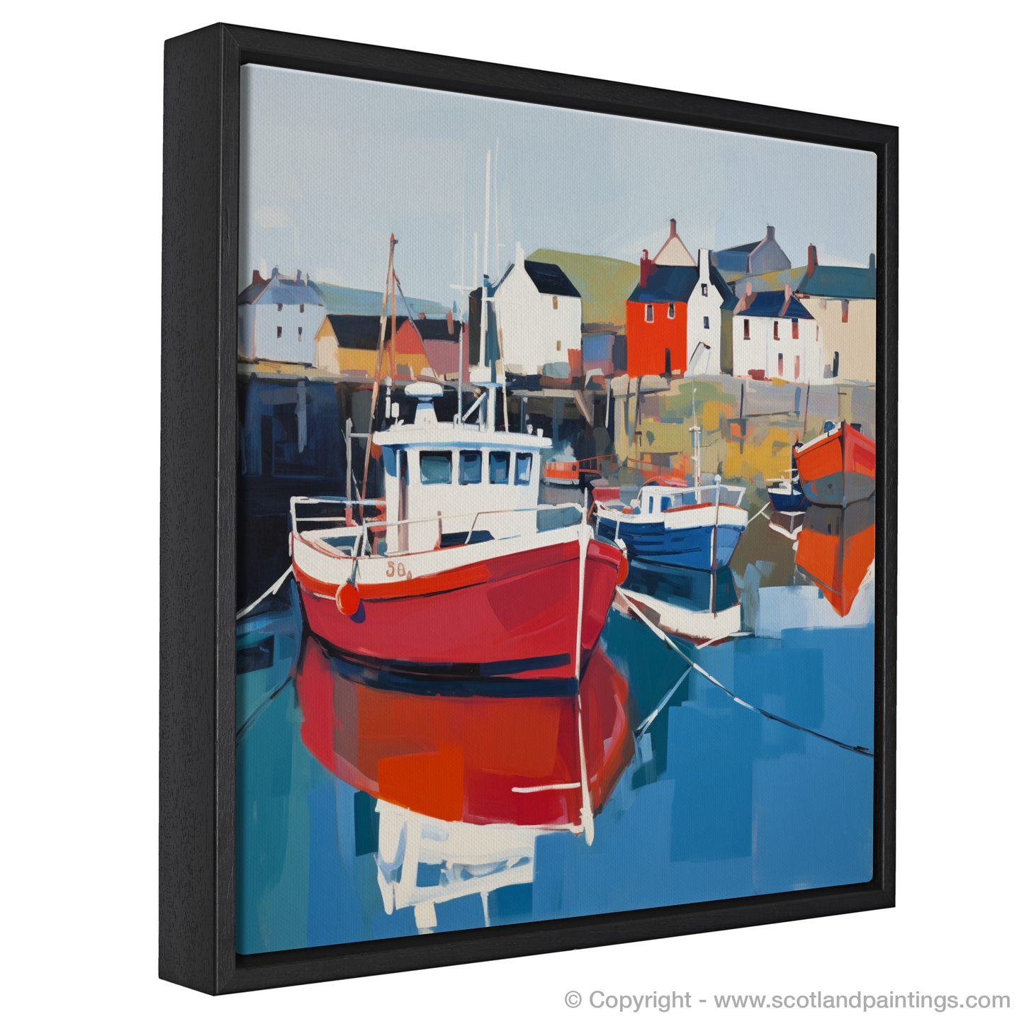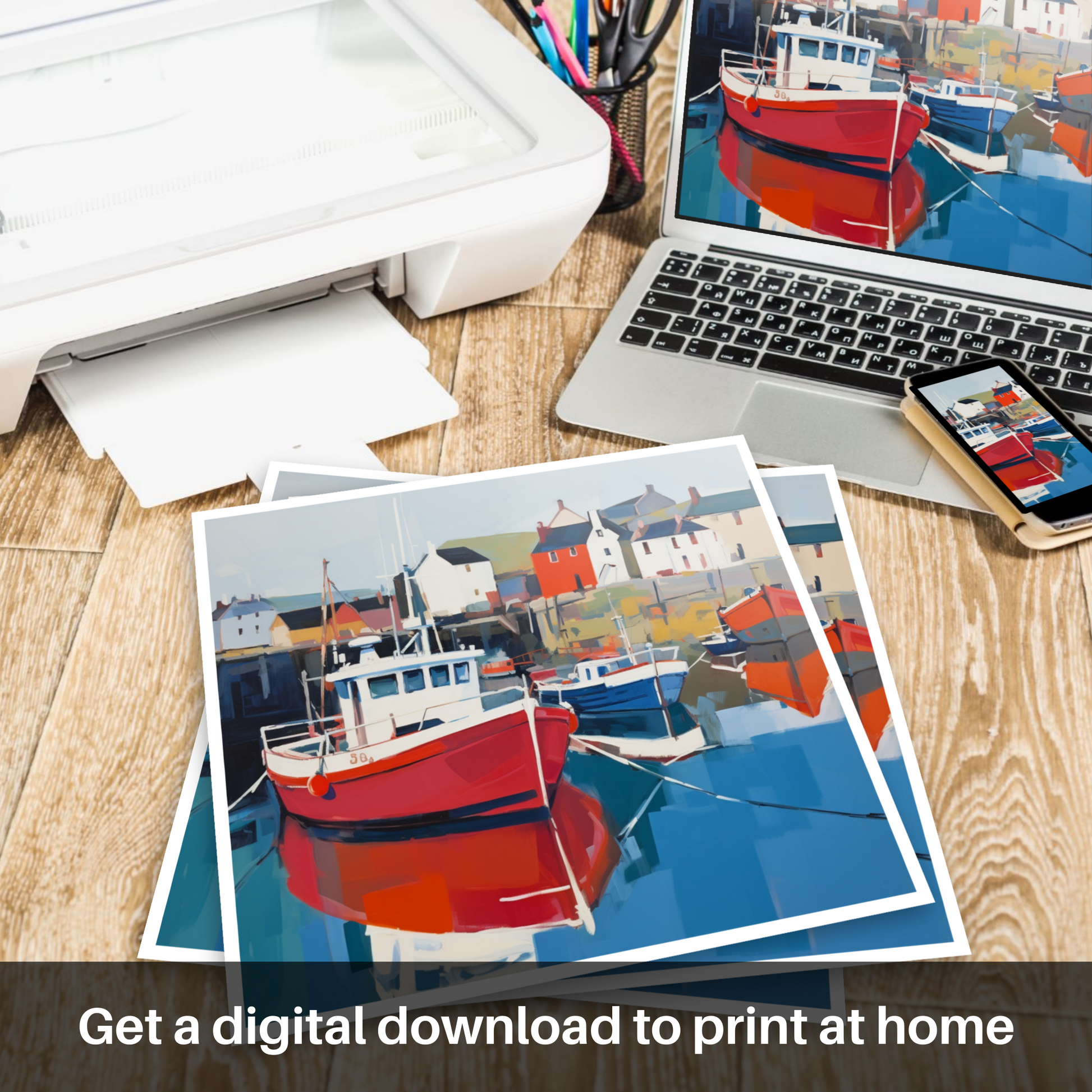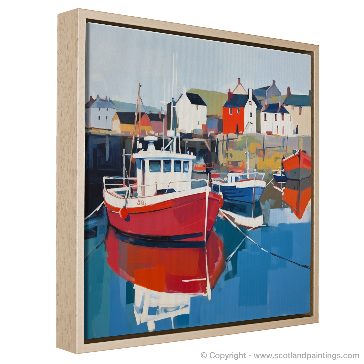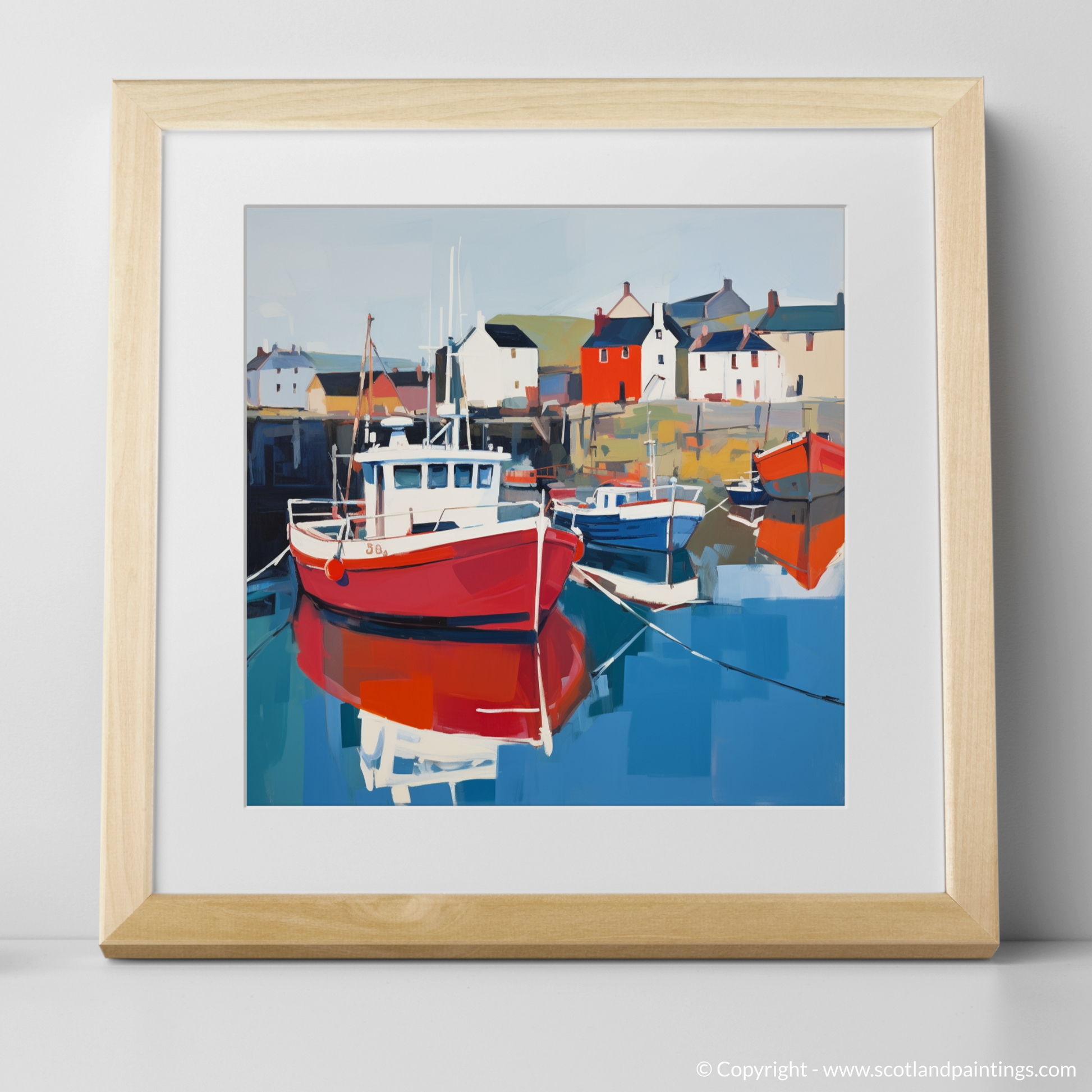 Step into the serene realm of a Scottish harbour brought vividly to life through this invigorating contemporary print. The piece masterfully captures the tranquil yet bustling energy of coastal life, framed by the distinct architecture that Scotland's seaside towns are renowned for.