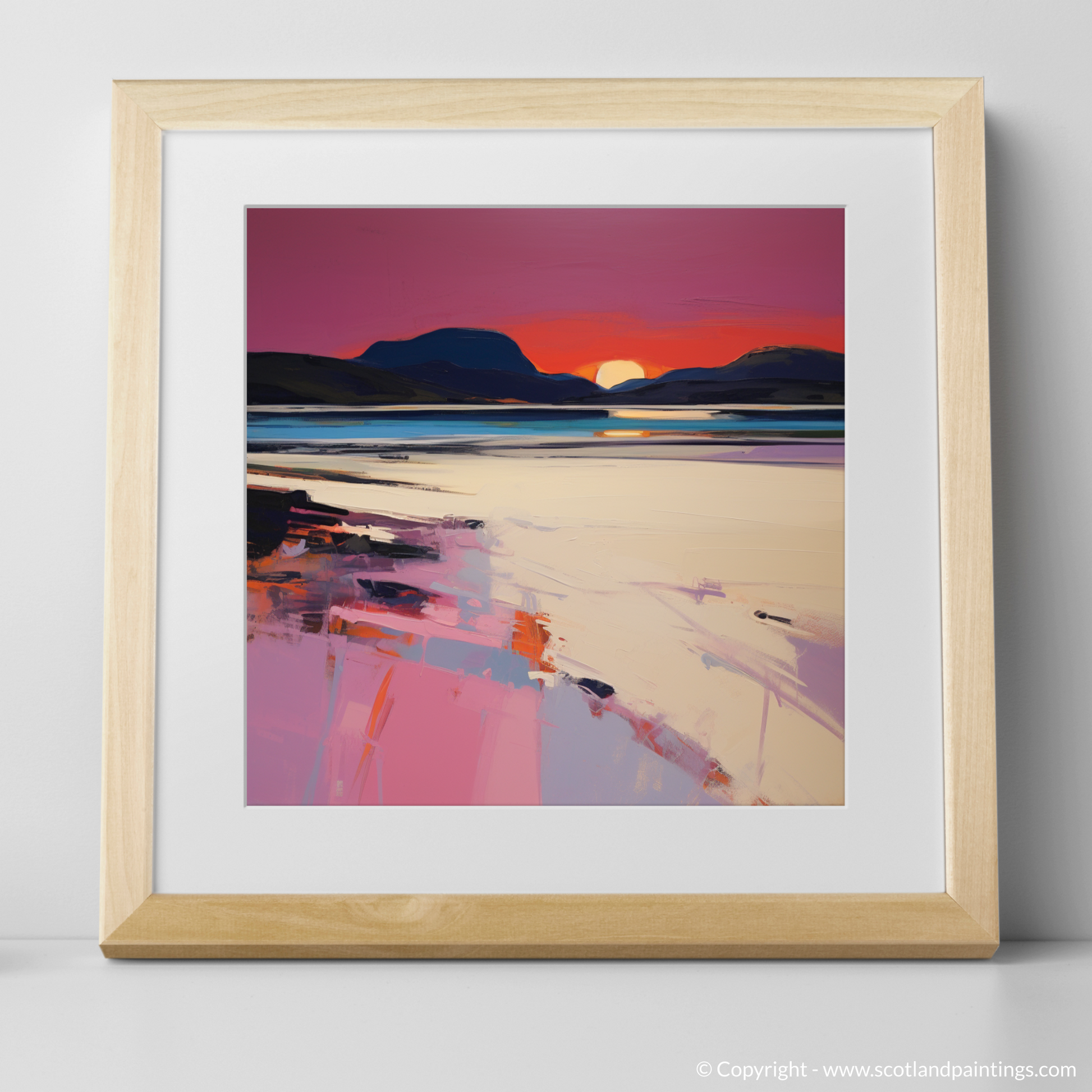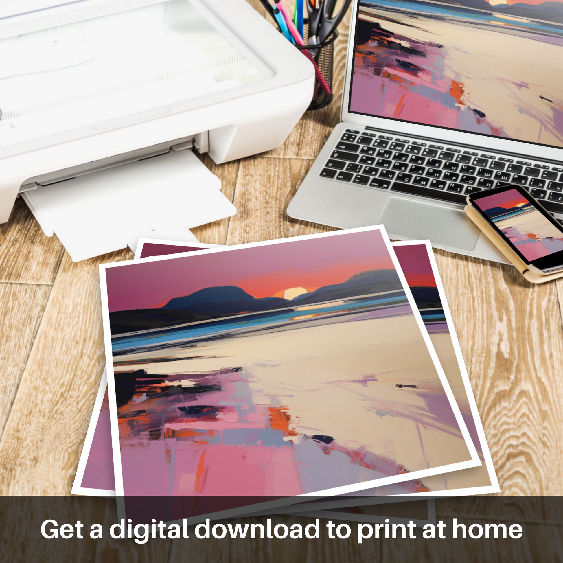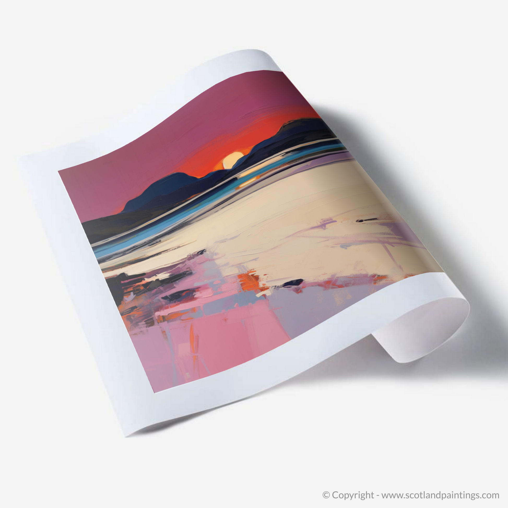 Immerse yourself in the serene spectacle of Camusdarach Beach, as this evocative contemporary print captures the enchanting aura of dusk on the Scottish coast. Graced by the gentle embrace of twilight, this print embodies an exquisite interplay of colour and light, where vibrant hues of crimson and deep violet skies meet the cool, serene blues of the tranquil sea.