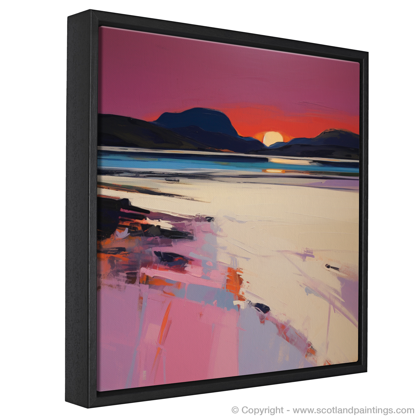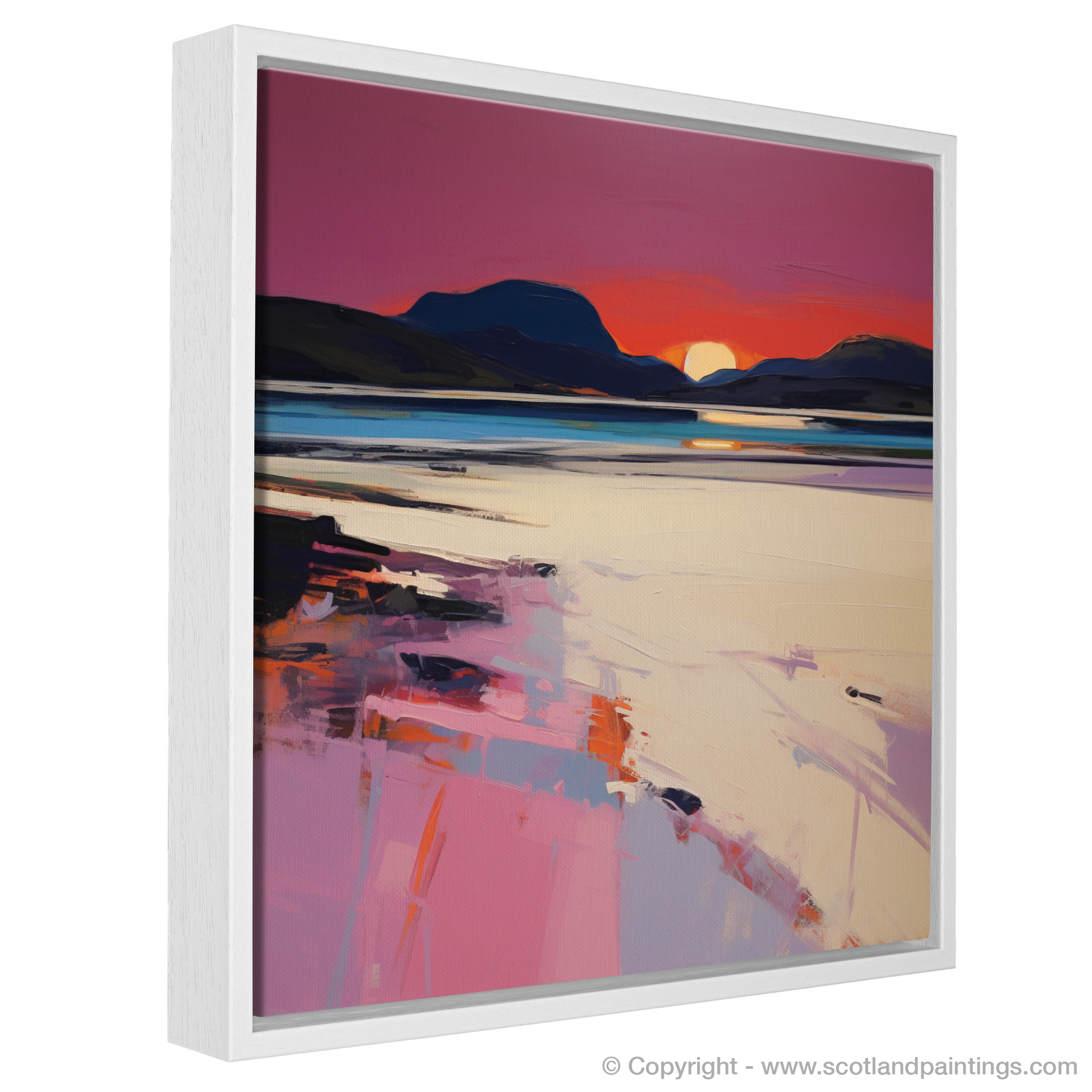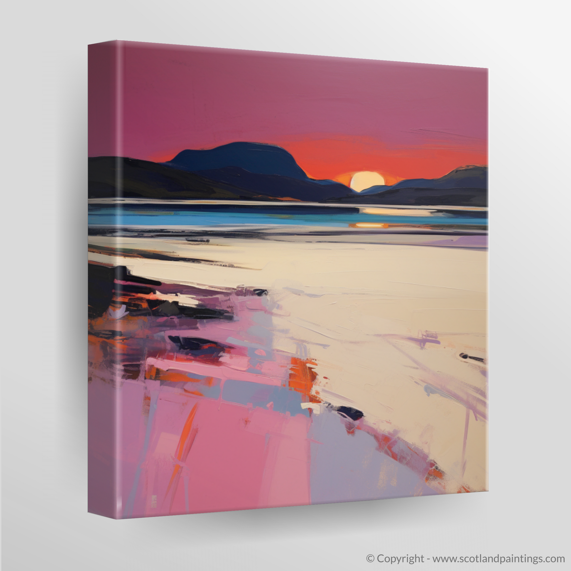 Immerse yourself in the serene spectacle of Camusdarach Beach, as this evocative contemporary print captures the enchanting aura of dusk on the Scottish coast. Graced by the gentle embrace of twilight, this print embodies an exquisite interplay of colour and light, where vibrant hues of crimson and deep violet skies meet the cool, serene blues of the tranquil sea.