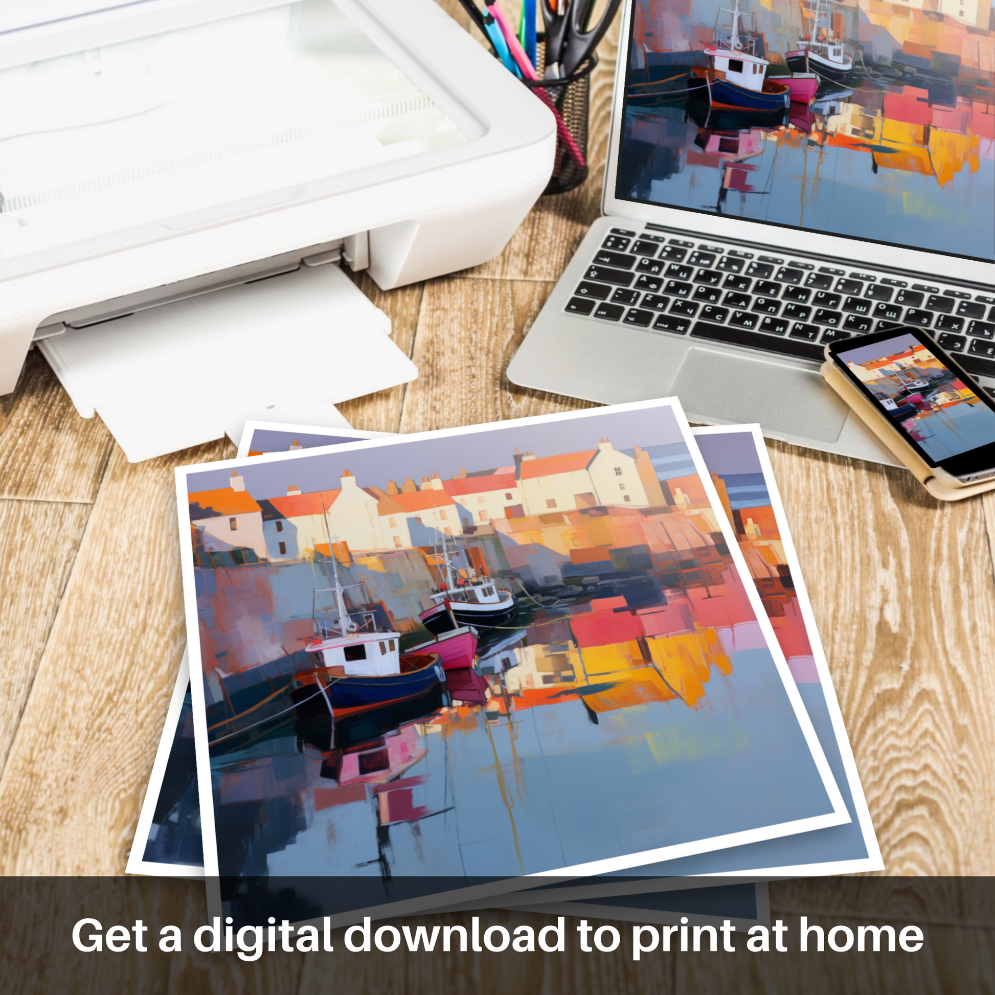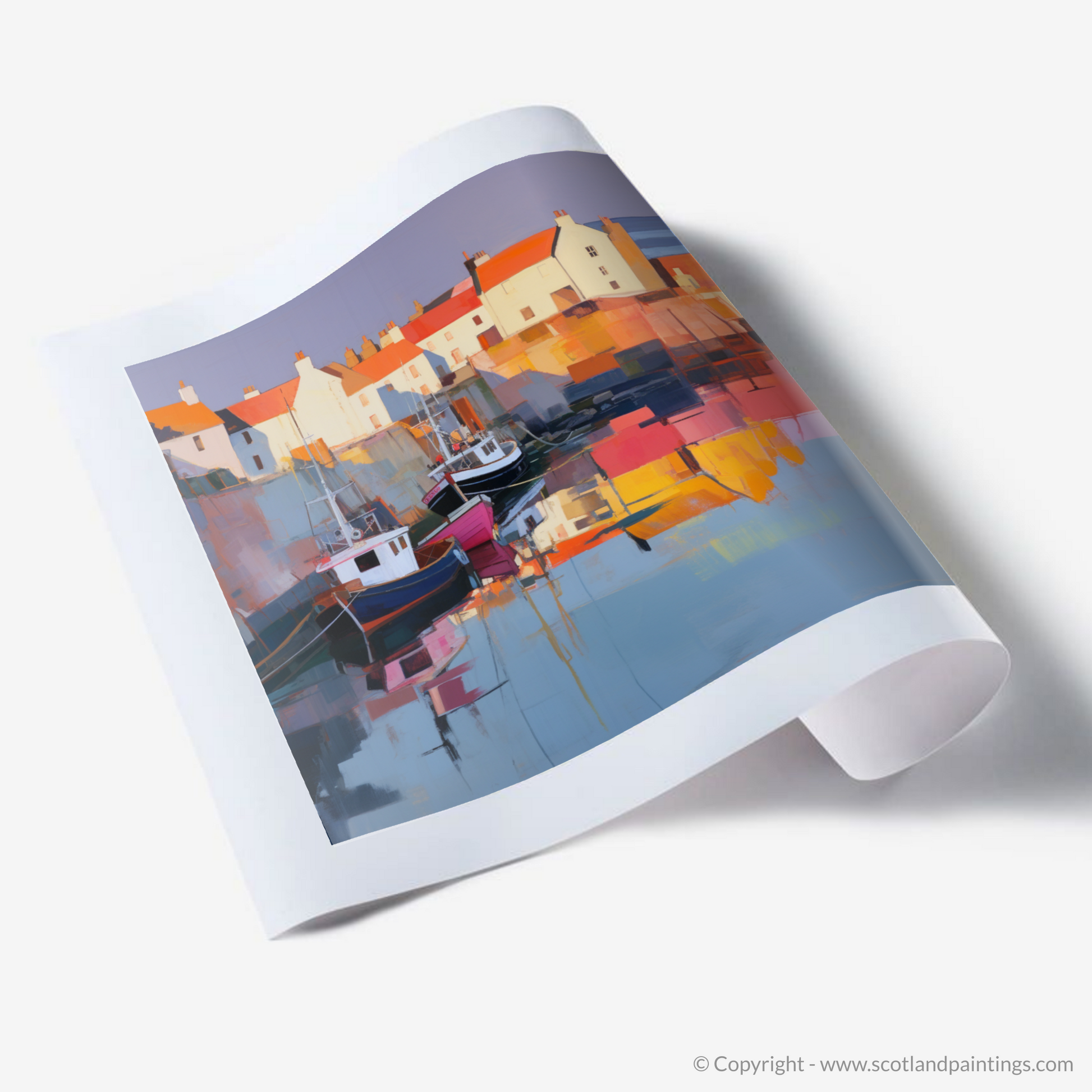 Immerse yourself in the tranquil beauty of Pittenweem Harbour at dusk, captured exquisitely in this evocative contemporary print. As the day's last light casts a warm glow, the charming harbour comes alive with an array of vivid hues reflecting off the serene water.