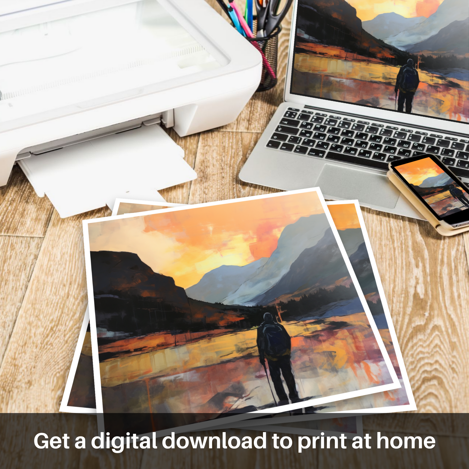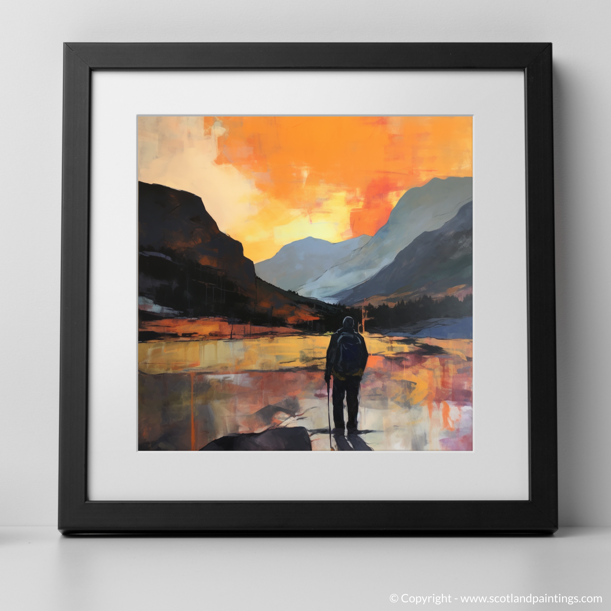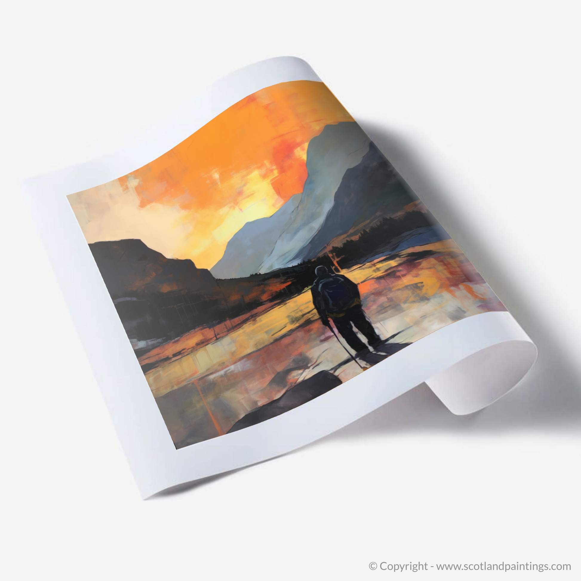 Embrace the allure of nature's grandeur with this evocative print, a piece that encapsulates the essence of Abstract Impressionism, soulfully interpreted through the arresting visuals of a hiker witnessed amidst the serene splendour of a Glencoe sunset.